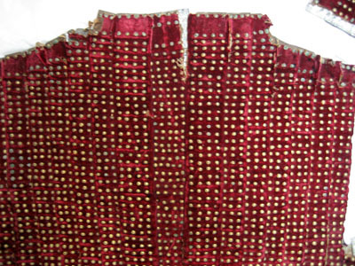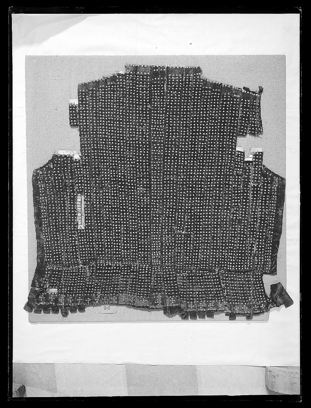 Ryggstycke av stålplattor klädda med röd sammet. Rektangulära klippta plattor av stålplåt, ca 33 x 22 mm. Fästade i varandra omlott i vertikala rader. I var platta två rader med i varje fyra mässingsnitar med runda kullriga skallar. Plattorna var ursprungligen fästade på en gulaktig grov linnelärft. Delar av denna återstår på mindre partier. Sammeten ligger tätt mot plattorna och nitarnas rader av skallar utgör dekoration. Sammeten har vikt kant efter varje rad plattor och skapar vertikala långsmala fält. Längs jackans nederkant en bård, lambrequin, av mindre rektangulära flikar.
