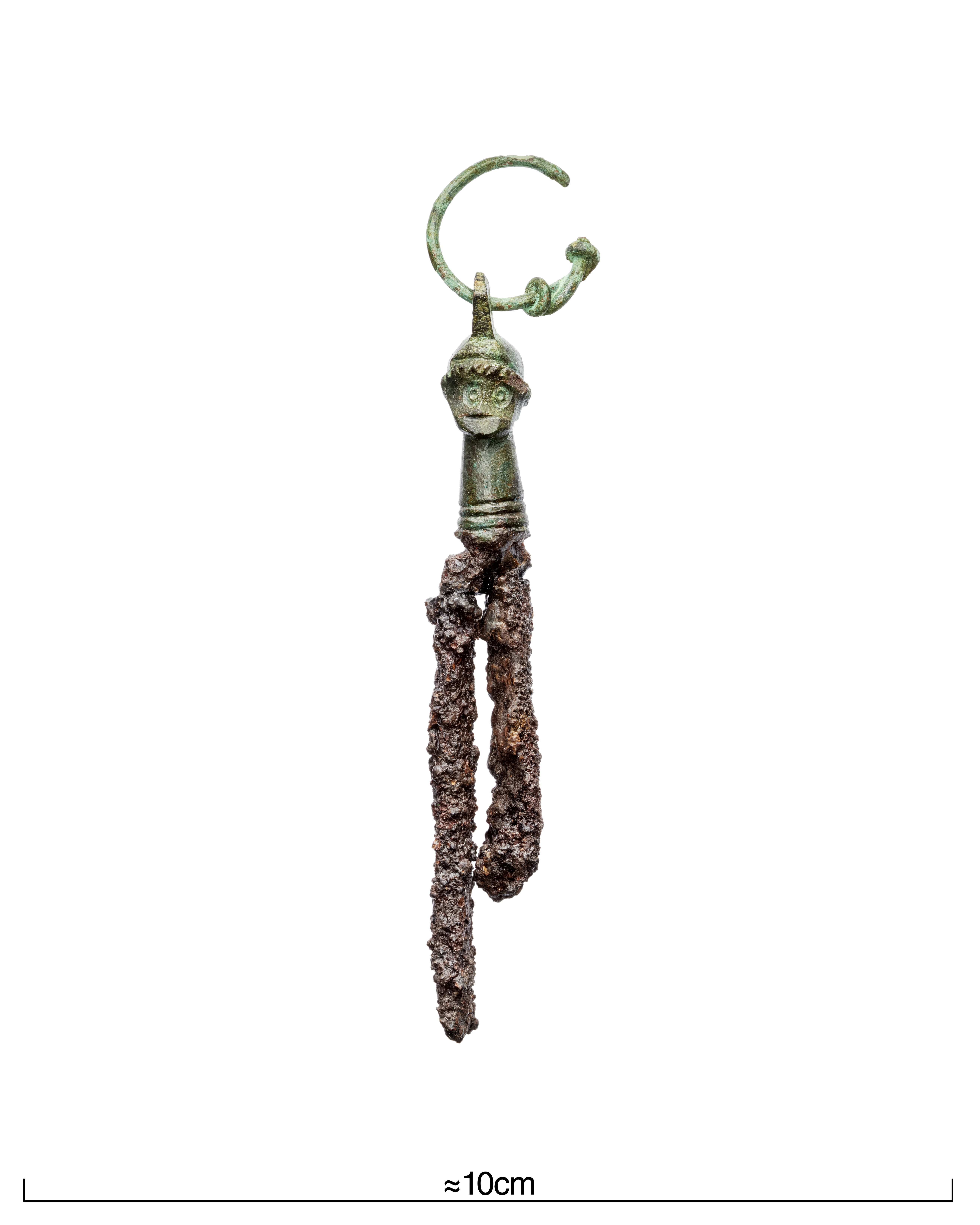 Sönderfallen pincett med överfångsgjutet antropomorft huvud, bärring av bronstråd sam tvidsittande mineraliserad textil (tuskaft).