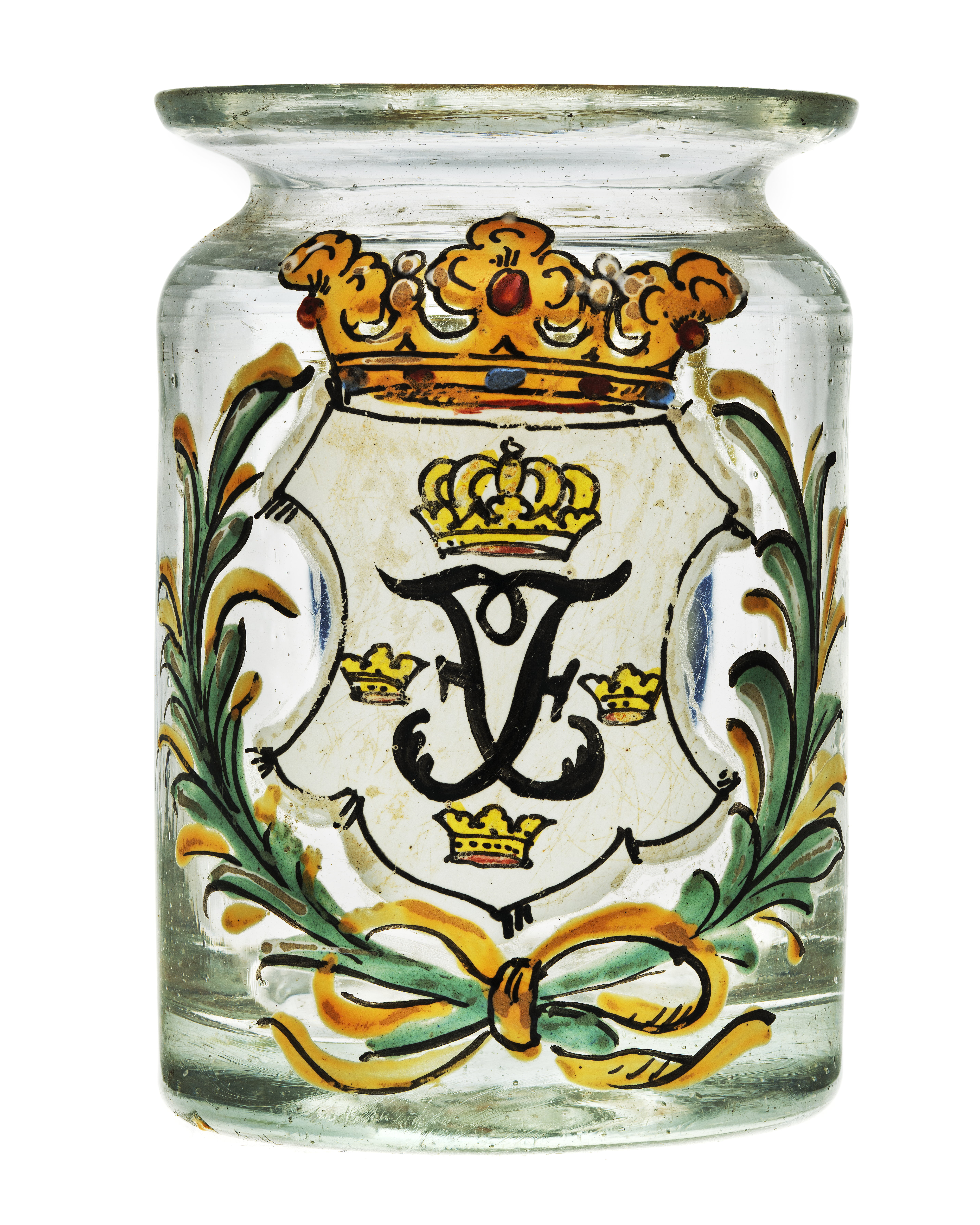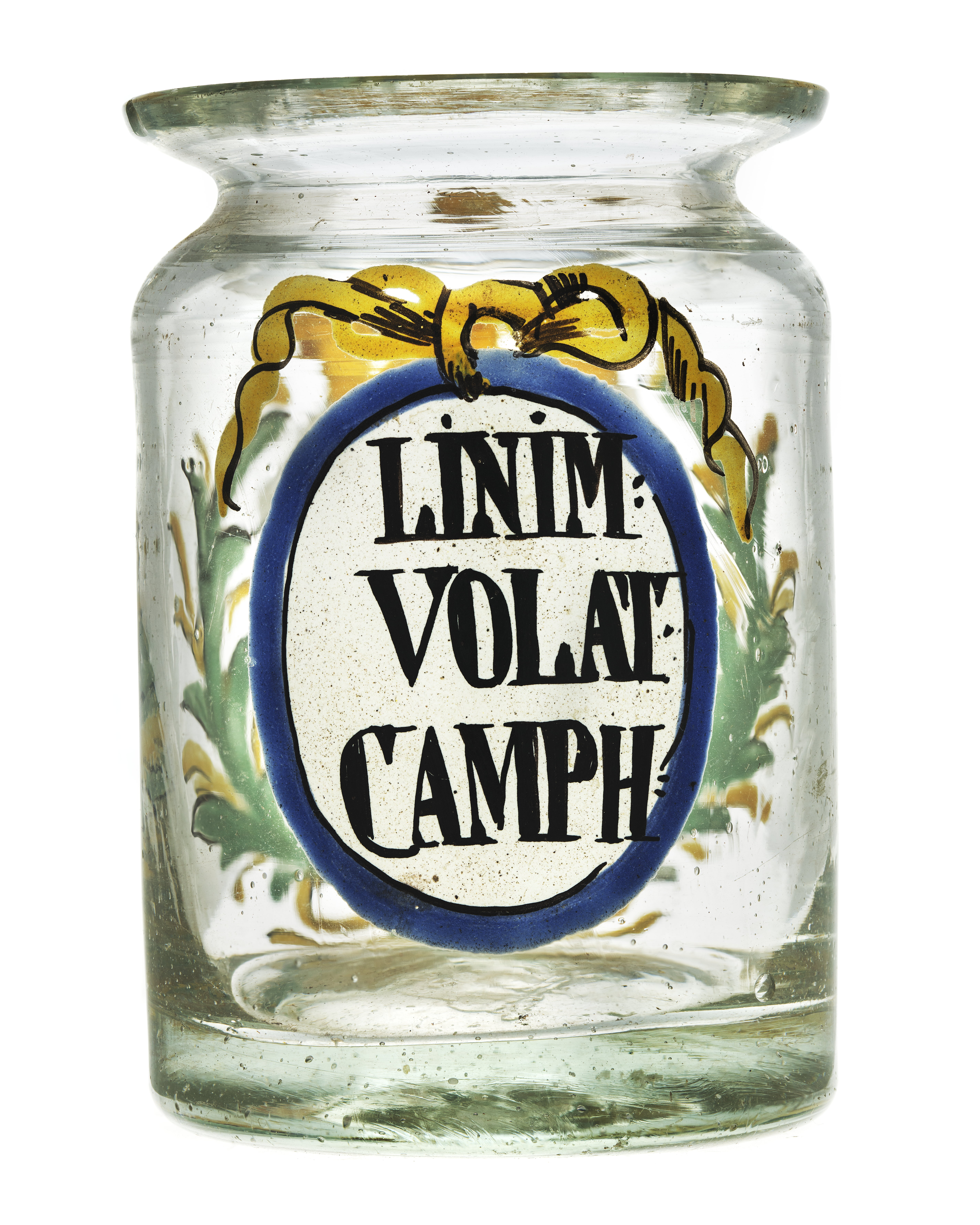 Tillhört Fredrik I, Sverige 1720-1751. Rund glasburk, svagt vidgad uppåt med något smalare hals med utsvängd kant för överbindning. Dekor i emaljmålning, på ena sidan en vit sköld, krönt av öppen krona i gult och rött, i skölden Fredrik I:s namnchiffer, spegelmonogram F (svart) krönt av en kunglig krona och omgivet av de tre svenska kronorna, allt i guld. Runt skölden en lagerkrans i grönt och guld. På motsatt sida en vit textoval med blå kant, upptill prydd med en gul rosett. I ovalen svart, latinsk text: "LINIM: VOLAT:CAMPH" (blandning av ammoniak och olivolja, proportioner 1:3, med tillsats av kamfer).
