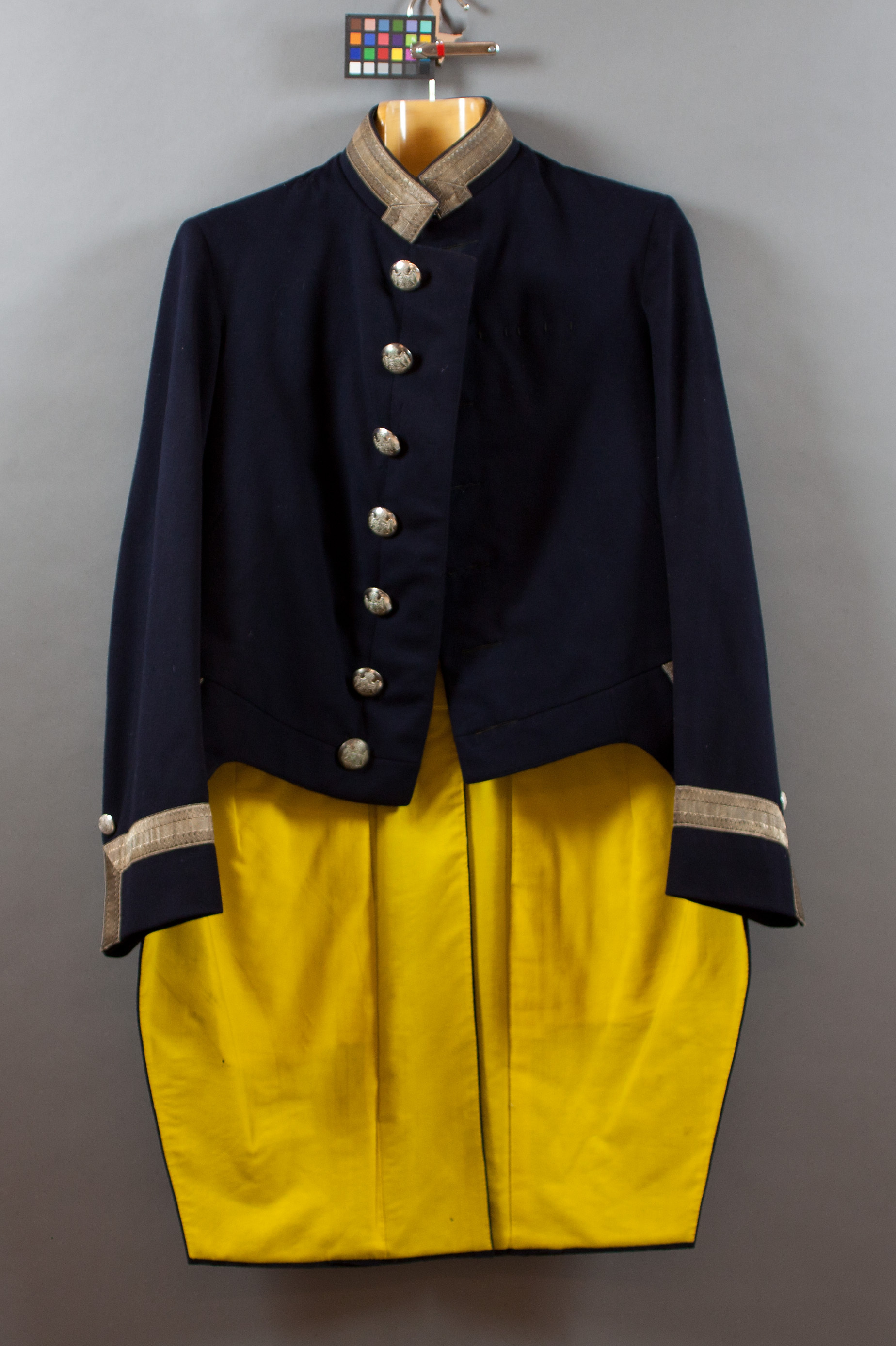 Frack av mörkblått kläde med ståndkrage och enkelradig knäppning. Sju knappar d: 30 mm av silver med stora svenska riksvapnet. På insidan firmanamn: C. C. SPORRONG & CO STOCKHOLM ". Nedtill på ärmarna35 mm breda silvergaloner samt en knapp d: 19 mm. På vänster framstycke fem tränsar för bröstdekorationer. Delat skört med två ficklock kantade med galoner. Mellan galonerna ytterligare galoner lagda i tre sammanfallande romber och med två stora silver knappar. Foder av gult ylle med matelasserat liv med en påsydd innerficka. I ärmarna vit satin med smala grå ränder.