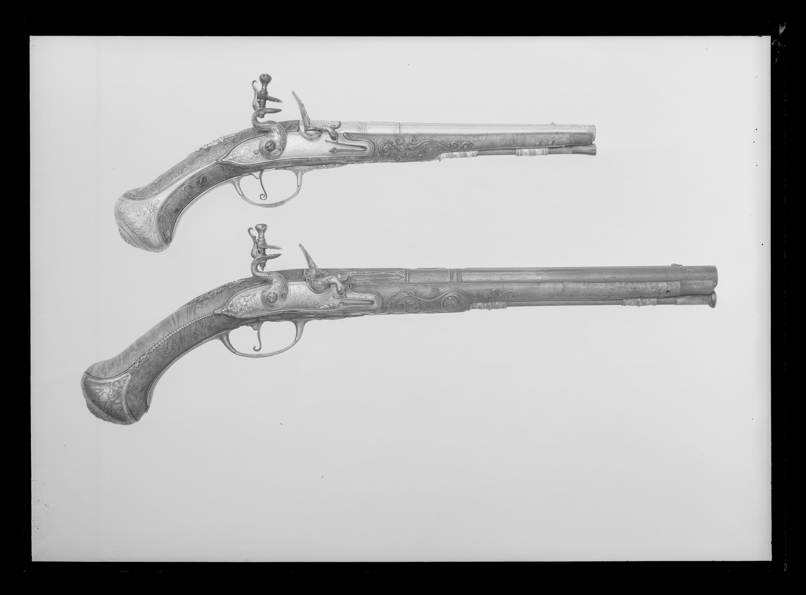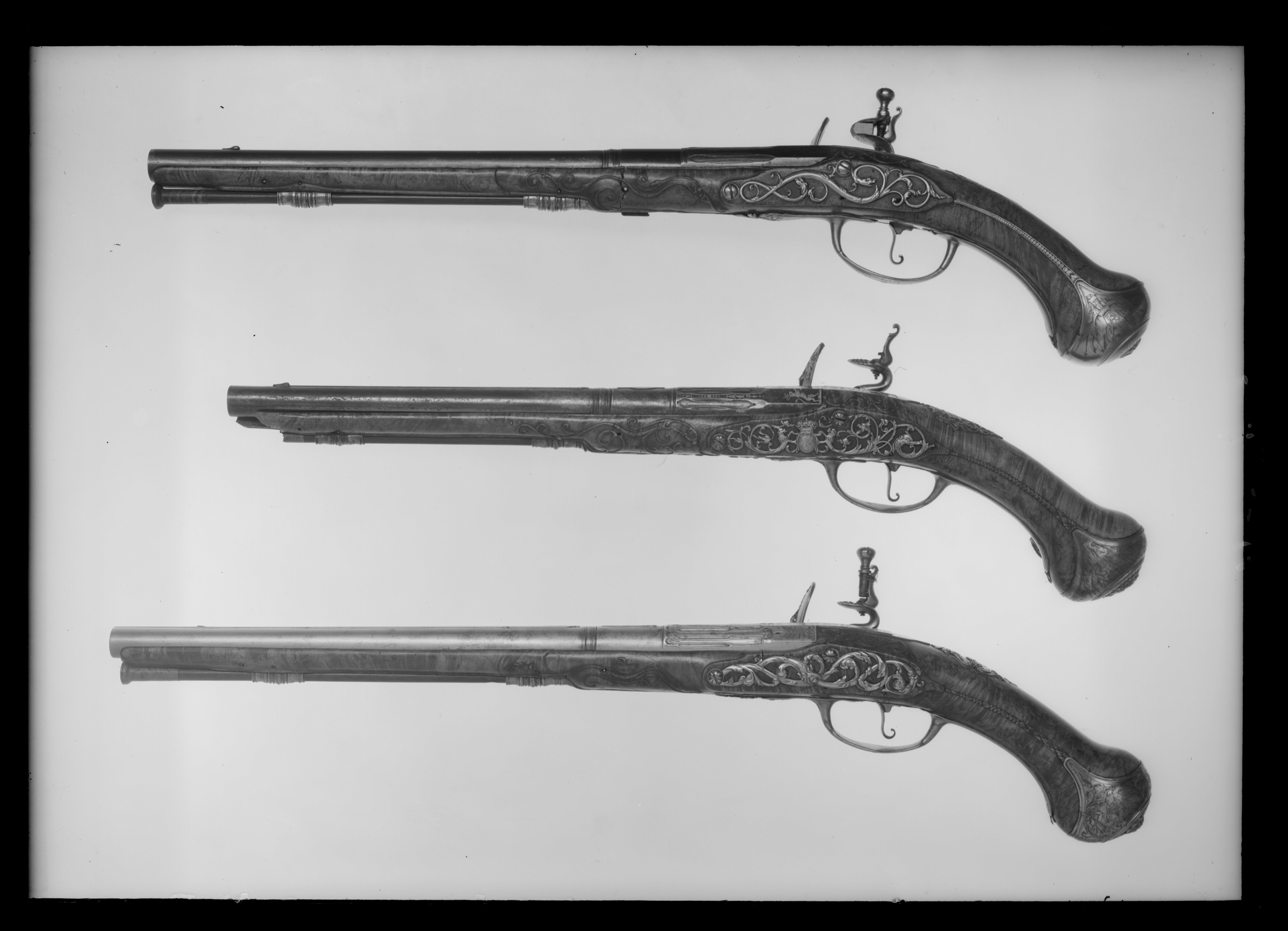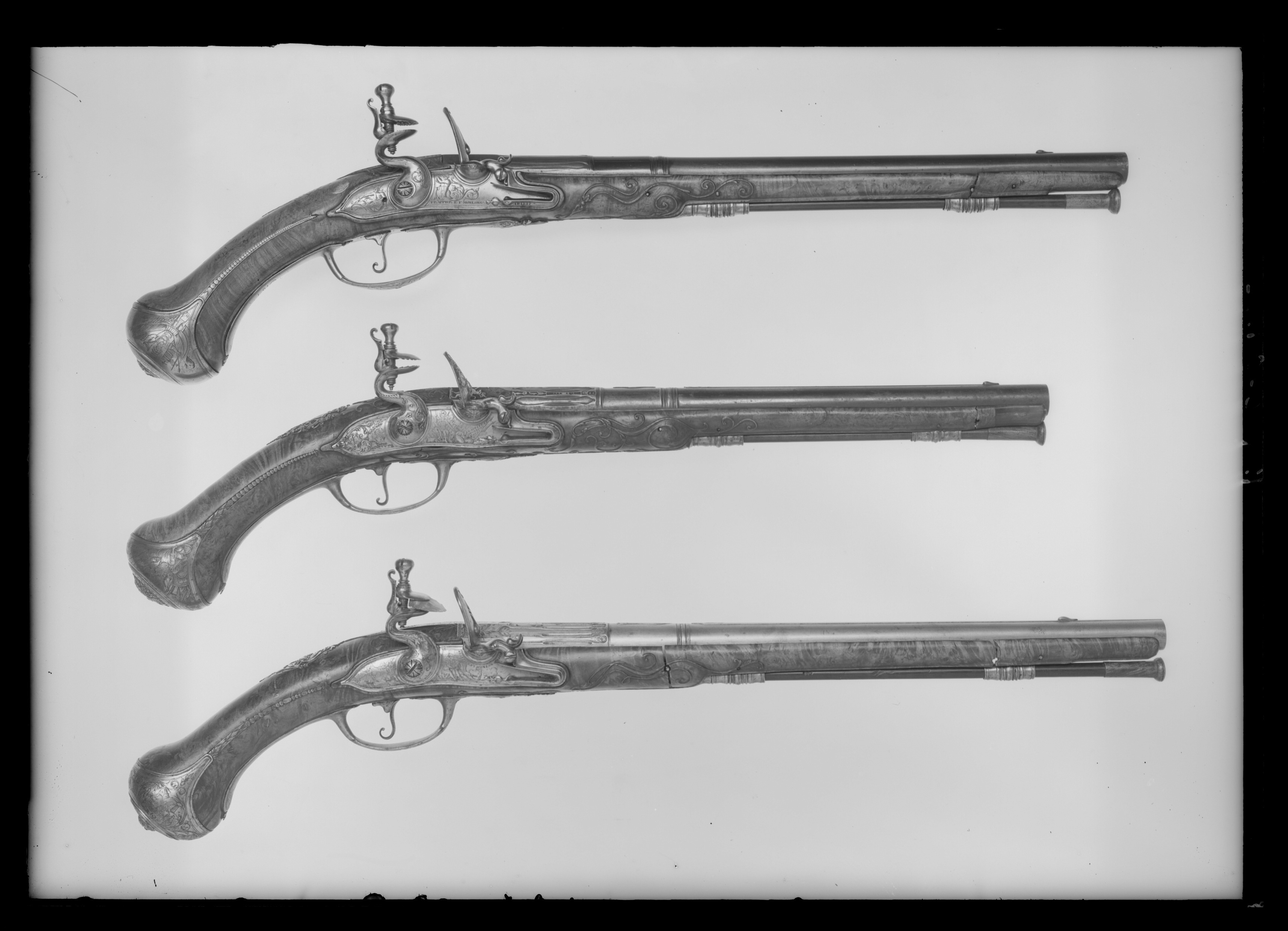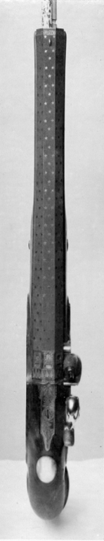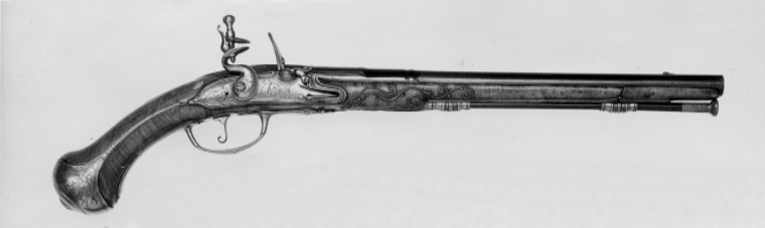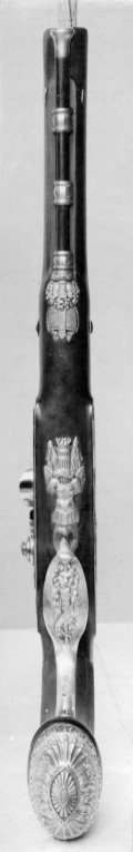 Rund, vid kammaren åttsidig, slätborrad pipa av blånerat stål, blåneringen delvis bortsliten. På kammarens undersida stämpel: M. Vid pipbasen på de tre övre faserna inlagt med guld ett svenskt riksvapen, Pfalz-dynastien, krönt av kunglig krona, sköldhållare lejon. Kanterna därframför avtagna, konturerade, fält, guldinläggningar av linjer, punkter och växtrankor. På pipan därframför ett runt parti, omgivet av svarvade ringar, på ovansidan en bladformig låg klack med guldinläggningar, linjer och blad. Därframför en 179 mm lång, framåt avsmalnande ribba, baktill avslutad med ett snidat drakhuvud, framtill av kornet. Svagt böjt, rektangulärt oblånerat svansskruvblad. Graverad kantbård av sick-sacklinjer och blomranka. Rikmedel: Spolformigt korn av silver. Fästning: Två häften, pipan fäst med krysskruv, bakre låsskruven genom hål i svansskruvplattan samt ett pipstift av stål (det främre saknas). Flintlås med välvt låsbleck, l: 126 mm, svängda kanter och smal kantlist. På bakspetsen rankdekor i stålsnitt, för övrigt graverad dekor, bakom hanen en kvinnobyst med örnvingar, plymagerad hatt. Framför hanen graverad dekor, man i antik rustning, sittande bland trofeer, på en fana graverad signatur: "FRAPPIER ET // MON-LONG // A PARIS". S-formig, välvd hane med rankdekor i stålsnitt, hanskruv med blomformigt graverat, välvt huvud. Runda käkar, överkäken lös, rundad hangren med inrullad ände, käkskruv med päronformigt huvud. Rundad fängpanna med smal fals, rankdekor i stålsnitt vid överkanten. Batteri, välvt fängpannelock och eldstål med välvd rygg., rankdekor i stålsnitt på lock och eldstål, komma-formig häl, batterifjäder med långt, flikigt fjäderlöv. Fästning: Två lås-skruvar med blomformigt graverade huvuden. Avtryckare med upprullad ände. Konturerat avtryckarbleck med graverad bladranka. Helstock av valnötsrot med snidad rankdekor vid svansskruvblad samt mellan varbygelns framände och spetsrörkan. Näsband av horn, övriga beslag av stål. Kolvkappa med långa, flikar, på flikarna graverade blad- och pärlstavar. På kolvkappans sidor graverad dekor i form av trofegrupp samt på ena sidan en sittande man i antik rustning , på andra sidan en sittande man i antik. rustning, blåsande trumpet. Oval, välvd centrumplatta med i stålsnitt grotesk mask i lejonhuva, omgiven av bladstav, samt graverade blad- och sicksackringar. Tumplåt i stålsnitt, genombrutet arbete, kartusch med oval, sköld med graverat spegelmonogram C, skölden krönt av kunglig krona, sköldhållare lejon. Sidbleck i form av genombrutet rankverk i stålsnitt med oval mittkartusch med graverat spegelmonogram C, kartuschen krönt av kunglig krona, sköldhållare två lejon, övergående i rankverket. En + en kraftigt profilerad rörka, slät, smal spets med graverad pärlstav. Varbygel med välvd, konturerad främre arm utdragen på båda sidor av stolpen, i båda ändar avslutad med blad, det främre i form av fransk lilja, rankdekor i stålsnitt. Rombisk bygel med kantlister och graverad rankdekor, lång, välvd bakre arm med avslutning i form av blad i båda ändar, graverade kantlinjer samt blad på bakänden.
