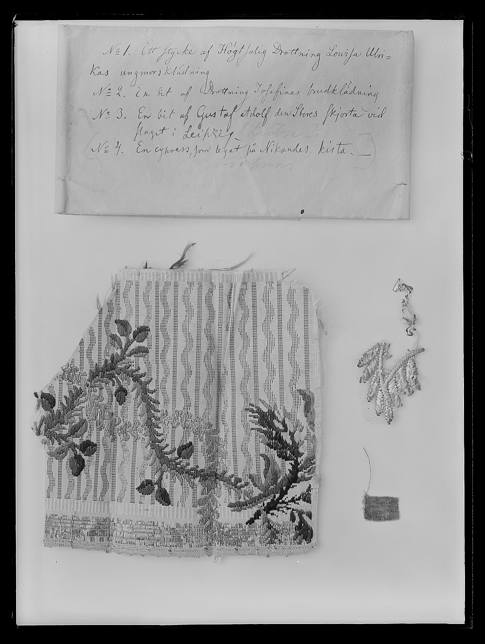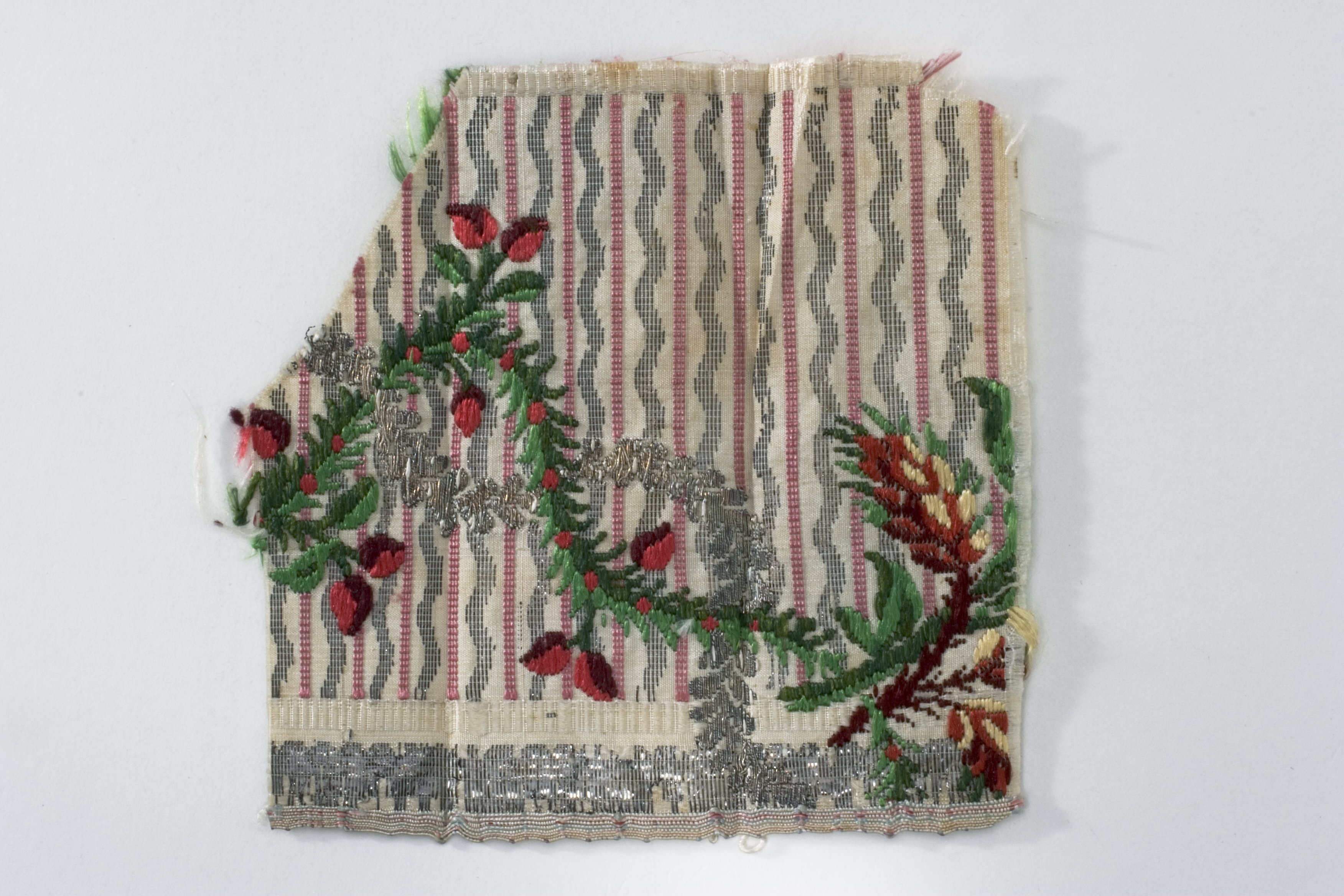 Vitt sidentyg med invävda lodräta ränder. Varannan rand rak, b: 1,5 mm av rosa silketråd och varannan vågformig, b: 2 mm av silvertråd. Brocherat girlangmönster bestående av bladslinga i två gröna nyanser med spridda röda bär och blad, också i två nyanser. I högra hörnet kvist med frukt i rött, gult och grönt, allt av silketråd. Girlangen genomskärs på tre ställen av slinga av brocherad silketråd. Nedtillen 4 mm bred stadkant av gula, ljusblå och röda trådar.