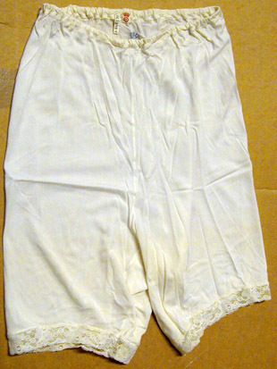Benkläder av byxmodell med ben av vitt konstsilkecharmense. I midjan rynkad med genomdragetgummmiband. Nedtill på byxbenen 30 mm bred genombruten elastisk spets med invävdagummitrådar. I grenen infälld våd. I sömmen mitt bak kvadratisk lapp med rött "S" nedanförhertigkrona samt etikett: "Peane-Lyx 42".