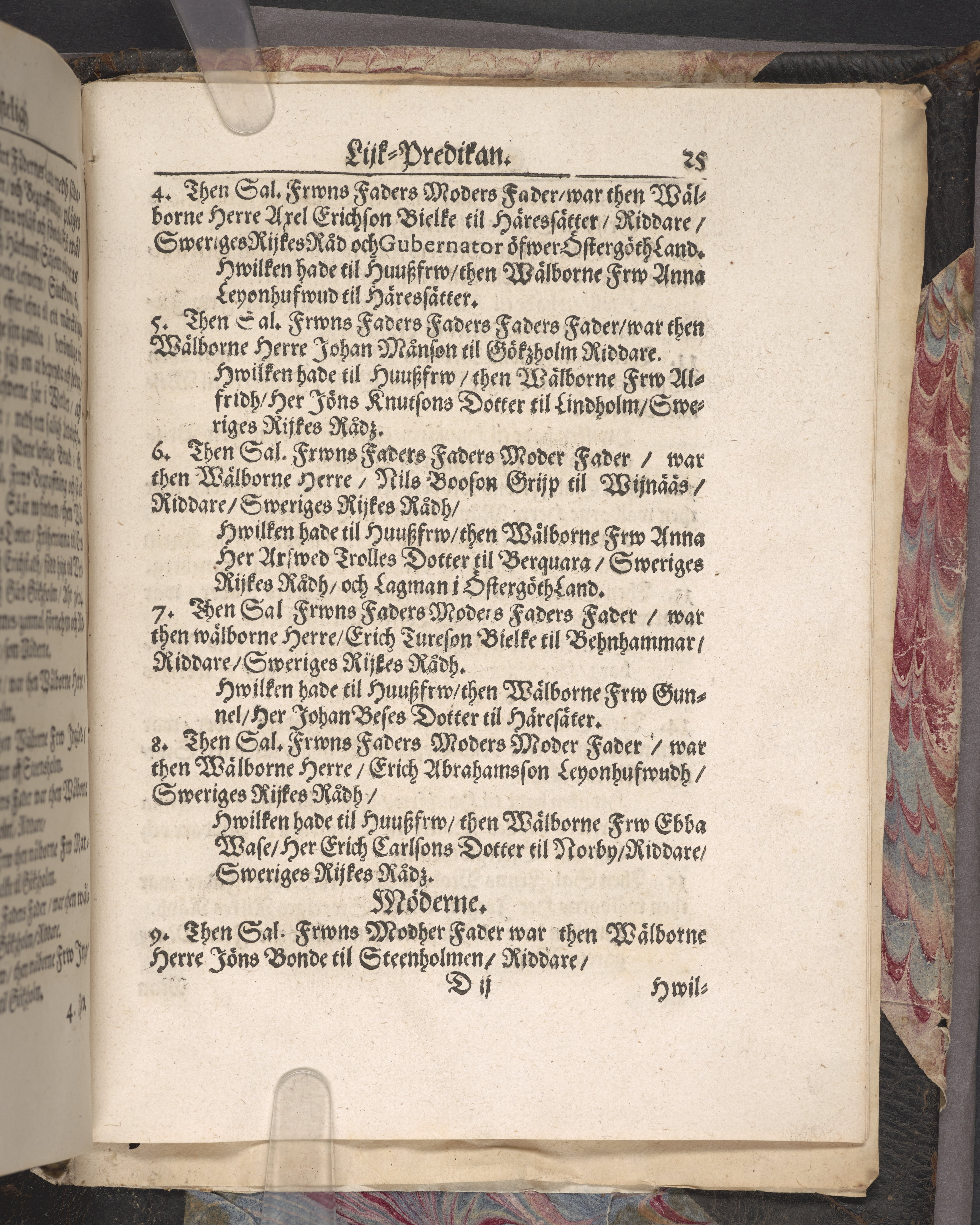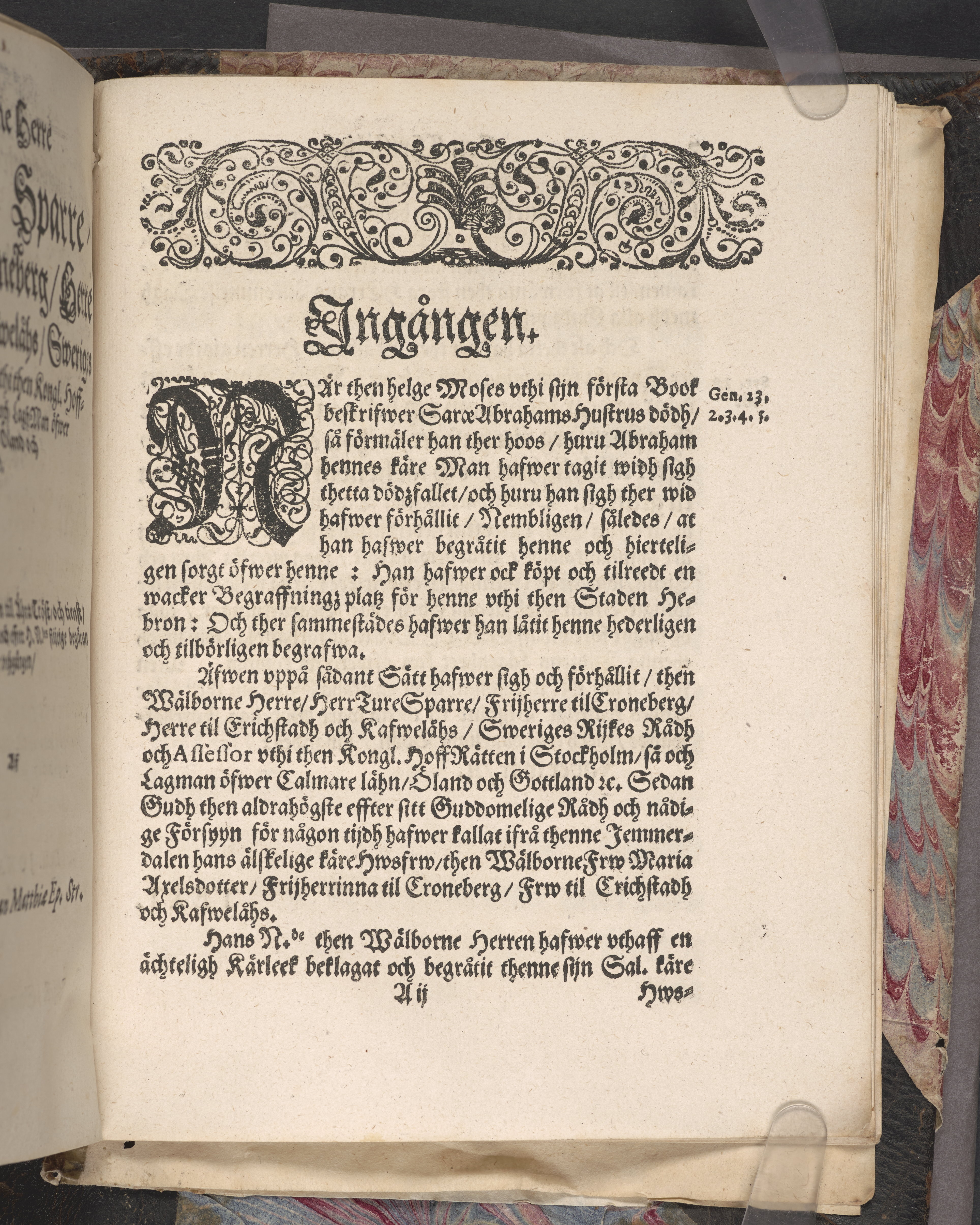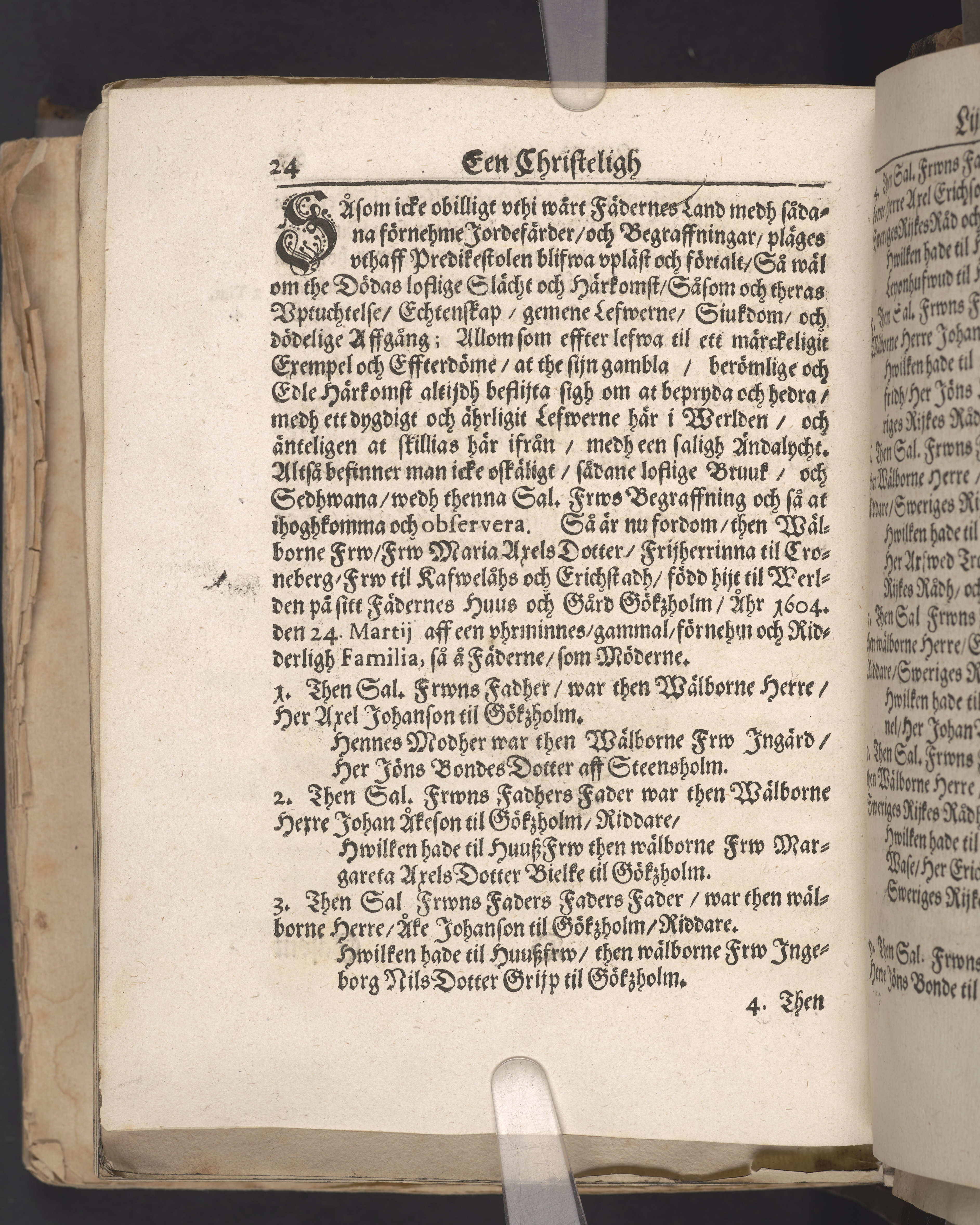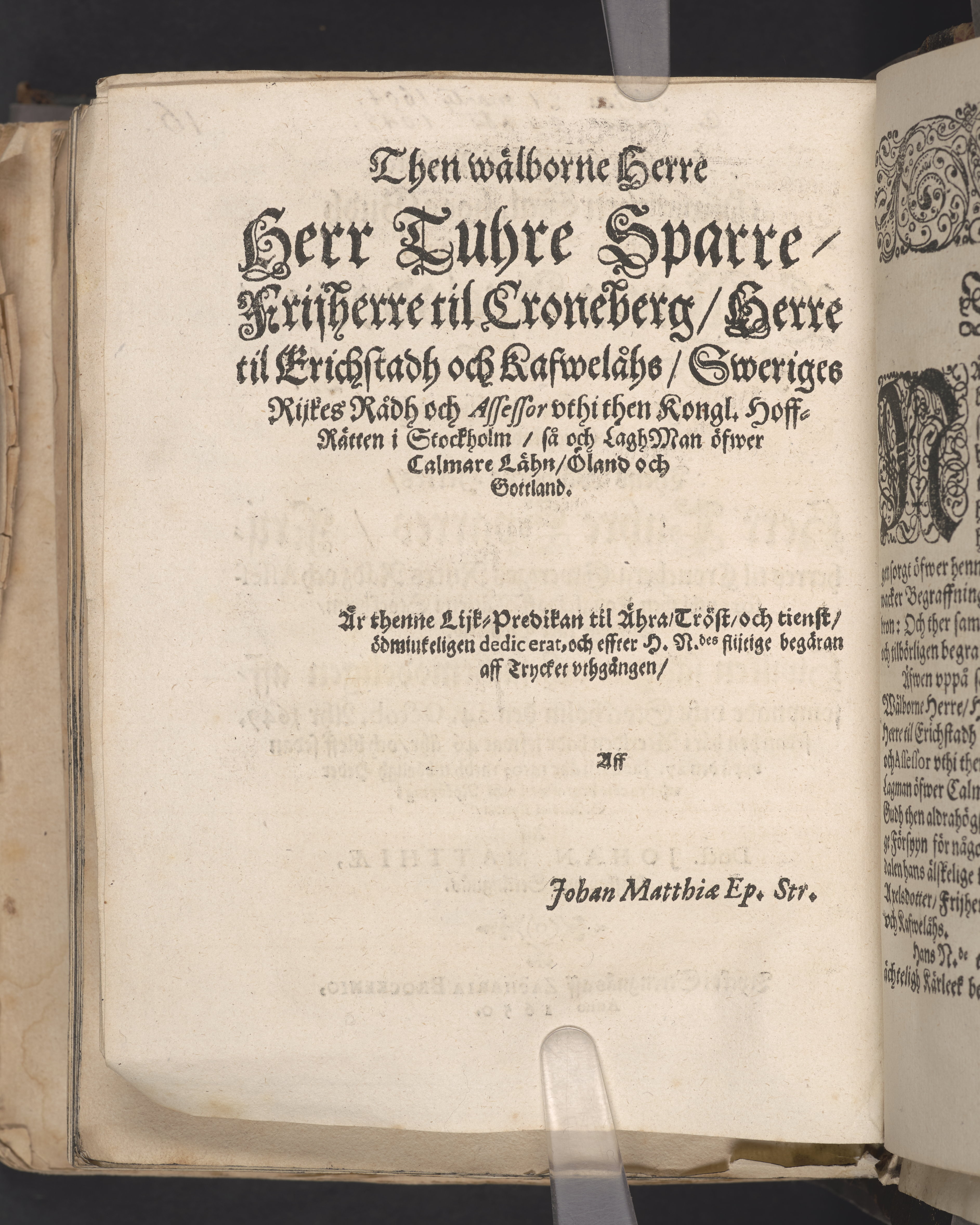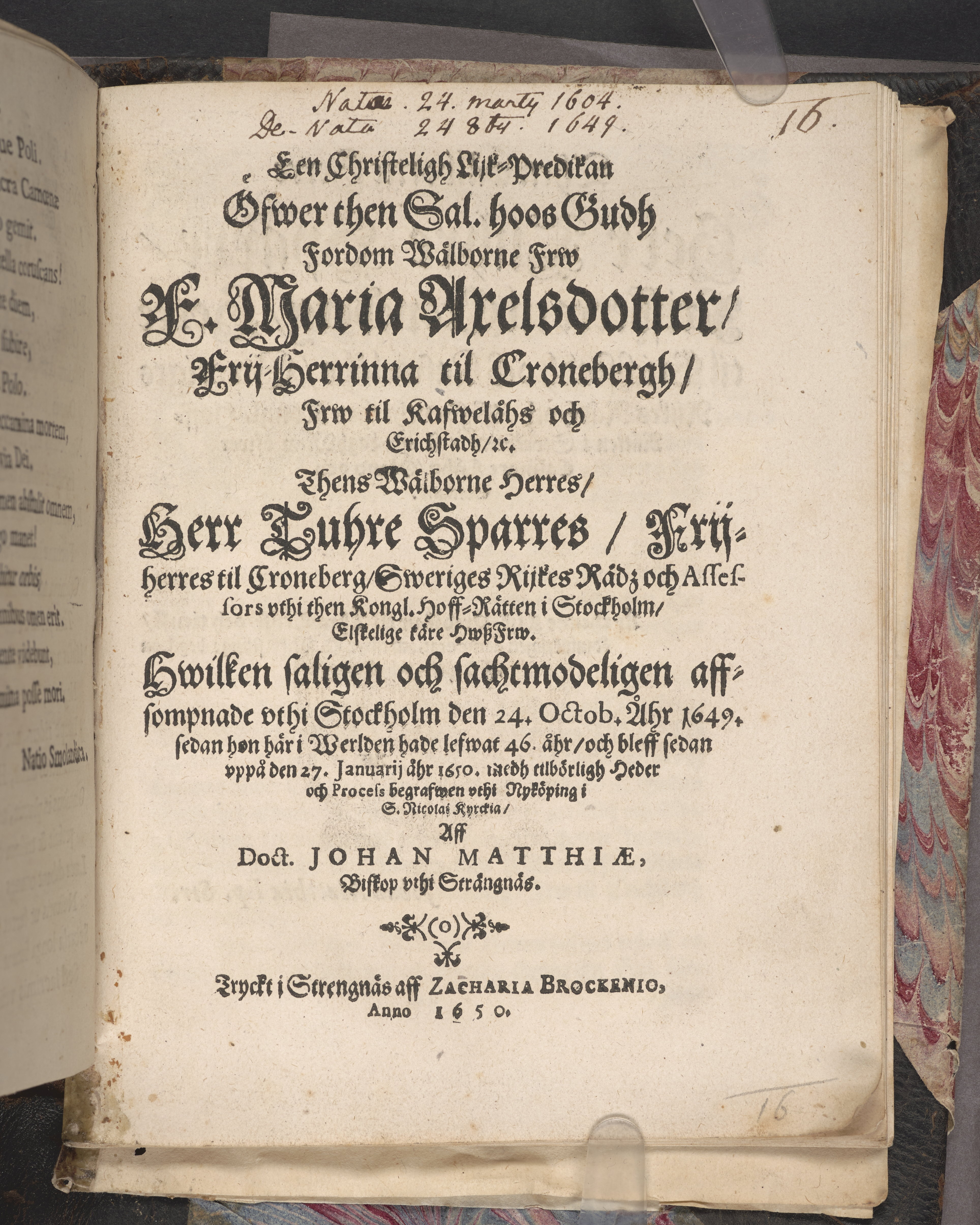 Een christeligh lijk-predikan öfwer then sal. hoos Gudh fordom wälborne frw F. Maria Axelsdotter, frij-herrinna til Croneberg, frw til Rafwelåhs och Erichstadh, etc. Thens wälborne herres, Herr Thure Sparres, frijherres til Croneberg ... hwszfrw. Hwilken saligen och sachtmodeligen affsompnade vthi Stockholm den 24. octob. åhr 1649. sedan hon häri werlden hade lefwat 46. åhr, och bleff sedan vppå den 27. januarij åhr 1650. medh tilbörligh heder och process begrafwen vthi Nyköping i S. Nicolai kyrckia, aff doct. Johan Matthiæ, biskop i Strängnäs. Tryckt i Strengnäs aff Zacharia Brockenio, anno 1650.