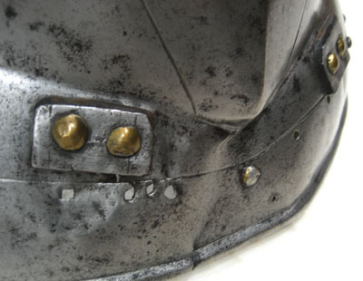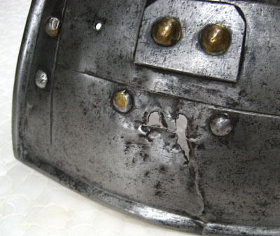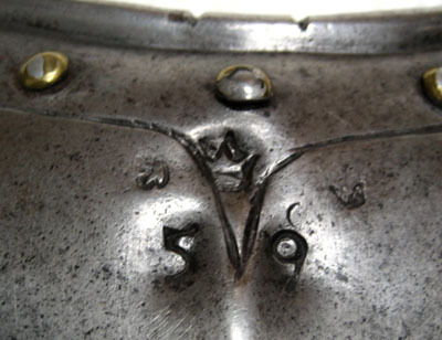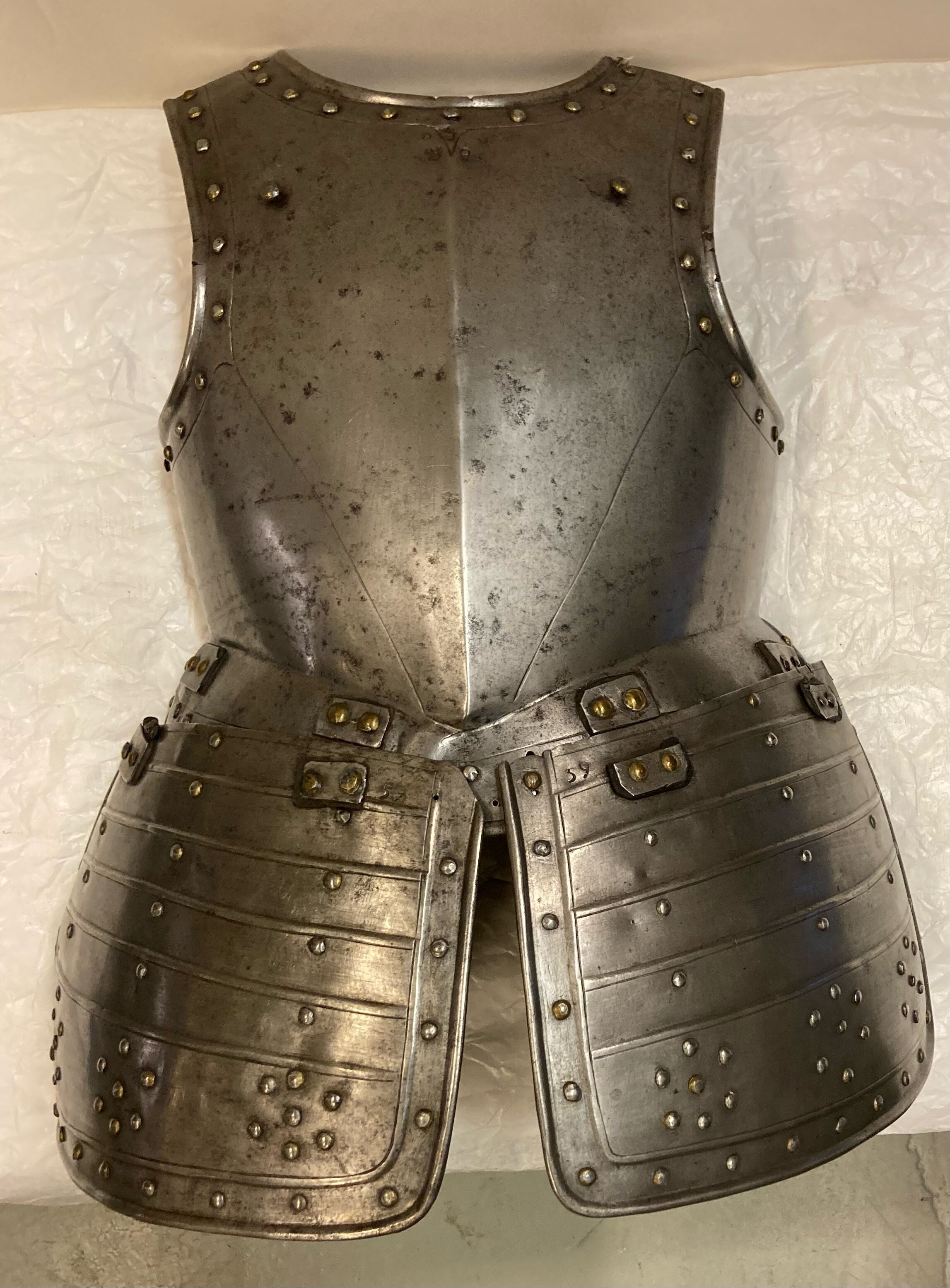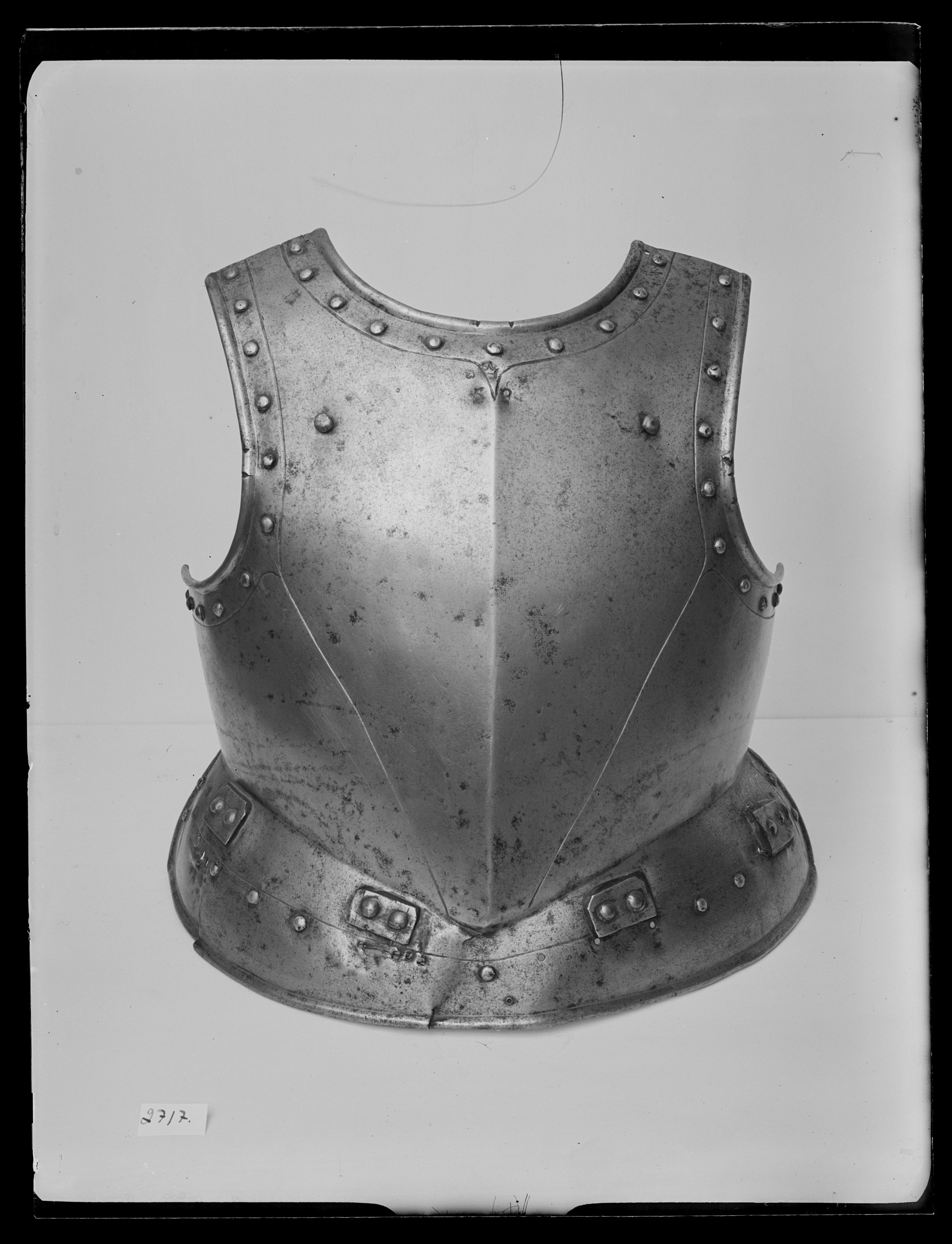 Driven stålplåt i ett stycke, slipad och blankpolerad med mässingsklädda nitar. Insidan med svartbrun anlöpning och rester av läderband under nitarnas brickor. Plåtens tjocklek i kanterna 1,5 mm. Rundade urtagningar för hals och armar med omvikt rundsmidd kant. På var sida bröstet en utstående nit, diam 10 mm. Tämligen spetsig mittås med början 40 mm från kanten och nedåt, avslutad nertill i kort spets. Insvängd bredare midja med driven något välvt skört, B i kanten 93 mm. På var sida två rektangulära plåtbitar (för tassetterna), L ca 38 mm, med tillklippta kanter, fäst med två nitar var. Under dessa rester av läderband. Runt hals- och armöppningar en skuren linje, i mitten utdragen i en spets. Från armhålornas spets en snett nedåtriktad linje avslutad vid kragens början. Vid halsens spets två stämplar varav en trearmad öppen krona, mellandessa en större krona och därunder siffrorna 5 9. Nitar i rad runt hals- och armöppningar, mitt över kragen och två i dess sidor. Nitarna med välvda med ursprungligen mässingsöverdragna skallar. Två punsade/filade hack i hals- och armöppningarnas mitt.