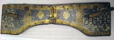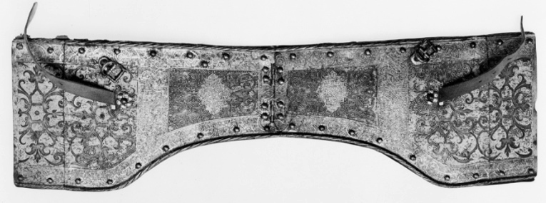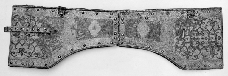bringbetäckning med en drifven rund uphöjning på hvardera sidan samt 4 söljor af förgyldt jern,