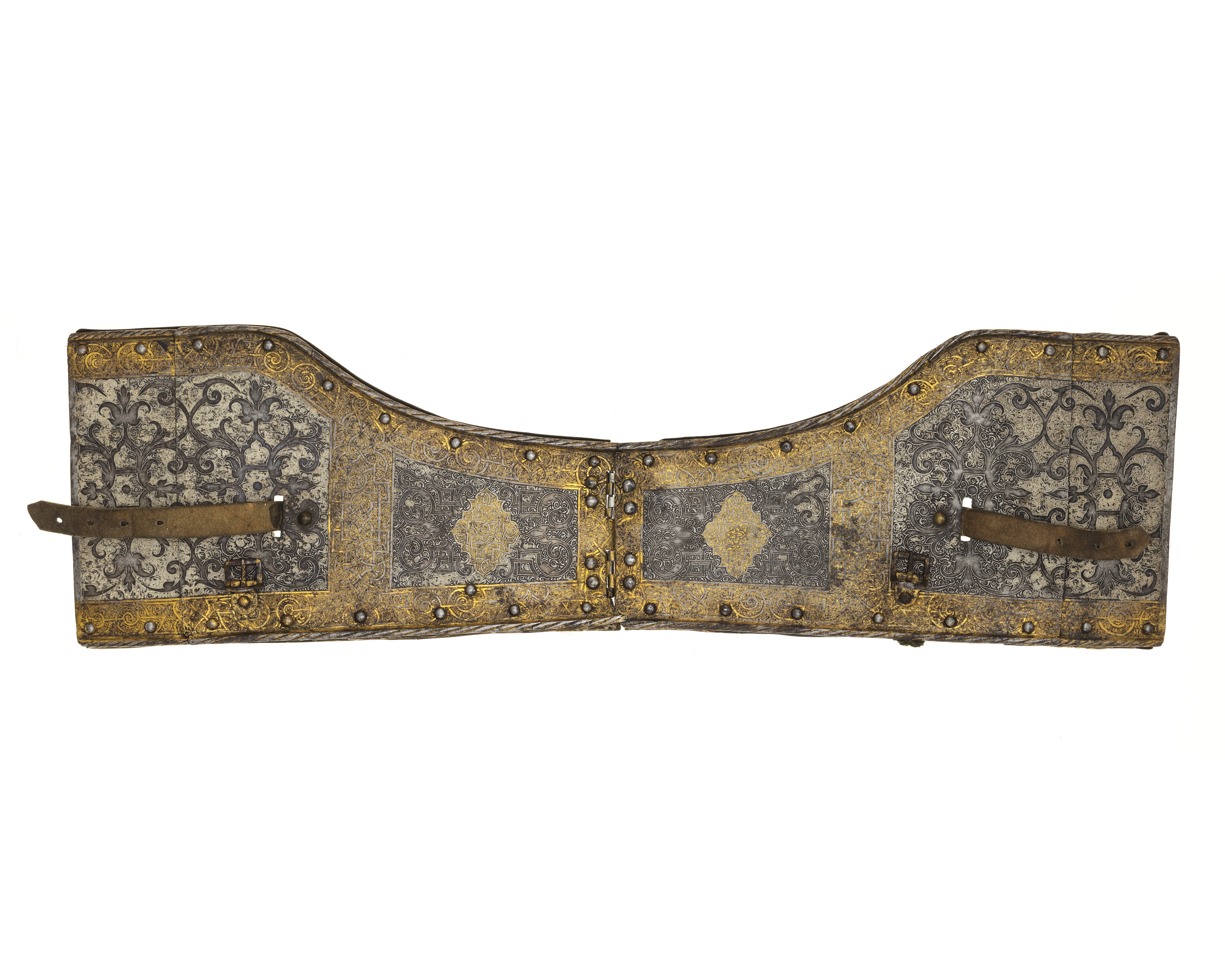 - Christian II:s hästrustning af jern med vridna bundtar, helt och hållet etsad i ornamenter, dels förgylld och dels belagd med en hvit massa - nitar af jern med knappformiga hufvuden, rustningen består af:
