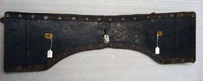 2:ne tyglar hvardera i 4 delar, sammanhållna med gångjern, på hvarje tygel finnes 2:ne söljor och en med svart sammet öfverklädd spännrem, hvilken är försedd med en ciselerad tamp och ett spännhål med skoning - gångjernet på ena tygeln bristfälligt.