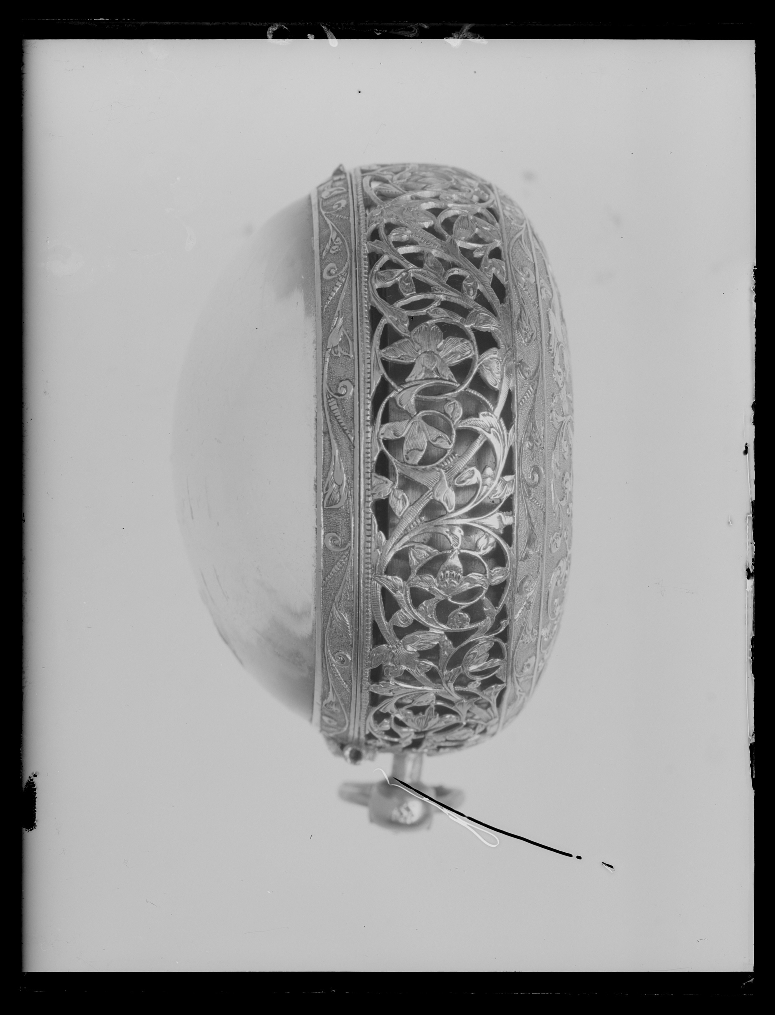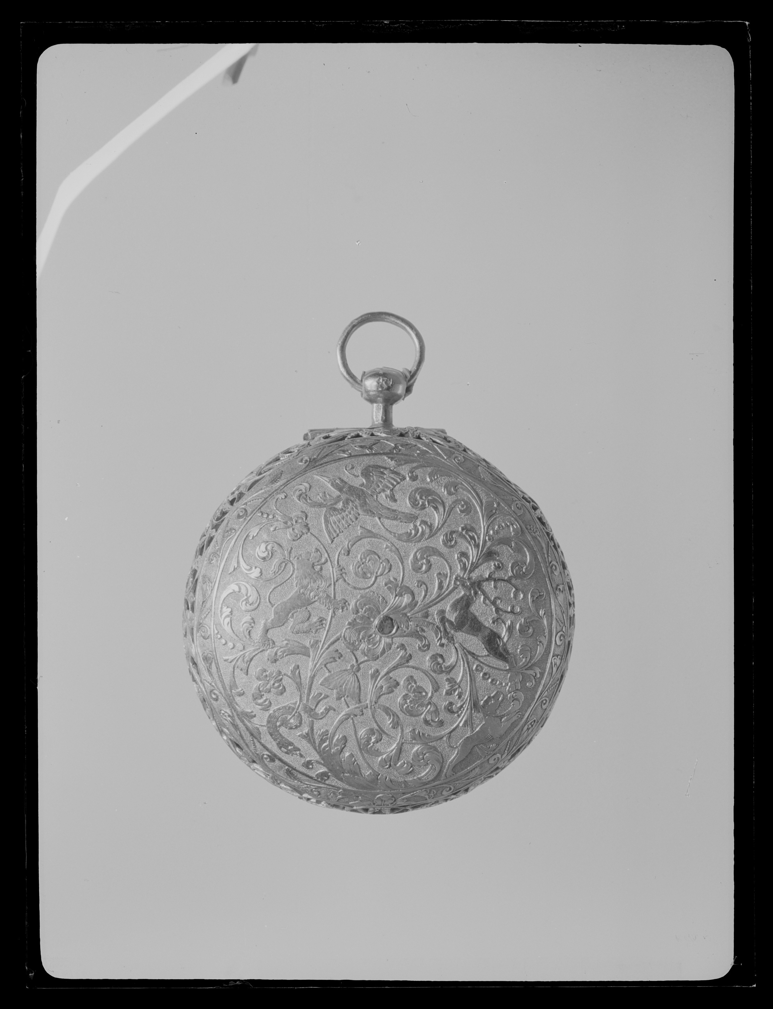 Rund boett av guld med genombrutna sidor, graverade blomsterslingor. På undersidan graverat blomsterslingor, lejon, fågel, hjort, hund och insekt. Tättslutande, kupigt lock av glas med smal fattning av guld med graverade blomsterslingor, fäst med gångjärn i överkanten. Urets klangskål av stål, fastskruvad inuti boetten. Vid gångjärnet en rund bärring, fäst i kulformig ring på kort skaft, otydliga stämplar.