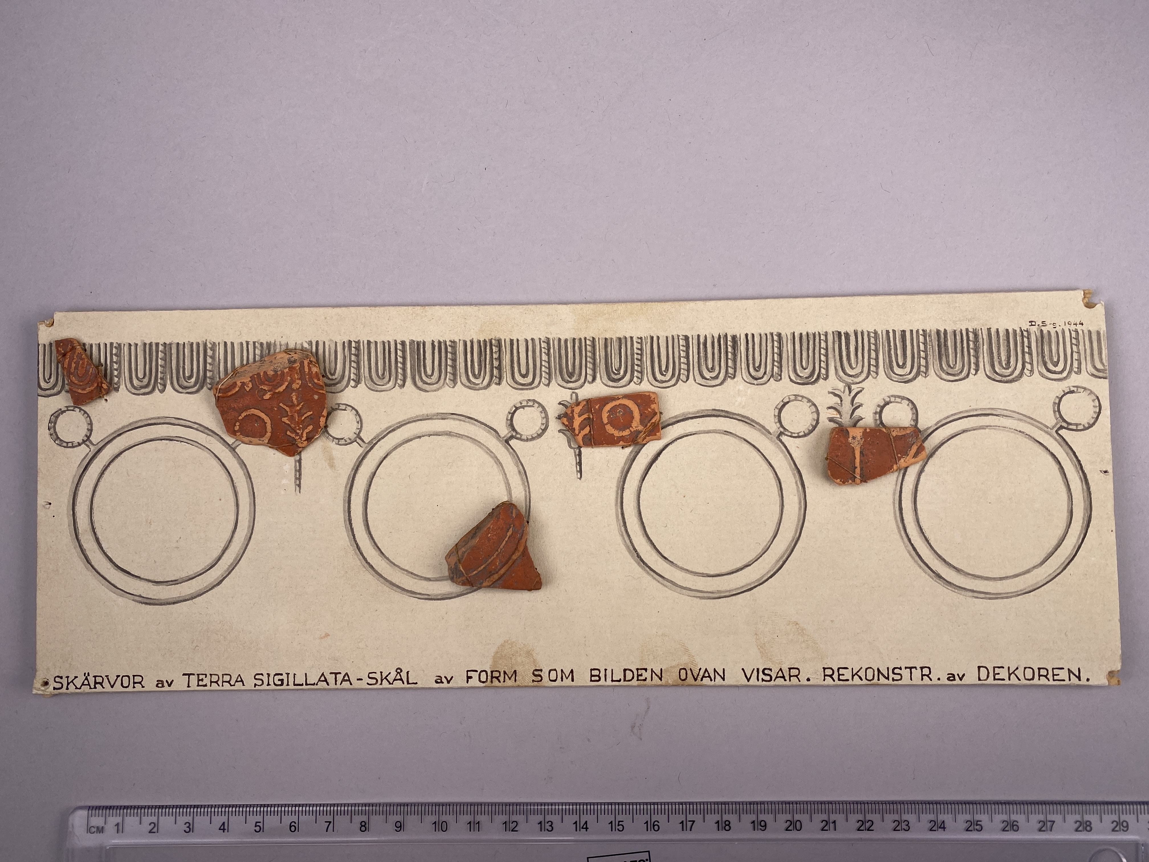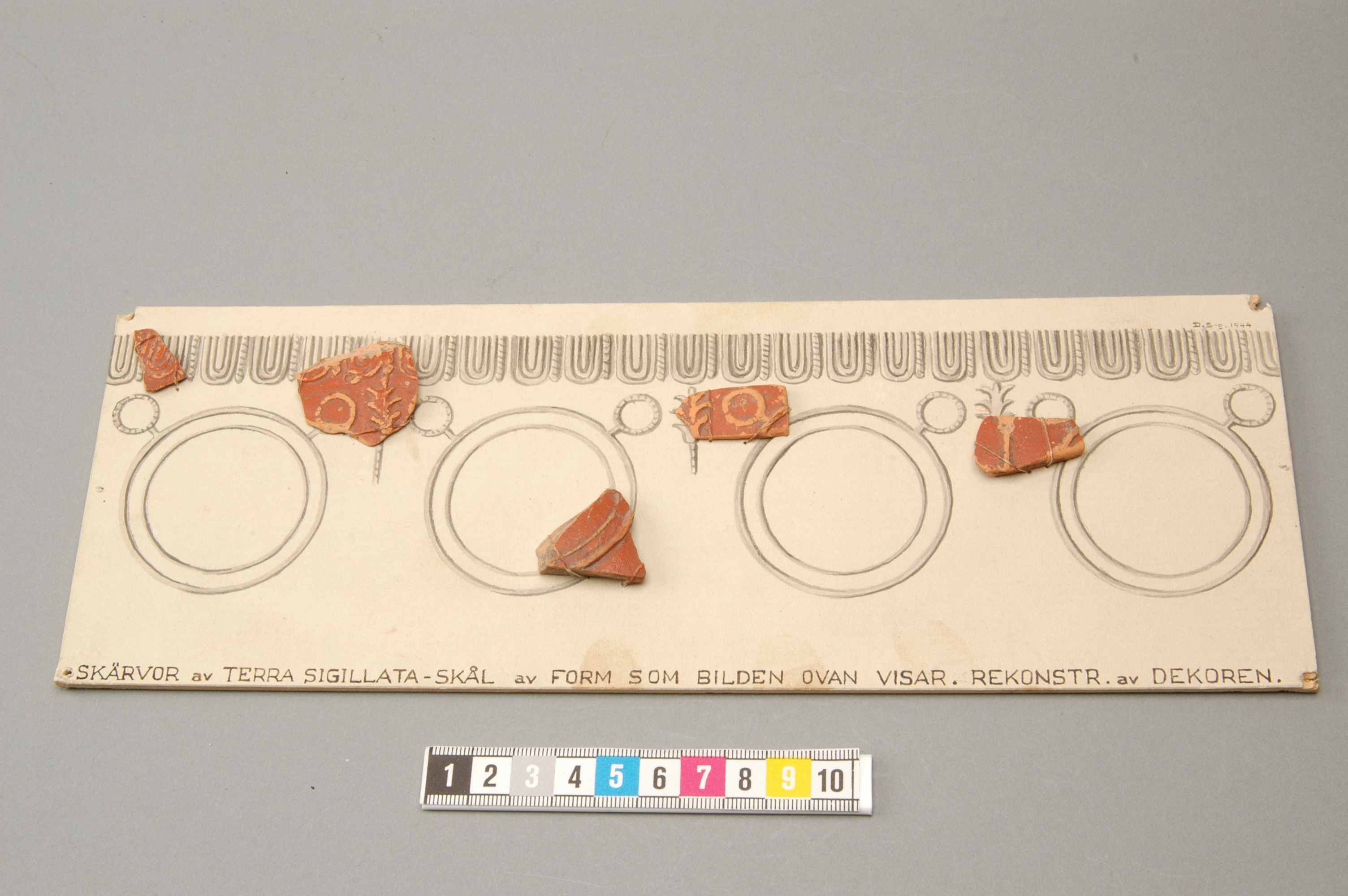 Fem skärvor av terra sigillatakeramik med dekor av hängande bågar, rundlar och palmblad. Romersk import