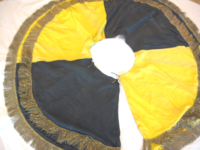 Rundskuret tornerskört av taft i fyra delar, två svarta fält och två gula. Skörten kantas av dubbla guldfransar, l. 80-75 mm. Den övre fransen är försedd med buljoner och krepiner. I den nedre fransens franskant har vävts in guldlan. Innerst vid midjan löper en dragsko med ett blått linneband. Skörten är helt öppen i ena sidan. Fodrad med ljus linnelärft.