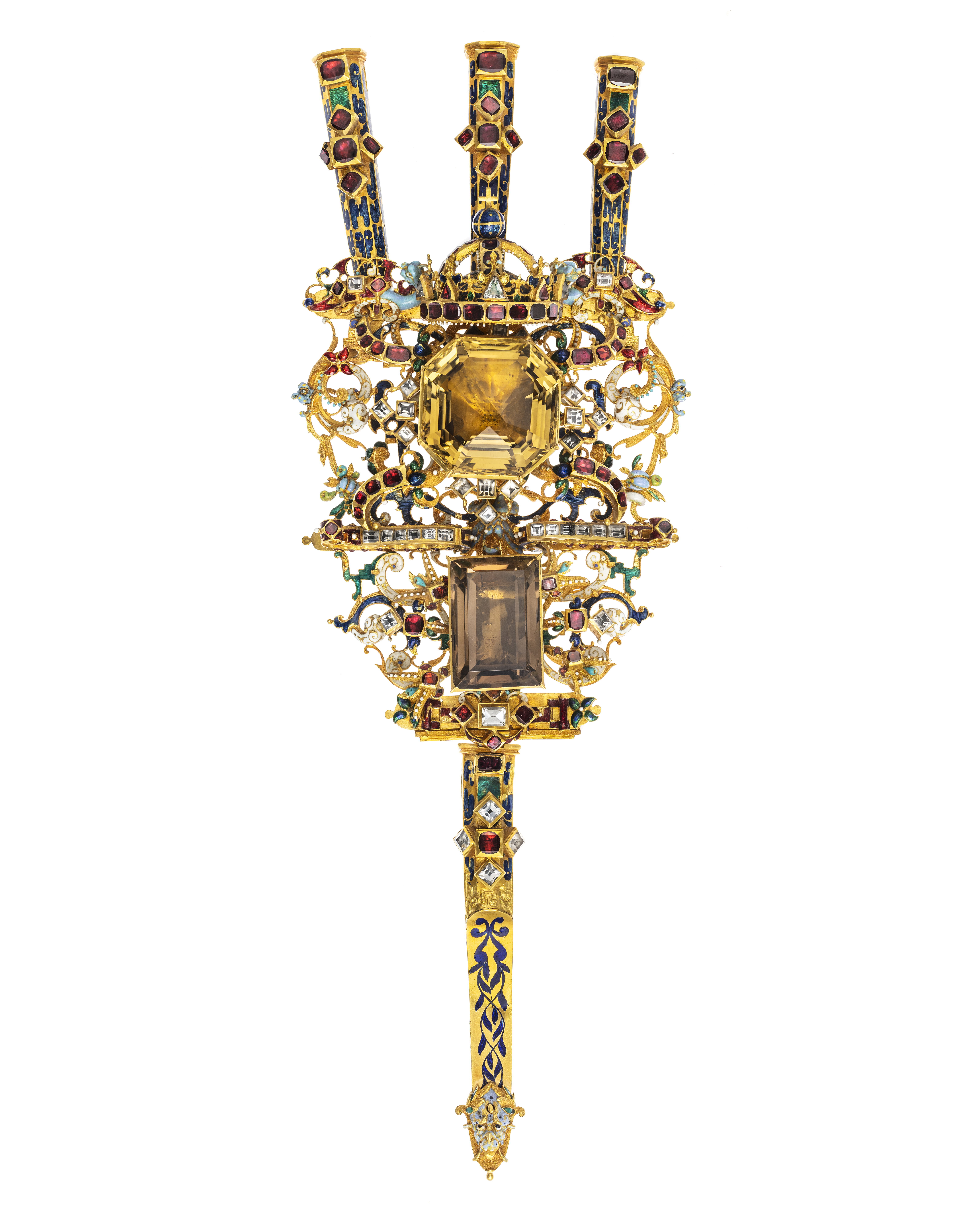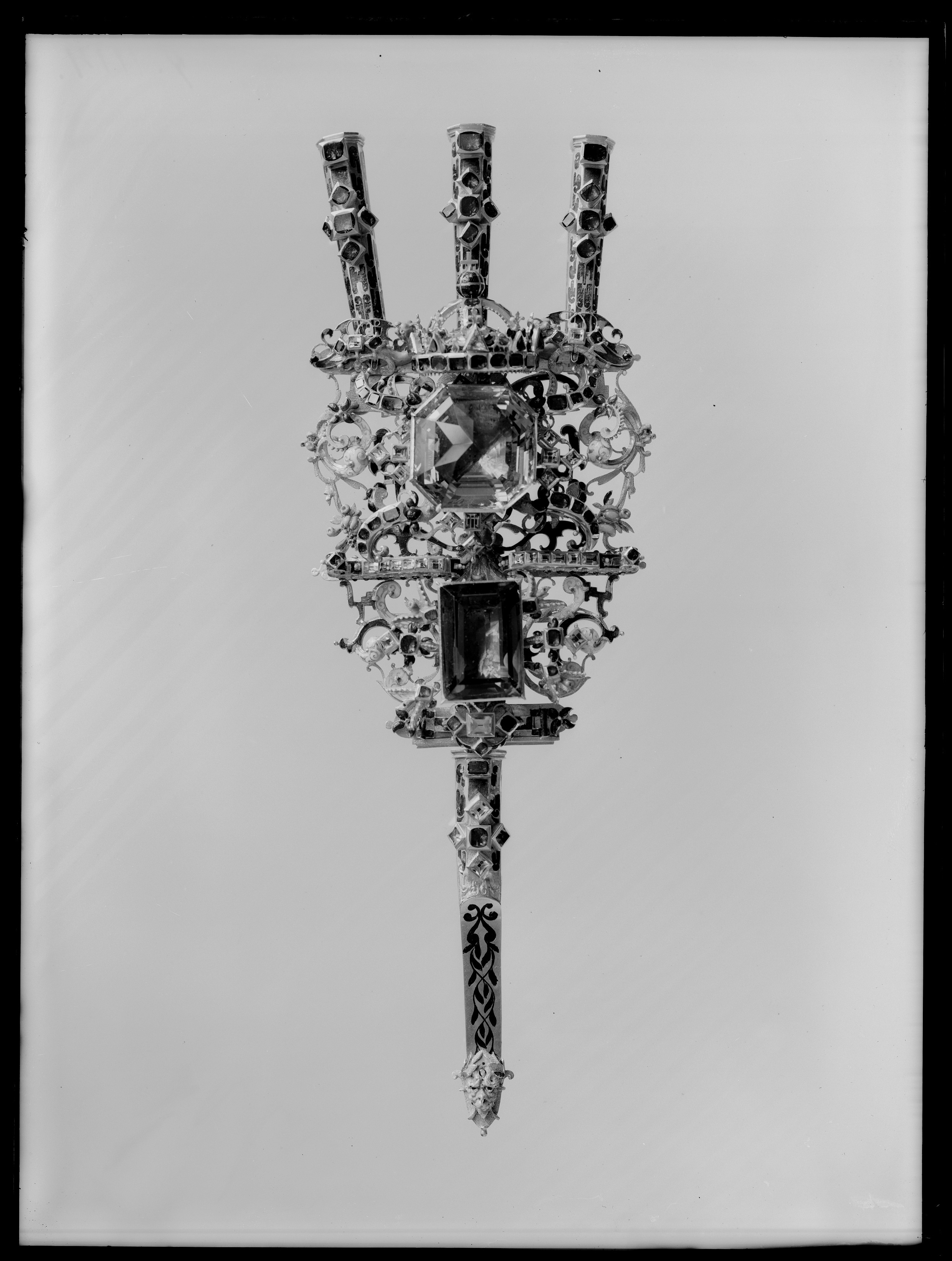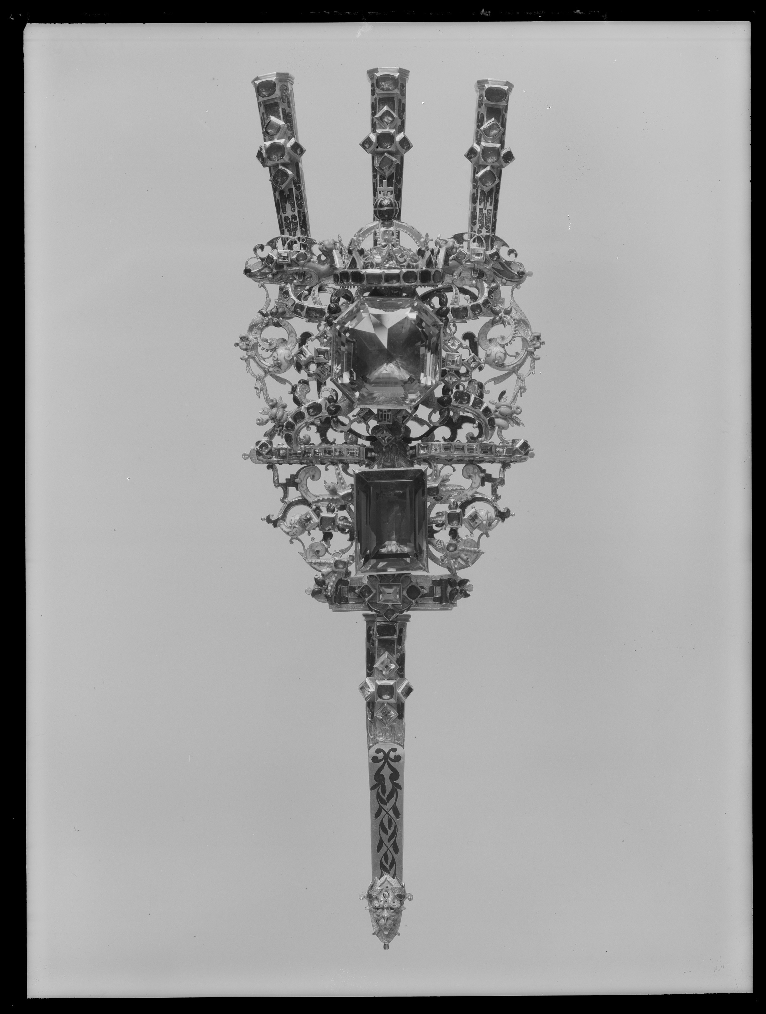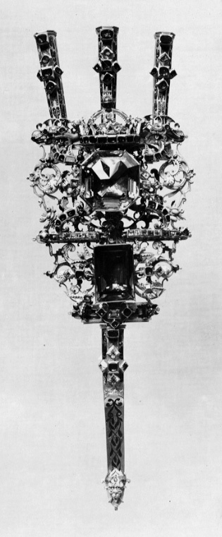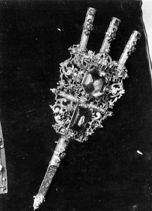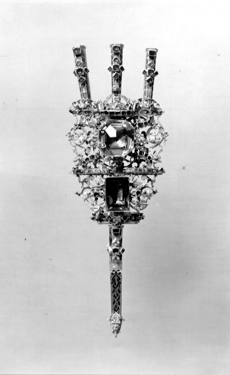 Av guld röd och röd, grön, vit, ljusblå och mörkblå emalj, sammansatt av tre åttkantiga pipor, genombruten platta samt slidformigt skaft, vars parti närmast plattan är åttkantigt, på skaftets baksida tre öglor. På piporna mörkblå cellemalj, nederst på skaftet en maskaron i ljusblå emalj, grönemaljerad lagerkrans. På plattan en stor brungul fassetslipad åttkantig sten (rökkvarts?), b:33 mm, därnedanför en fyrkantig, taffelslipad, mörkare sten, 22x31 mm, ovanför den större stenen en krona med fyra byglar, krönt av riksäpple med blåemaljerad glob, på kronringen nio granater och två ofärgade stenar, på de tre främre byglarna 11 granater. På plattan dessutom 32 granater och 31 ofärgade stenar, på piporna vardera 6 granater, på skaftet 2 granater och 4 ofärgade stenar.