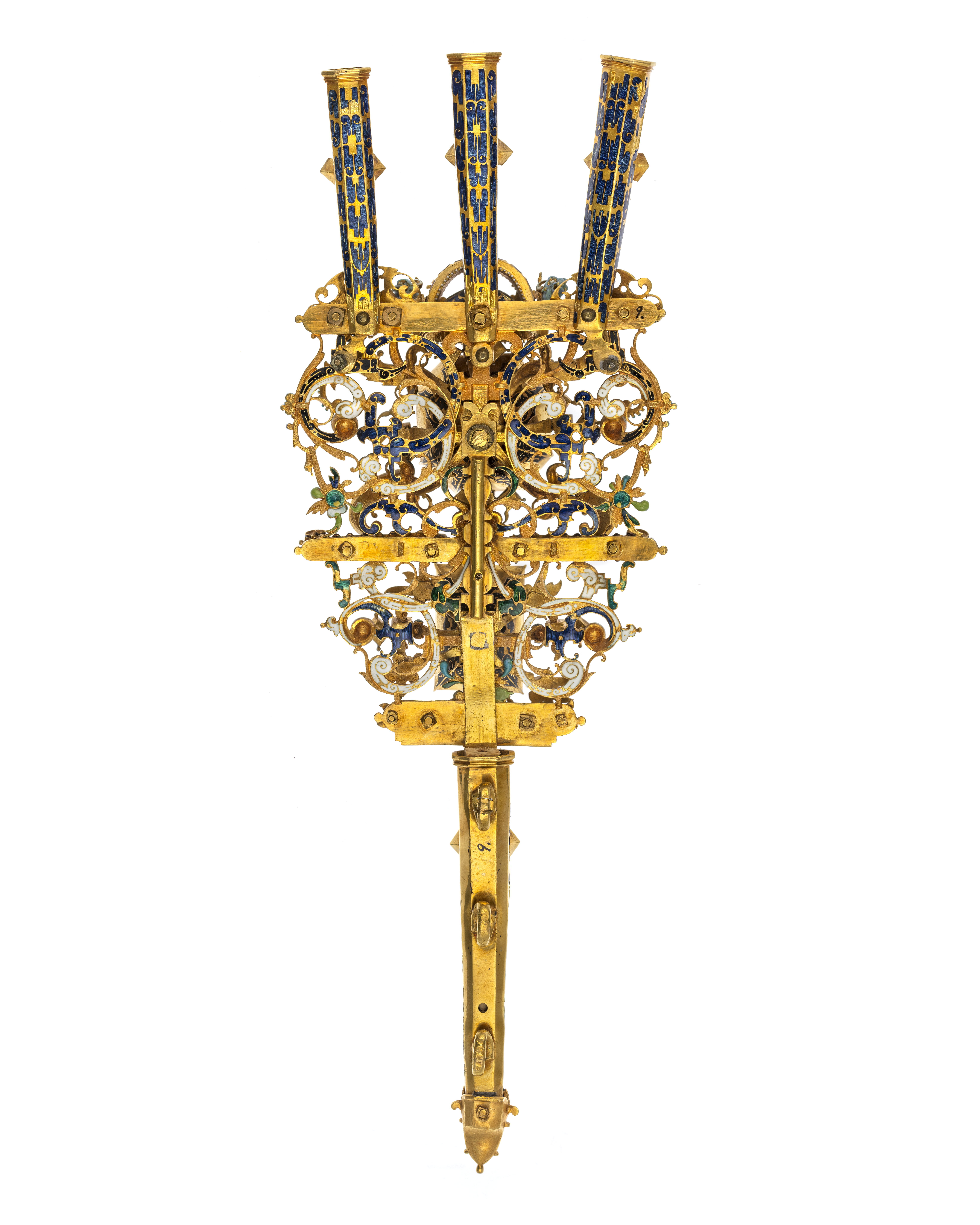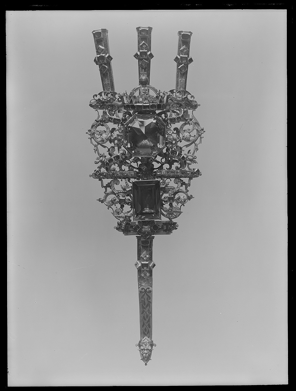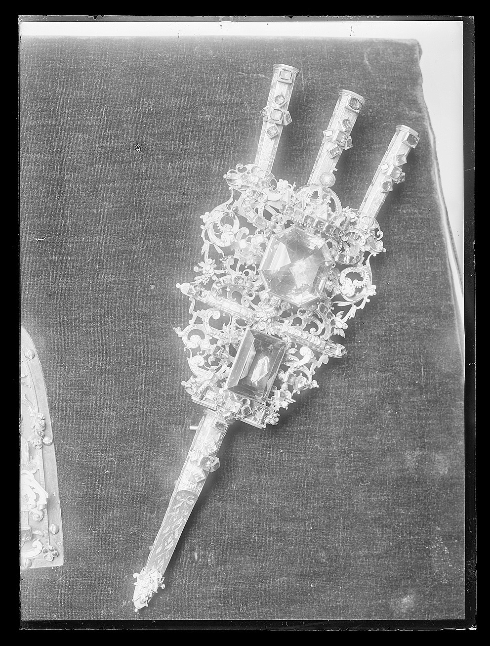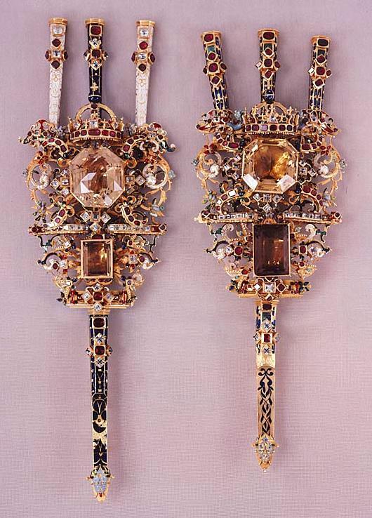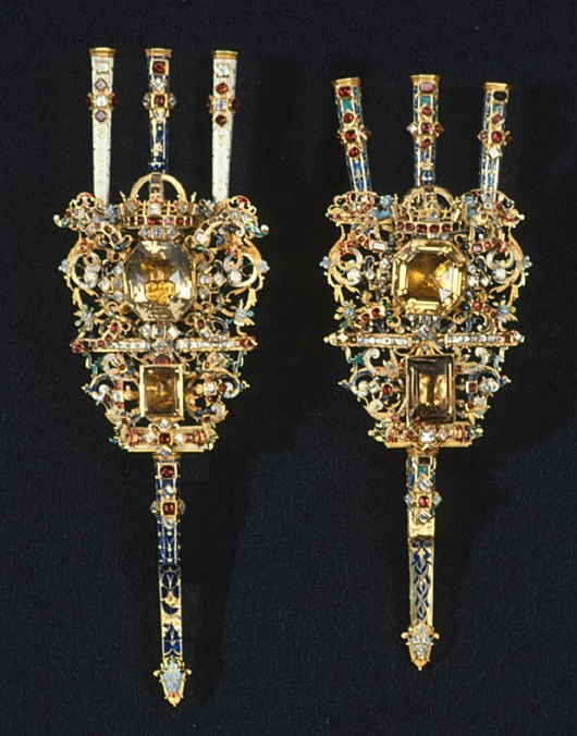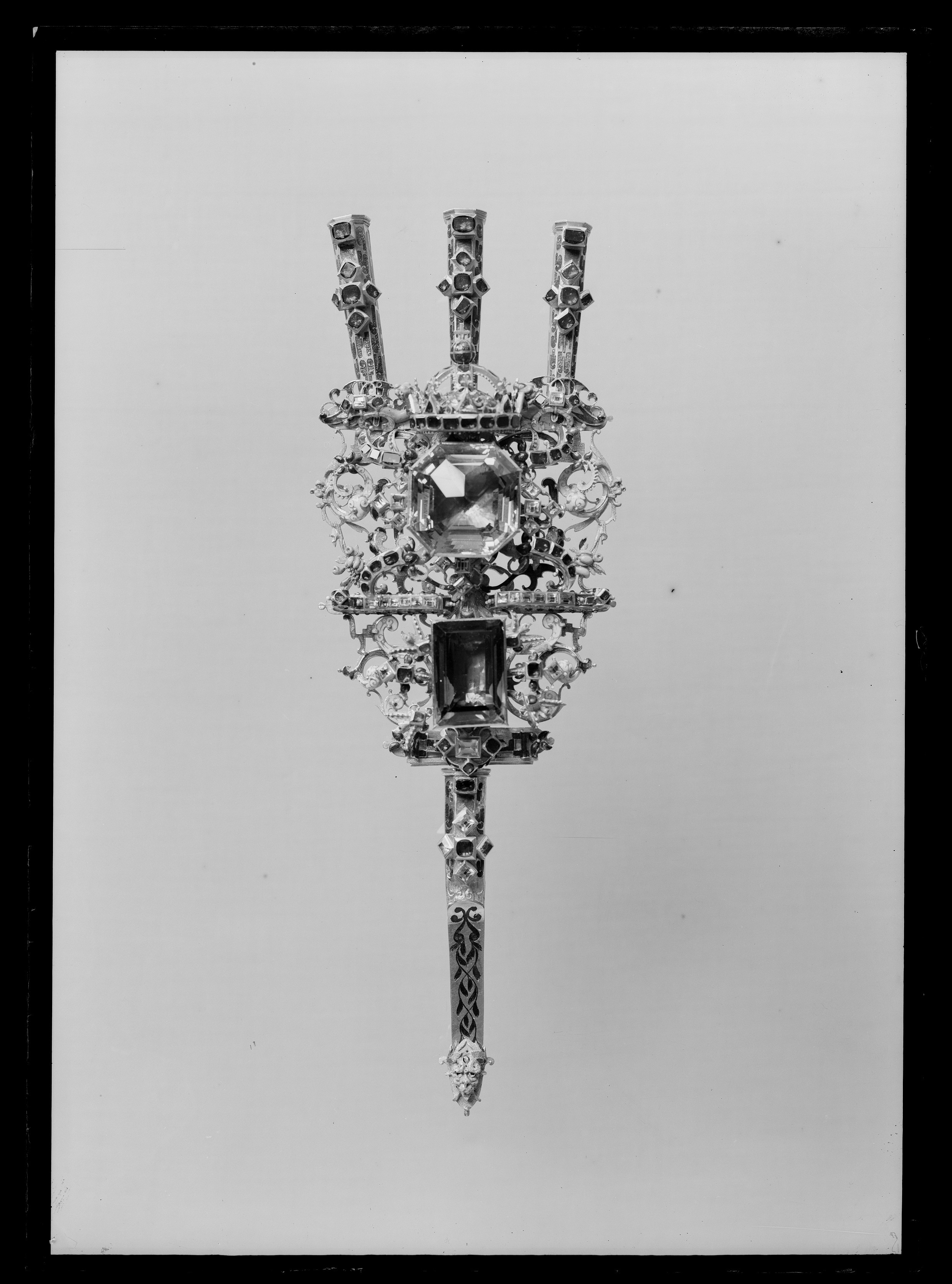Av guld röd och röd, grön, vit, ljusblå och mörkblå emalj, sammansatt av tre åttkantiga pipor, genombruten platta samt slidformigt skaft, vars parti närmast plattan är åttkantigt, på skaftets baksida tre öglor. På piporna mörkblå cellemalj, nederst på skaftet en maskaron i ljusblå emalj, grönemaljerad lagerkrans. På plattan en stor brungul fassetslipad åttkantig sten (rökkvarts?), b:33 mm, därnedanför en fyrkantig, taffelslipad, mörkare sten, 22x31 mm, ovanför den större stenen en krona med fyra byglar, krönt av riksäpple med blåemaljerad glob, på kronringen nio granater och två ofärgade stenar, på de tre främre byglarna 11 granater. På plattan dessutom 32 granater och 31 ofärgade stenar, på piporna vardera 6 granater, på skaftet 2 granater och 4 ofärgade stenar.