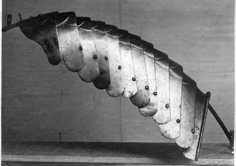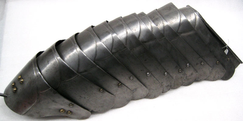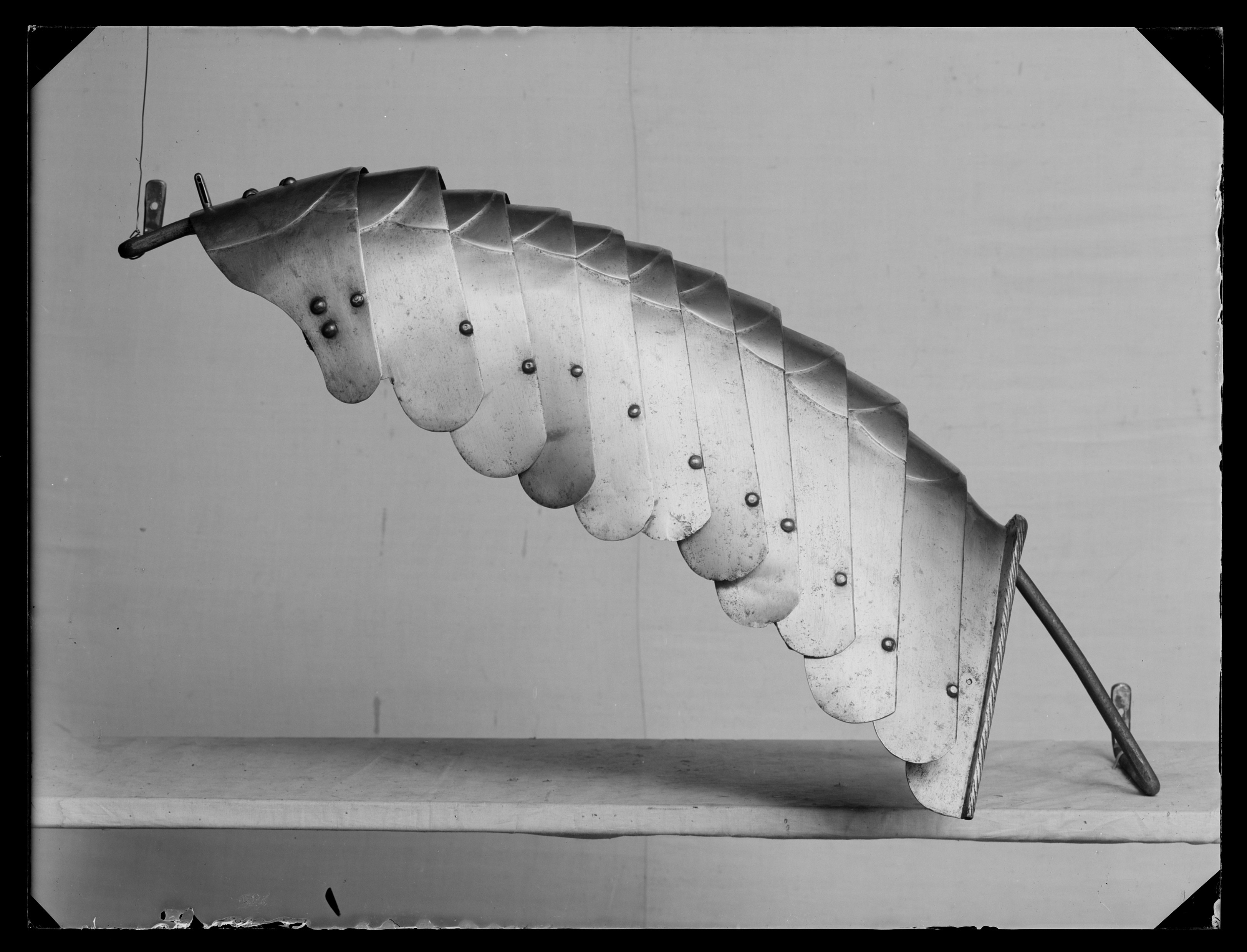 Av stålplåt. Utsidan slipad metallren, blank med svarta partier. Insidan rå efter smidet. Sammanlagt 12 delar. Bestående av tolv välvda skenor, satta omlott med tre längsgående läderband på insidan. Skenorna i olika bredd och ökande i längd bakåt. Gulmetallskodda nitar i nedre kant, en på var skena. Över varje skenas mitt är drivet två halvcirklar, i utdraget tillstånd och sett uppifrån blir det cirklar överlappande varandra. I första skenan tapp med ursprungligen fjädrande hake (saknas). Sista skenan har kanten uppdriven och repstavsformig.