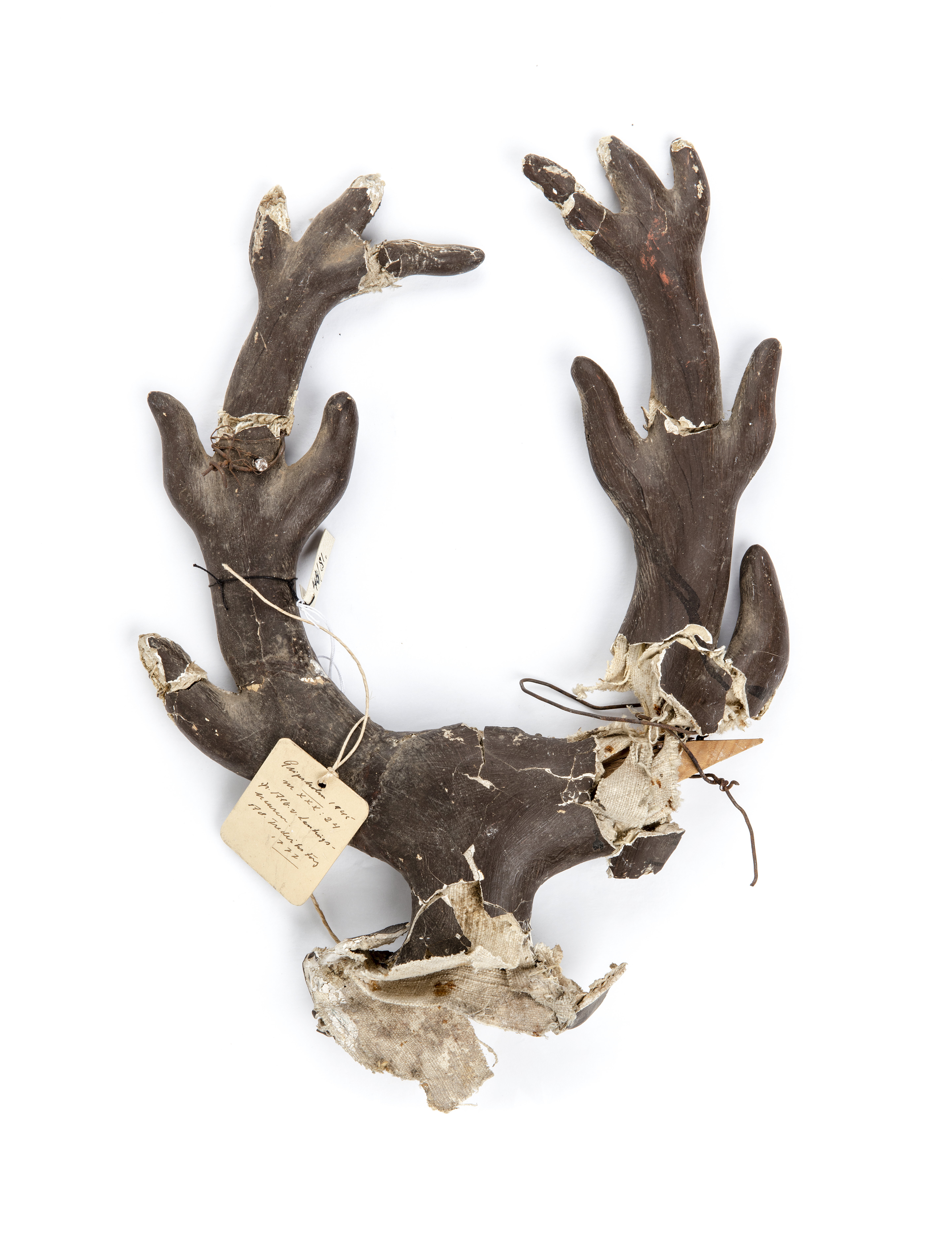 Av papier maché, brunmålat, två hjorthorn, ursprungligen med en flerbladig silverros i mitten(enligt tornérprogram). Har burits av friherre Albrekt von Lantinghausen vid tornérspelen på Adolf Fredriks torg 1777, i Gustav III:s kadrilj.