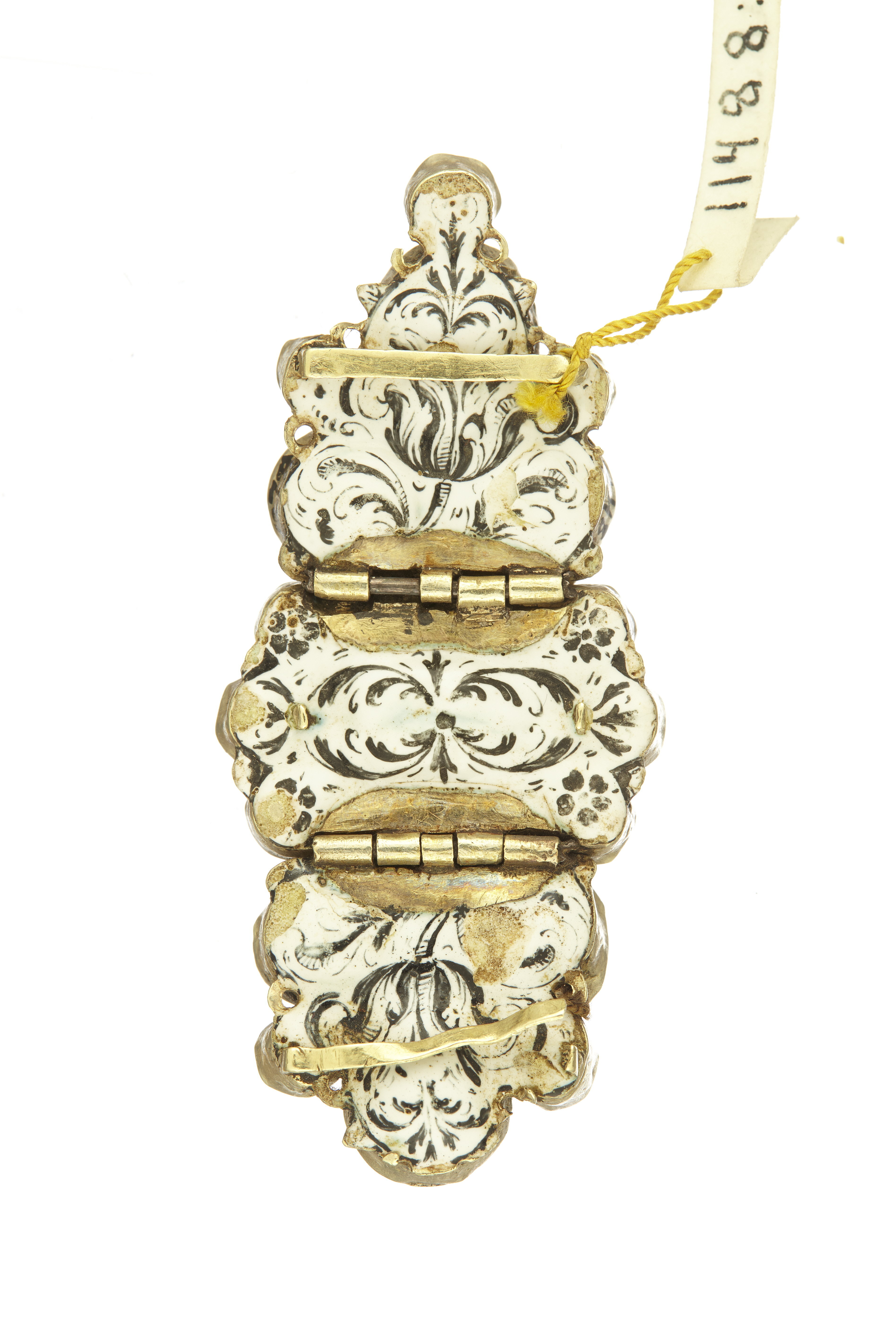 Lika som nr 1275, av byglarna på baksidan återstår en hel, en trasig samt rester av en bygel på mittdelen.