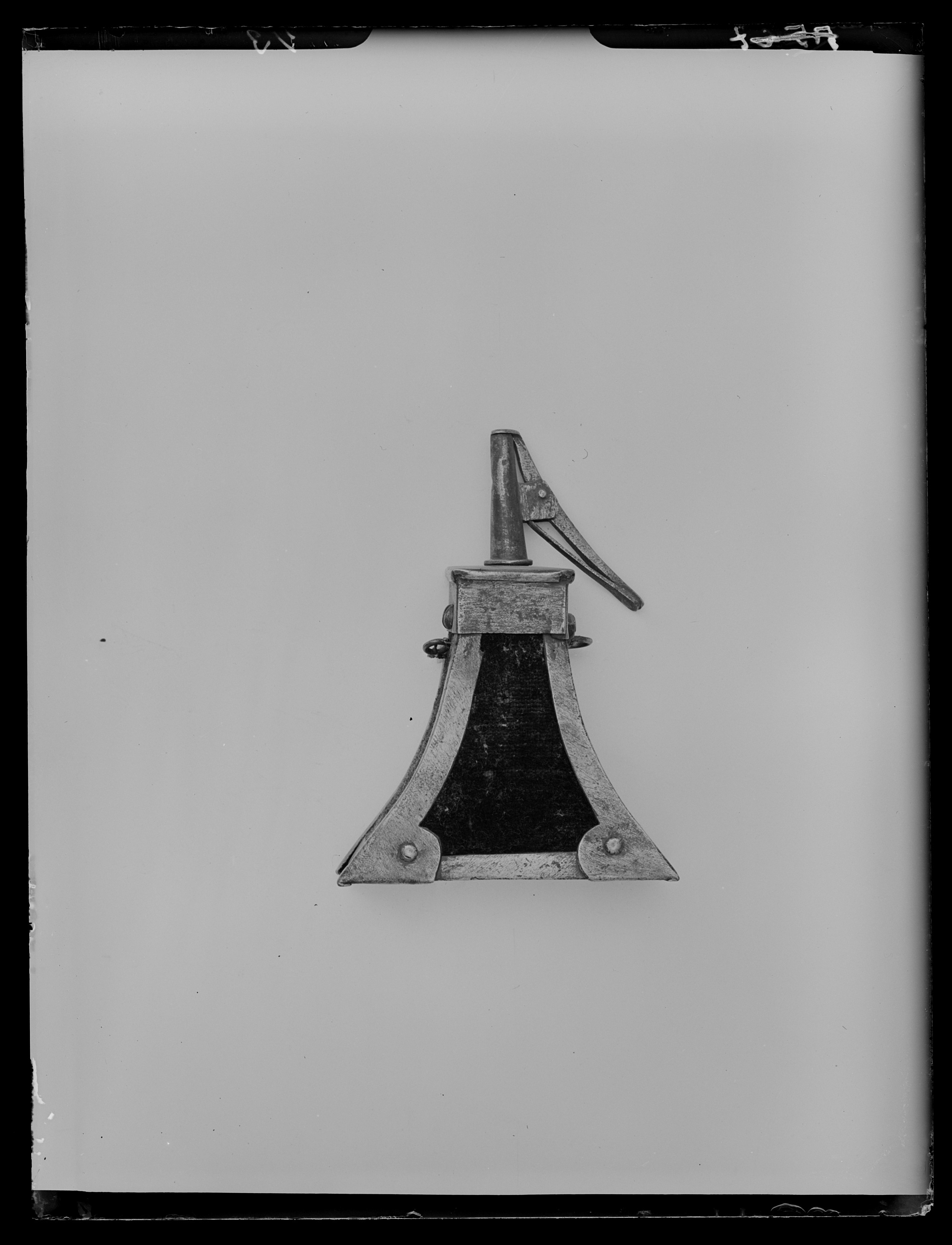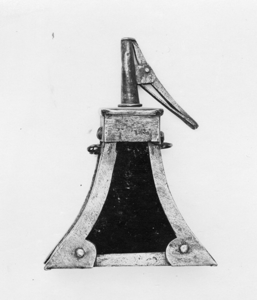 Trapetsformig behållare med insvängda sidor av trä, klädd med svart, delvis mycket nött sammet. Kantbeslag av stål. Fastskruvat munstycke och därpå en pip, l: 45 mm med mynningsventil med en fjäderbelastad hävarm, l: 70 mm. Nedanför locket två remöglor.