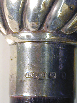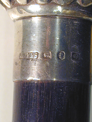 Käpp av ebenholz, upptill en spiralgodronnerad silverkula, h: 36,3 mm, d: 41,4 mm, l holk: 15 mm, d holk: 20,3 mm, stämplad: J.G. & S., gående lejon, fraktur-P, ankare, (Birminghamstämplar, 1889(?)). På motstående sida graverad inskription. "Har tillhört // konung Oscar II". Doppsko av elfenben, h: 25 mm.