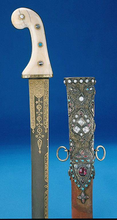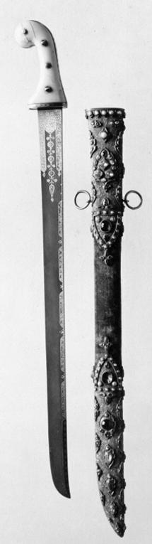 Balja klädd med röd sammet, över sömmen smal guldgalon. Munbleck 235 mm och doppsko 305 mm av förgyllt silver med konturerade över- resp. nederkant. Dekor på utsidan i form av graverat blommönster mot punsad botten och stenar i förhöjda fattningar, delvis bladformiga, halvädelstenar, bl.a. bandagat, turkoser, pärlor samt folierade glasbitar. På insidan ornament med graverade slingor omgivna av graverat blommönster mot punsad botten. På munblecket hållare med två koppelringar, en i var sida. Karl XV:s samling nr 55, gruppnr 2.11. 1872 i Turkiska rummet på Stockholms slott