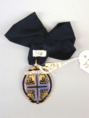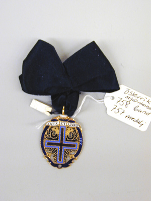 Rosett, ihopsydd av svart sammetsband med baksidan utåt, möjligen ej ursprungligt.
