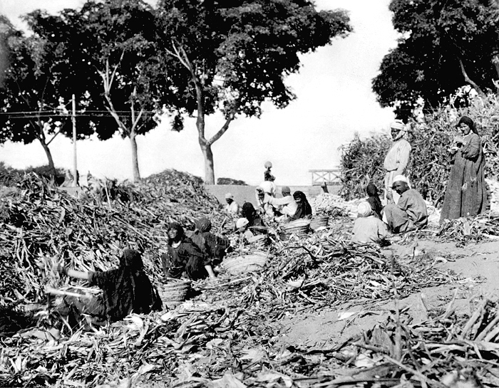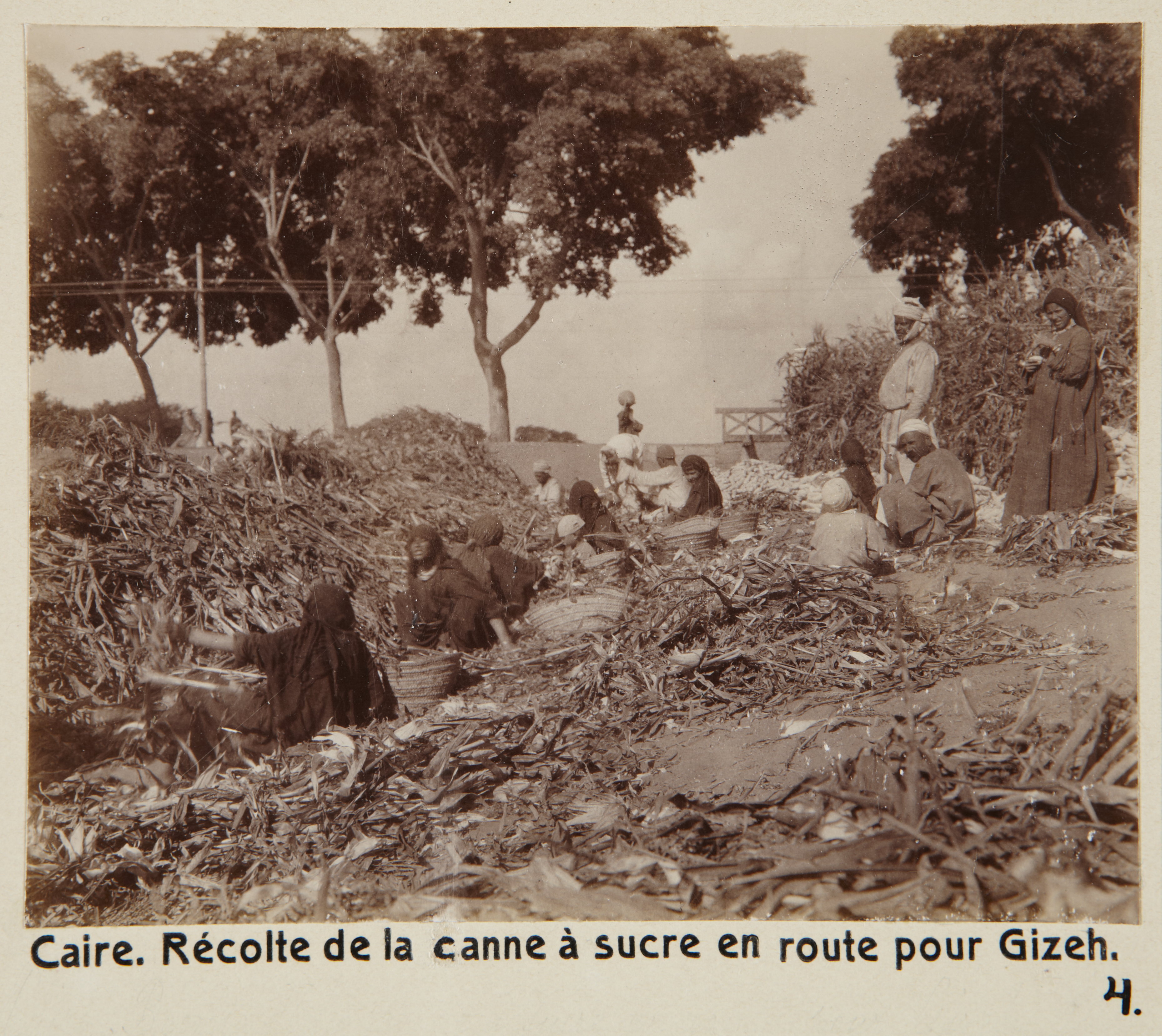 Kairo, Egypten. Sockerrörsskörd, på vägen till Giza. Text på fotografiet: Caire. Récolte de la canne à sucre en route pour Ghizeh Fotografierna LXVI:M.01.- 201. kommer från resan till Egypten och Sudan som Wilhelmina och Walther von Hallwyl gjorde vintern 1900-1901. De lämnade Sverige den 5 november 1900 och fortsatte från Egypten till Palestina den 28 mars 1901. Med på resan var döttrarna Ellen med maken Henric de Maré och Irma med maken Wilhelm von Geijer. Wilhelminas sällskapsdam, fröken Ida Uhse reste också med. Under en del av resan anslöt sig ledamoten av Internationella domstolen i Kairo, assessorn Otto Conrad Waldemar Cedercrantz med makan Anna Elisabeth. Vid resan uppför Nilen hade Walther von Hallwyl hyrt ångfartyget Columbia med besättning. Båtresan startade i Kairo 27 december 1900, gick ända till Wadi Halfa varifrån man reste vidare med tåg till Khartum och tillbaka till Wadi Halfa. Båten vände åter i riktning mot Kairo, men det verkar som att sällskapet tog tåg sista biten, från Luxor. Henric och Ellen de Maré samt fru Cedercrantz lämnade båten redan då de passerade Luxor första gången. Resten av sällskapet återvände till Kairo den 1 mars. Fotografierna LXVI:M.01.-120. togs av resenärerna själva, de största av Ellen de Maré, de mellersta av Wilhelmina von Hallwyl och de minsta av Wilhelm von Geijer. Resten köptes av professionella fotografer i Kairo, de flesta från Studio Photogr. Artistique G. Lekegian & Cie. Alla uppgifter kommer från Ida Uhses reseanteckningar.