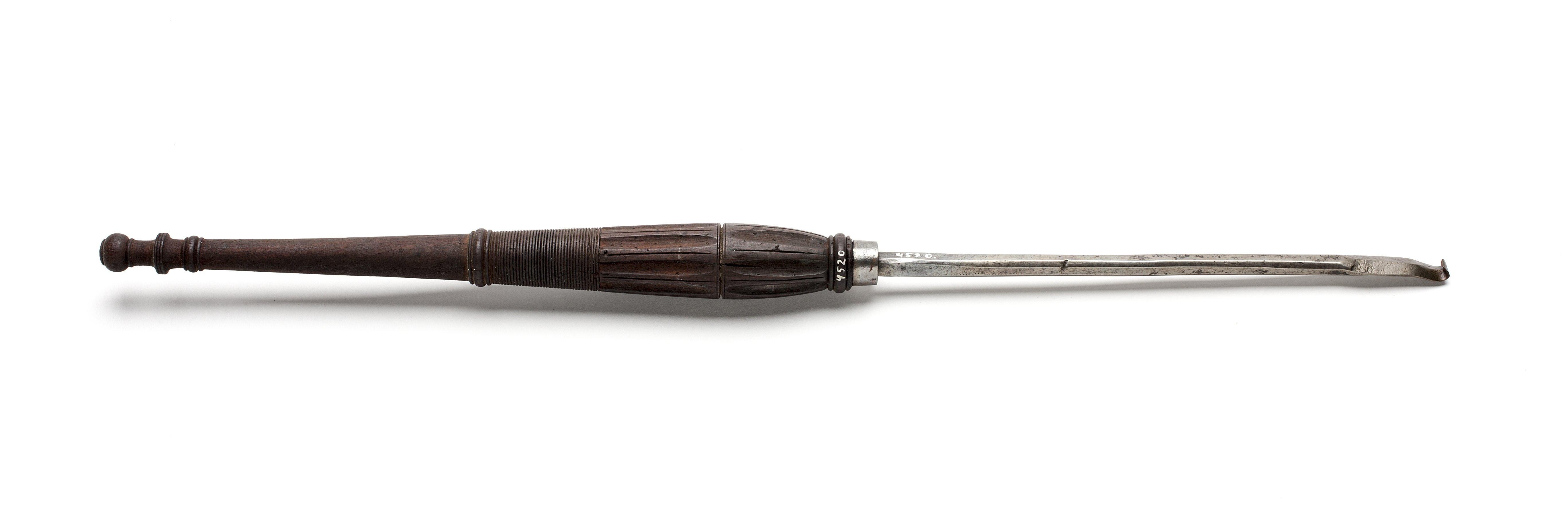 Klinga med åttsidig genomskärning. Tillplattad ände med böjd spets, egg efter två sidor. Stämplat på klingan: riksäpple eller venustecken. Svarvat skaft av mahogny med profilerad ände och kannelurer mot basen, stålring.