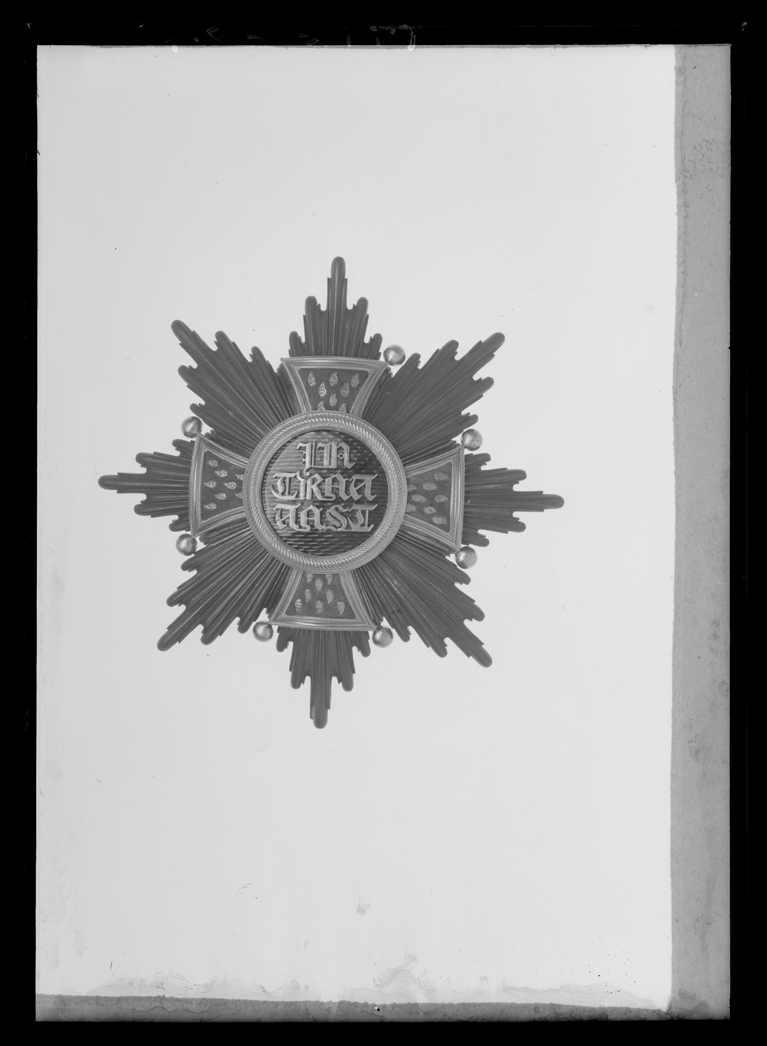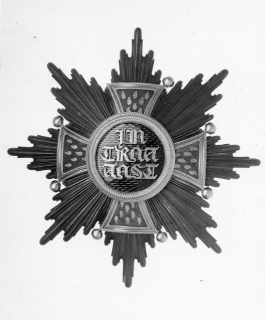Åttauddig strålstjärna av silver, därpå fäst ett guldkantat mantuakors av silver med stora guldkulor på spetsarna. På korsarmarna flammor mot mattpunsad, försänkt bakgrund. Svagt välvd, guldkantad medaljong täckt med röd, genomsynlig emalj, därpå fäst guldtext:"IN // TREV // VAST". På frånsidan stämplad signatur, rektangel med text: "GODET // IN // BERLIN".Vertikalt placerad säkerhetsnål samt två hakar.