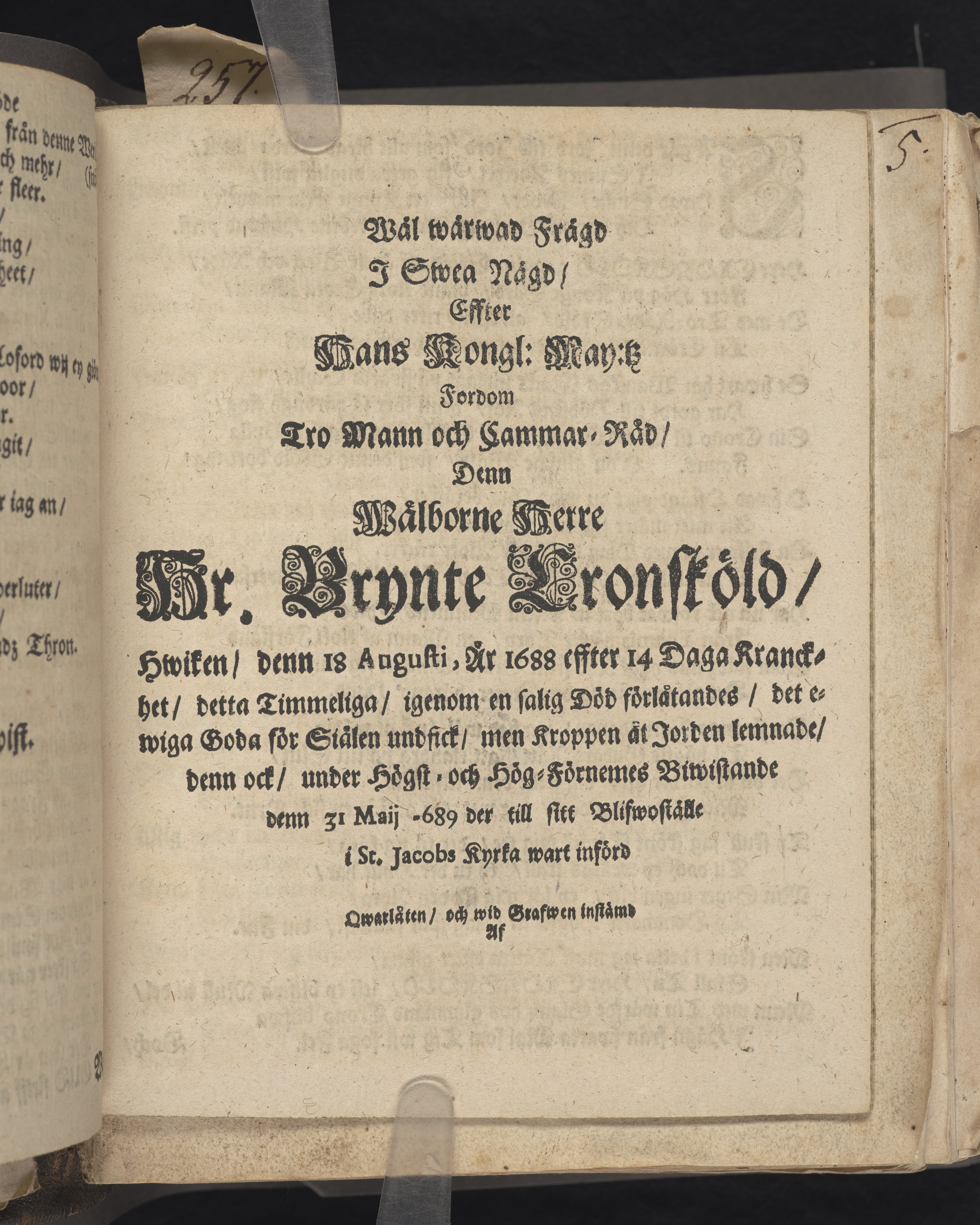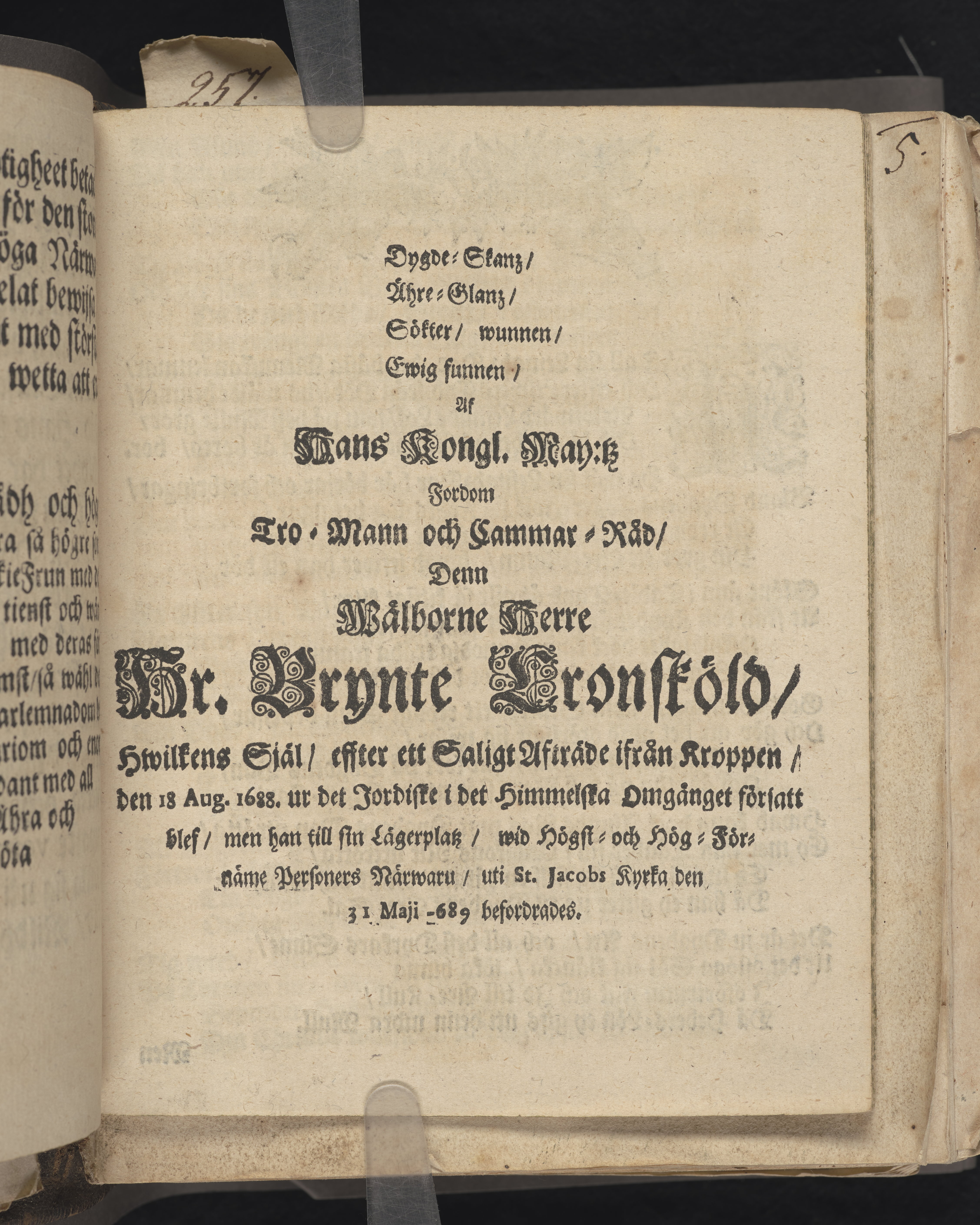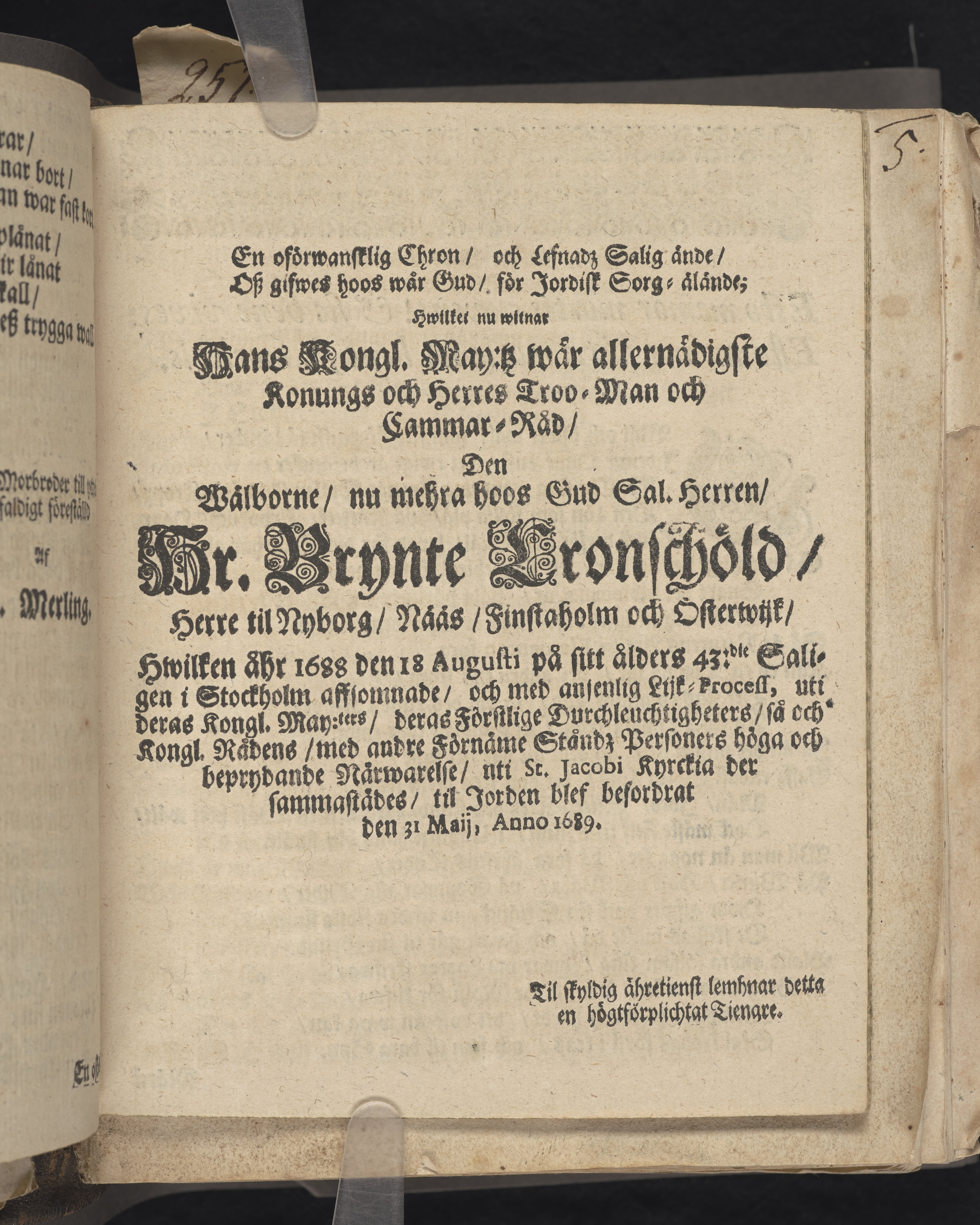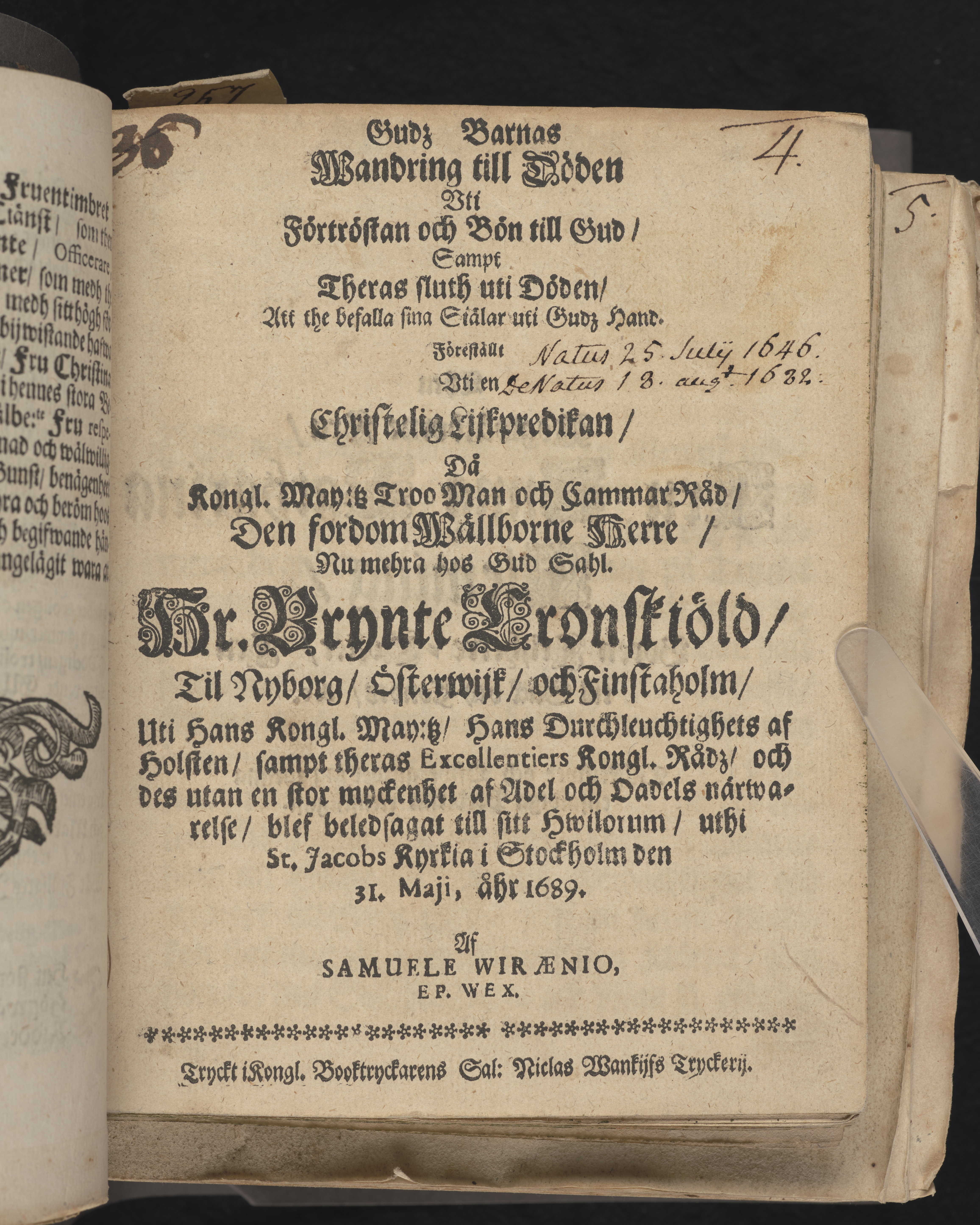 Gudz barnas wandring till döden ... förestält uti en christelig lijkpredikan, då ... Hr. Brynte Cronskiöld, til Nyborg, Österwijk ... blef beledsagat till sitt hwilorum, uthi St. Jacobs kyrkia i Stockholm den 31 maji, åhr 1689. Af Samuele Wirænio ep. Wex. Tryckt i Kongl. booktryckarens sal: Niclas Wankijfs tryckerij.