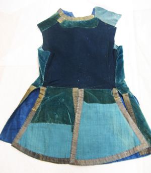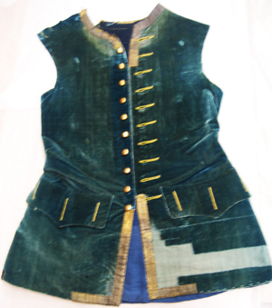 Rock av blå sammet, ursprungligen kantad av guldgaloner av förgylld silvertråd, b. 25 mm, nu fragmentariska. Rocken är sydd av två framstycken av blekt, blå sammet samt med ett bakstycke av två delar av blått kläde. Rocken har en knäppning mitt fram bestående av tio runda, förgyllda mässingsknappar med motsvarande knapphål, l. 50 mm, kantade med gul silketråd. Halsringningen är rundad. På vardera framstycke sitter iskuret en horisontal ficka, l. 232 mm, med breda ficklock, b. 100 mm. Ficklocken knäpps med tre förgyllda mässingsknappar. Rocken har en midjesöm från vilken utgår två trapetsformade skörtkappor, kantade med guldgalon. Framstyckena är fodrade med blått siden. Rocken syddes tillsammans med Gustav Vasa-figurens dräkt samt tre andra dräkter till det museum som inrättades på 1750-talet, i Ornässtugan där gustav Vasa övernattat. Dräkterna syddes av skräddare Erik Säterbeck. Dessa plagg fanns utställda i Ornässtugan fram till 1950-talet då de plockades ned för konservering i Livrustkammarens konserveringsateljé.