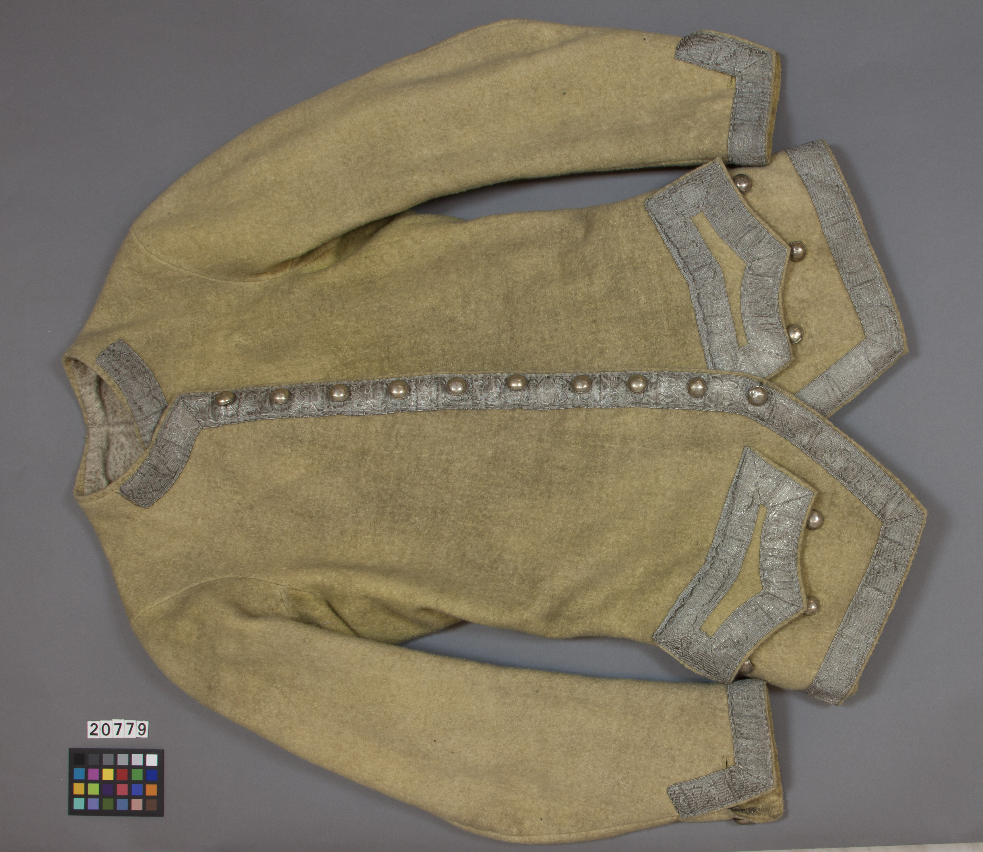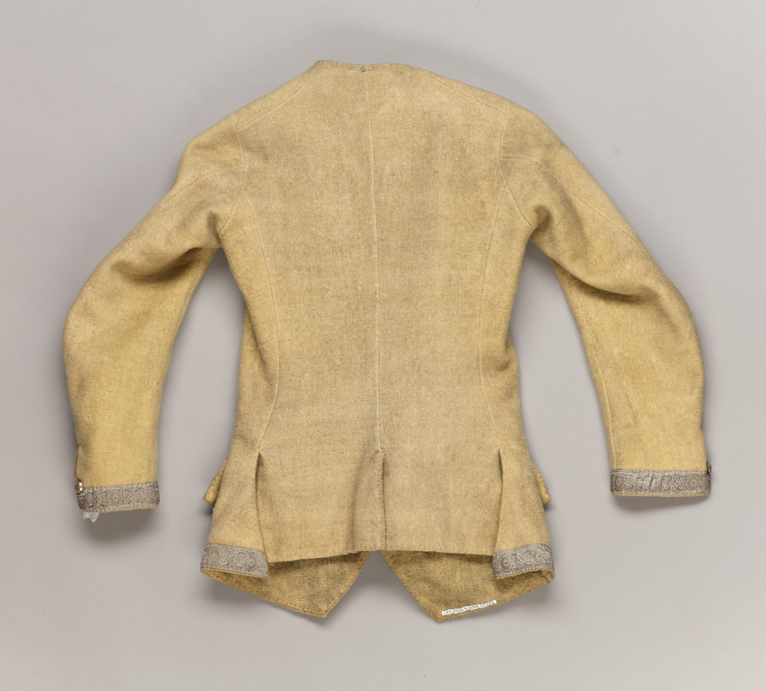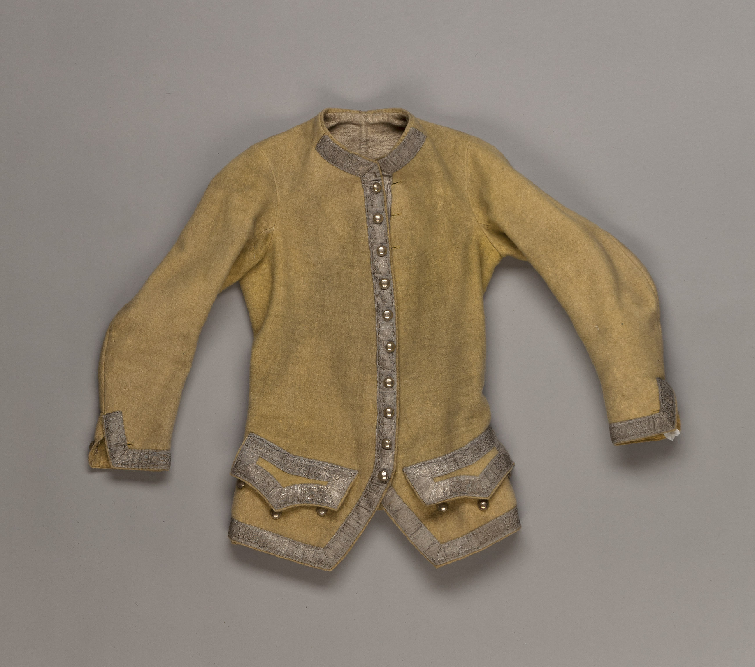Väst av gult kläde. Formsydd i fyra stycken med långa ärmar. Utan krage. Diagonalt skurna framstycken nedtill. Två trapetsformade skört bak. Knäppes fram med 10 kullriga knappar i gulmetall på högra framstycket. Knapparna mäter 17 mm i diameter. Ärmarna har ett sprund nedtill, 80 mm långt, som knäppes med en knapp i gulmetall på sprundets baksida. Två fickor fram med spetsformade lock. Nedanför locken sitter tre dekorknappar i gulmetall, knapphål saknas. Fickorna fodrade med grovt, ofärgat linne. Öppningarna skurna i spetsform. Garnerad med silvergalon med vävt geometriskt mönster, enligt Gula liggaren ligatursilvergalon, runt nederkanten, längs framkanterna som fortsätter upp längs halslinningen fram 100 mm, runt ärmarnas nederkant upp på framdelen av sprundet samt runt ficklocken. Galonbredd, 30 mm. Foder av gult boj fram och bak nedtill, 120 mm upp från nederkanten. Övriga bakstycket fodrat med vit twills med blå ränder. Ärmarna fodrade i vit twills. Mitt bak i halslinningen finns ett snöre i ofärgad silke, genomgående fäst med knutar på båda sidor.