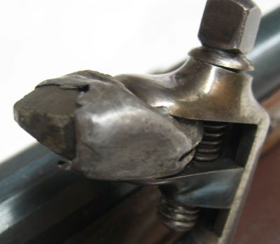 Mörkgrå pyrit, rektangulär med sluttande trubbig spets. Mantel av bly.