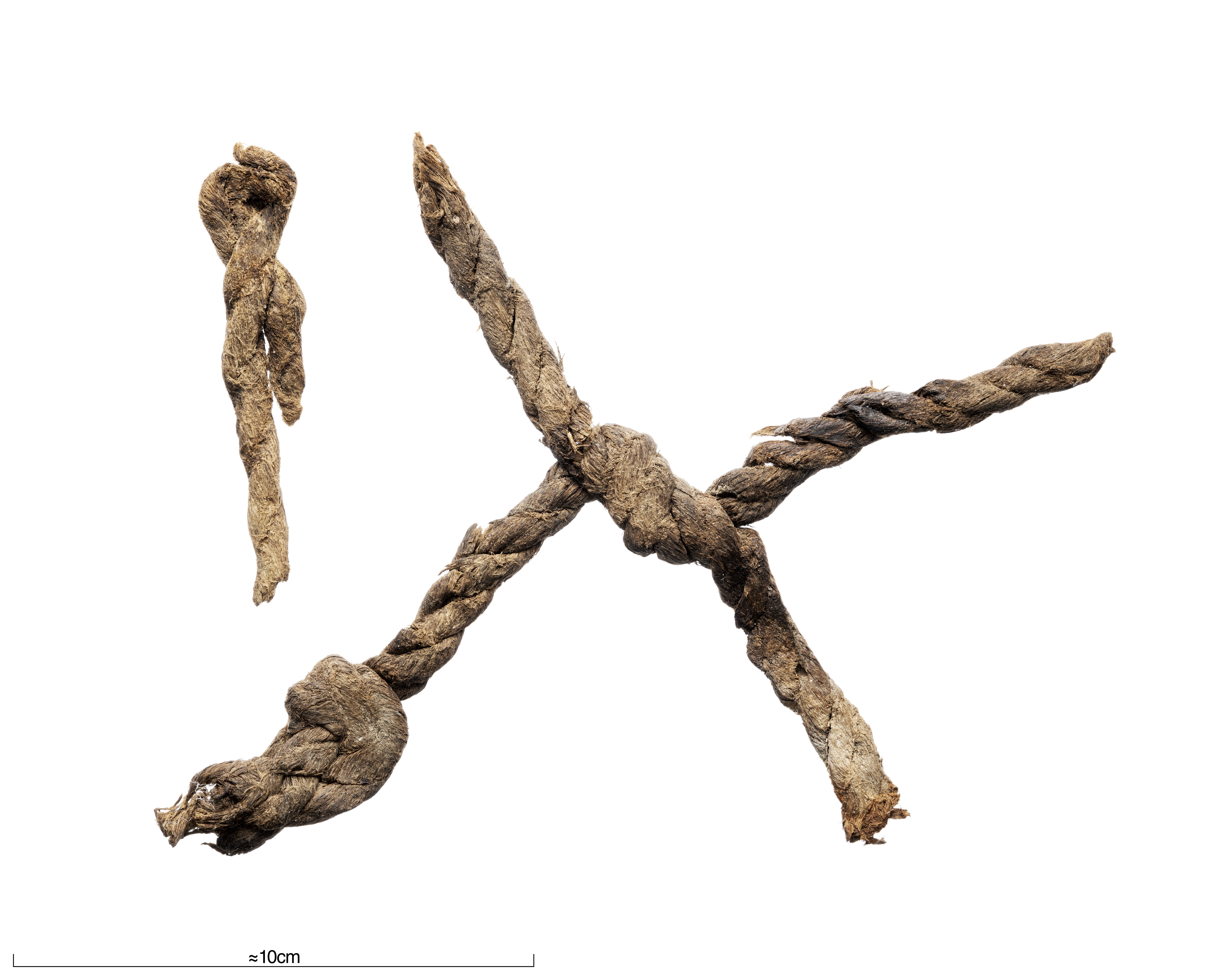 Ett större och ett mindre fragment av textil. Tågvirke tillhör ankarstenen.