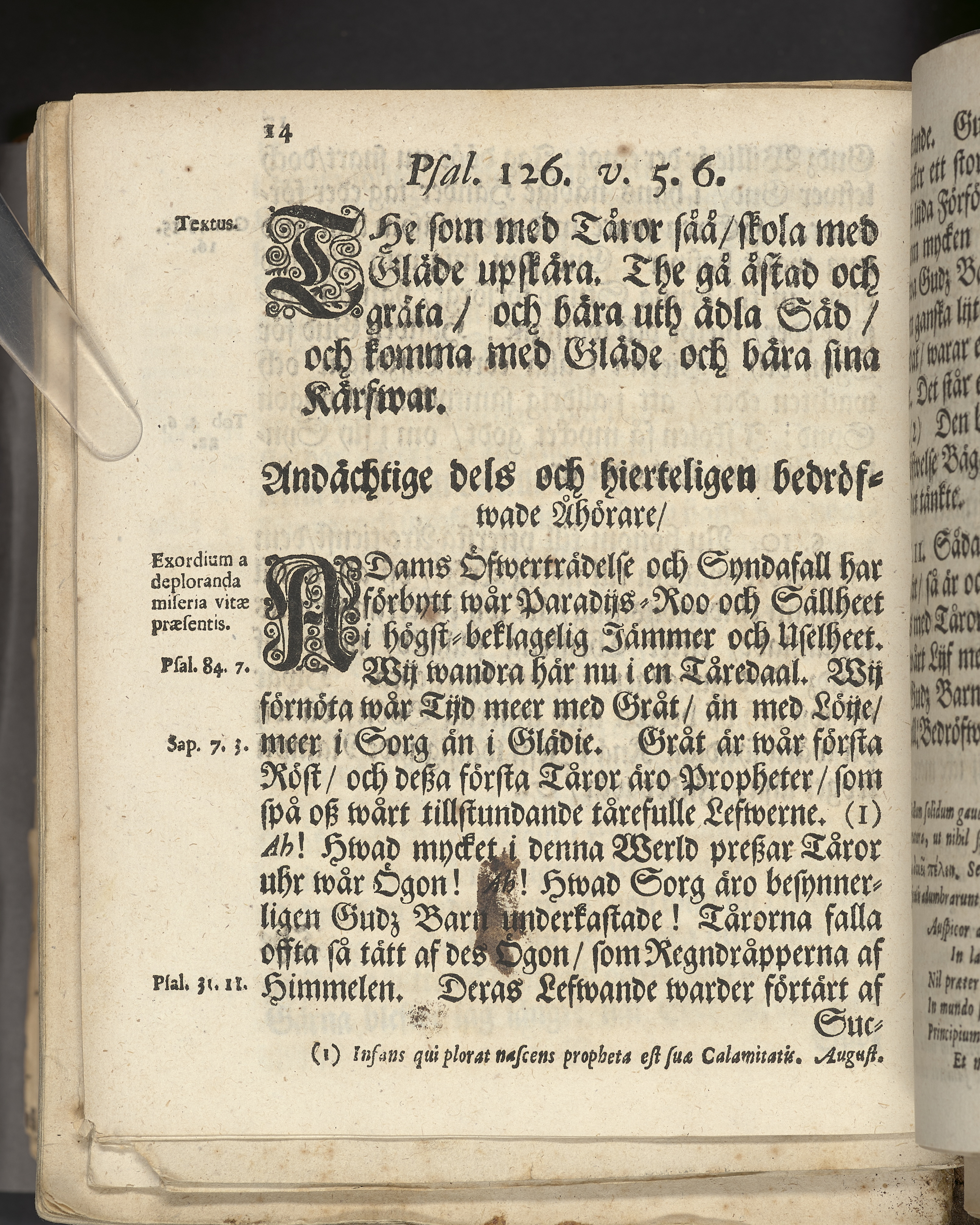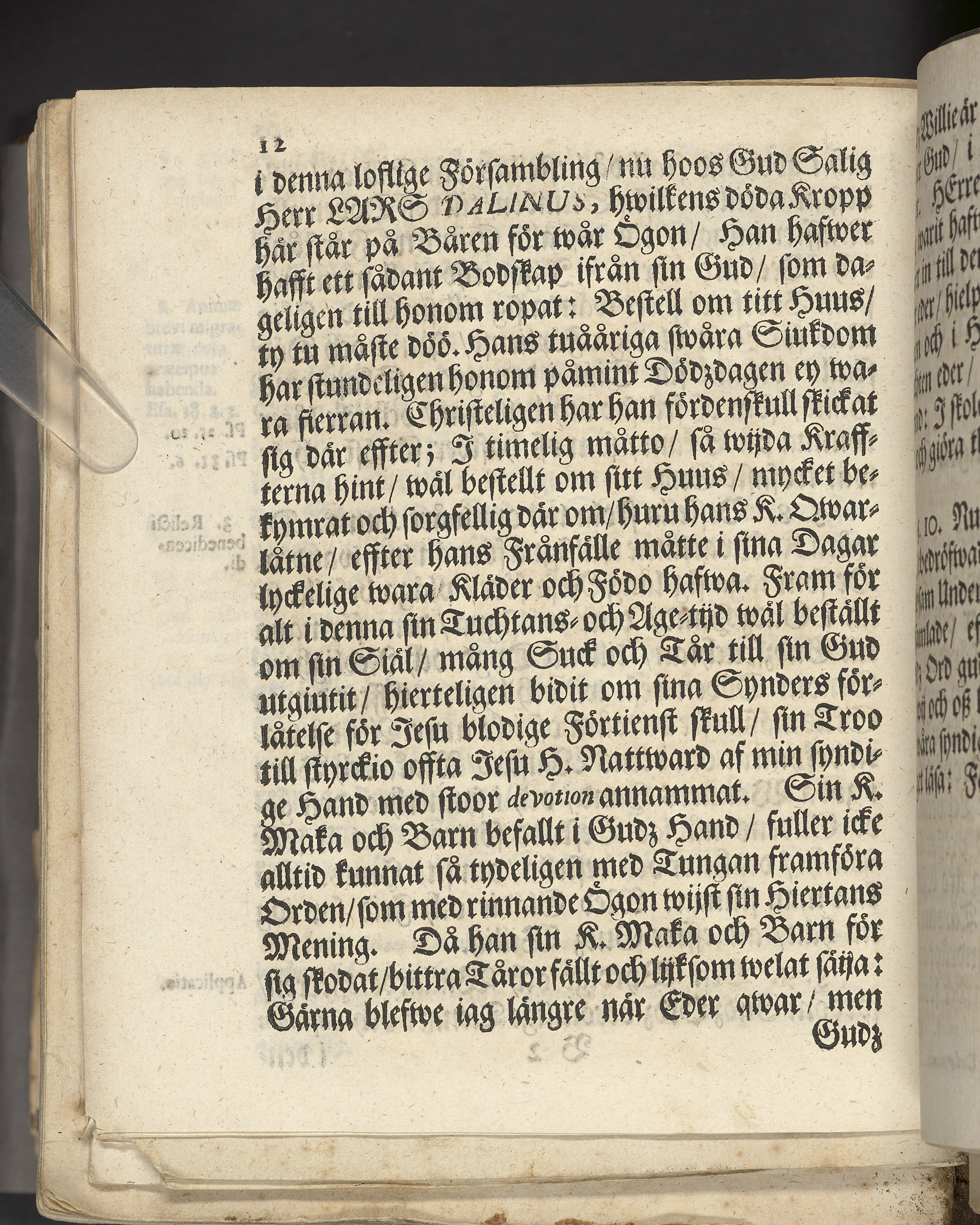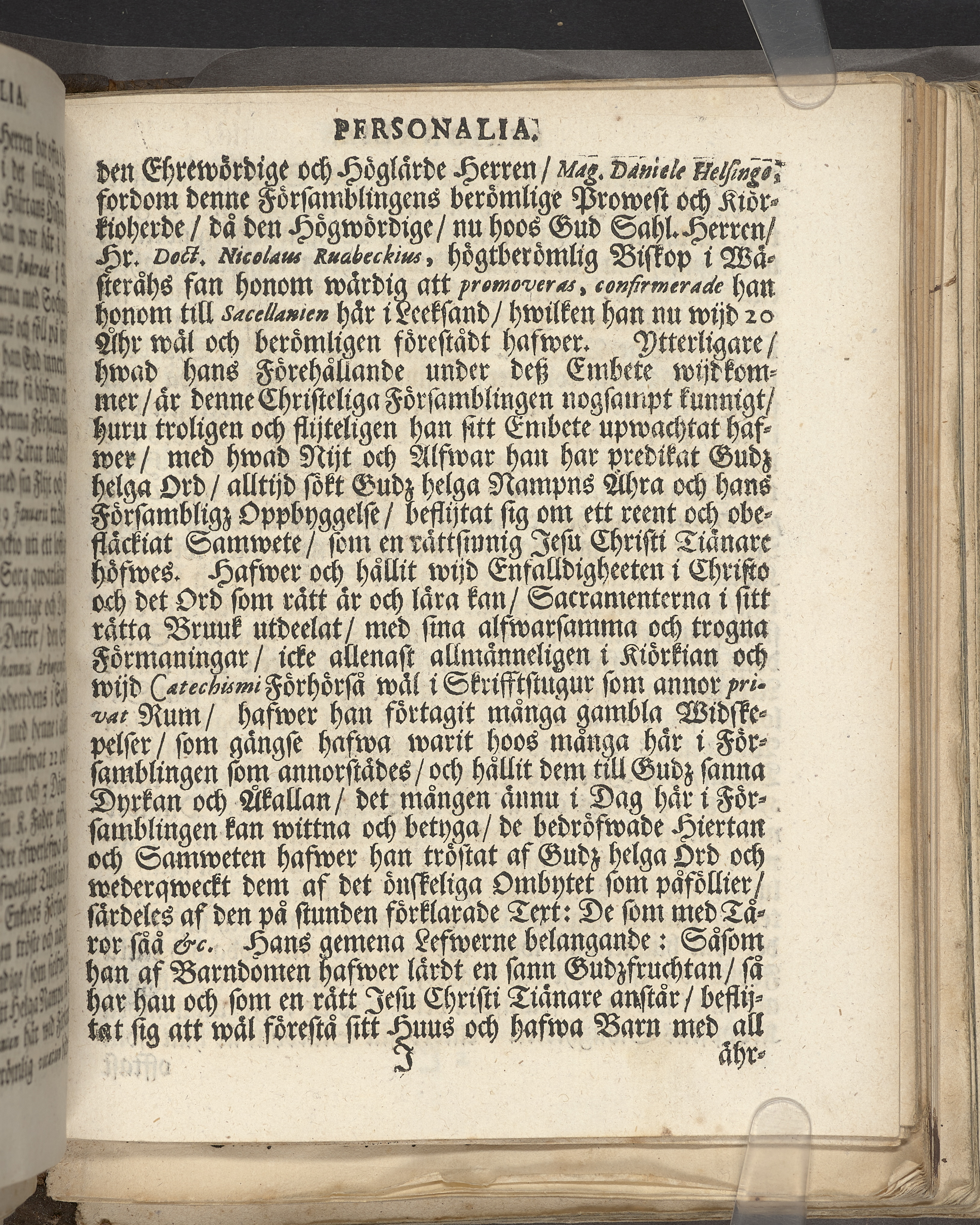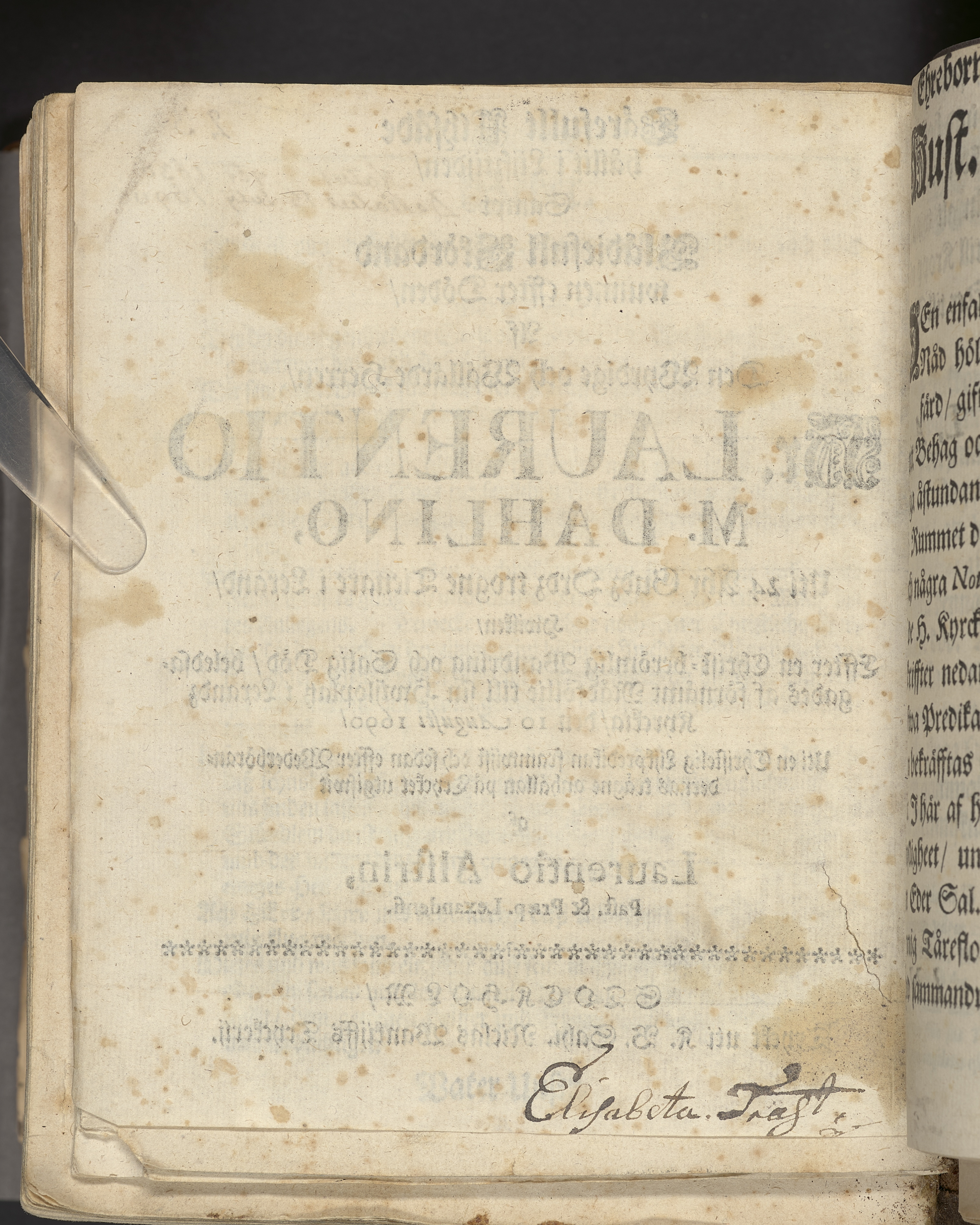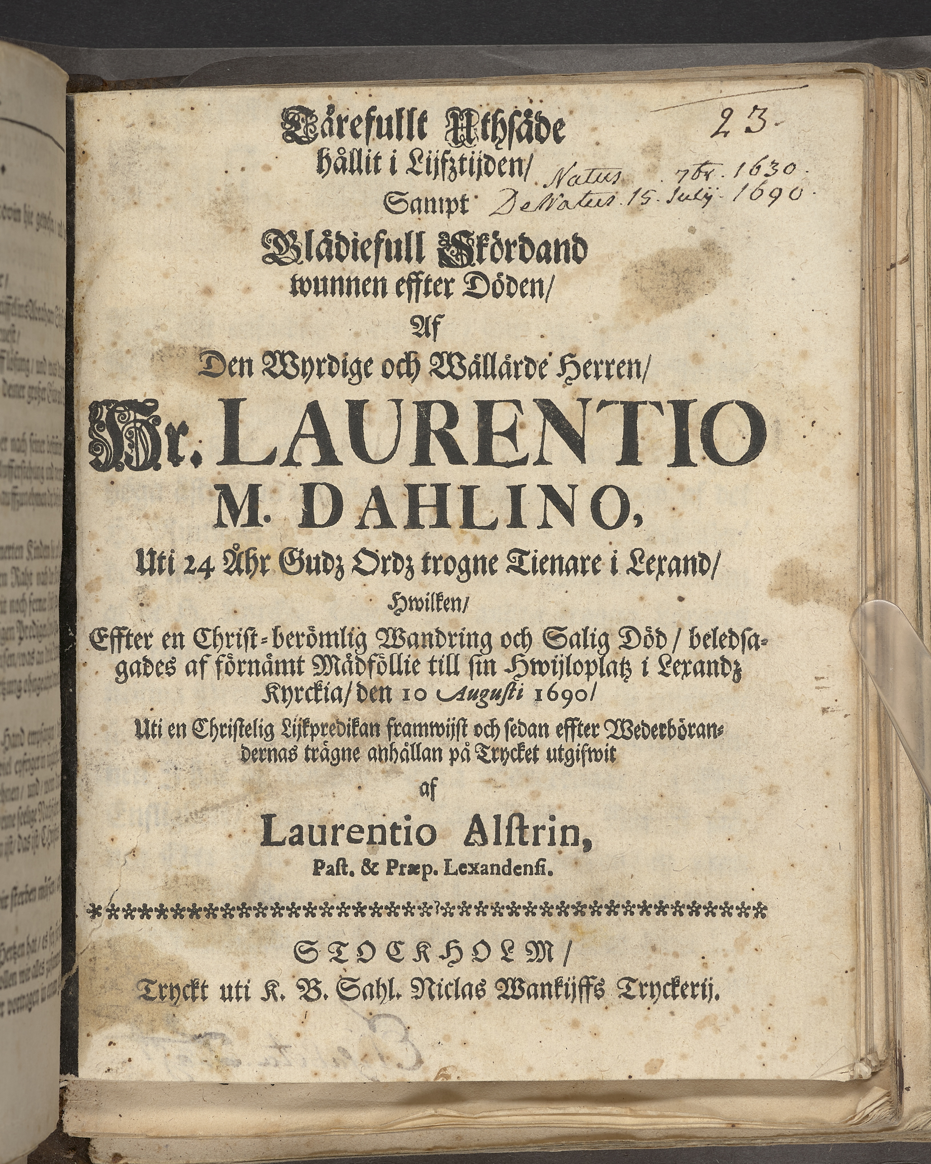 Tårefullt uthsäde hållit i lijfztijden sampt glädiefulll skördand wunnen effter döden af den wyrdige och wällärde herren Hr. Laurentio M. Dahlino, uti 24 åhr Gudz ordz trogne tienare i Lexand, hwilken, effter en Christ-berömlig wandring och salig död, beledsagades af förnämt mädföllie till sin hwijloplatz i Lexandz kyrckia, den 10 augusti 1690, uti en christelig lijkpredikan frawijst och sedan effter wederbörandenas trägne anhållan på trycket utgifwit af Laurentio Alstrin ... Stockholm, tryckt uti K. B. sahl. Niclas Wankijffs tryckerij.