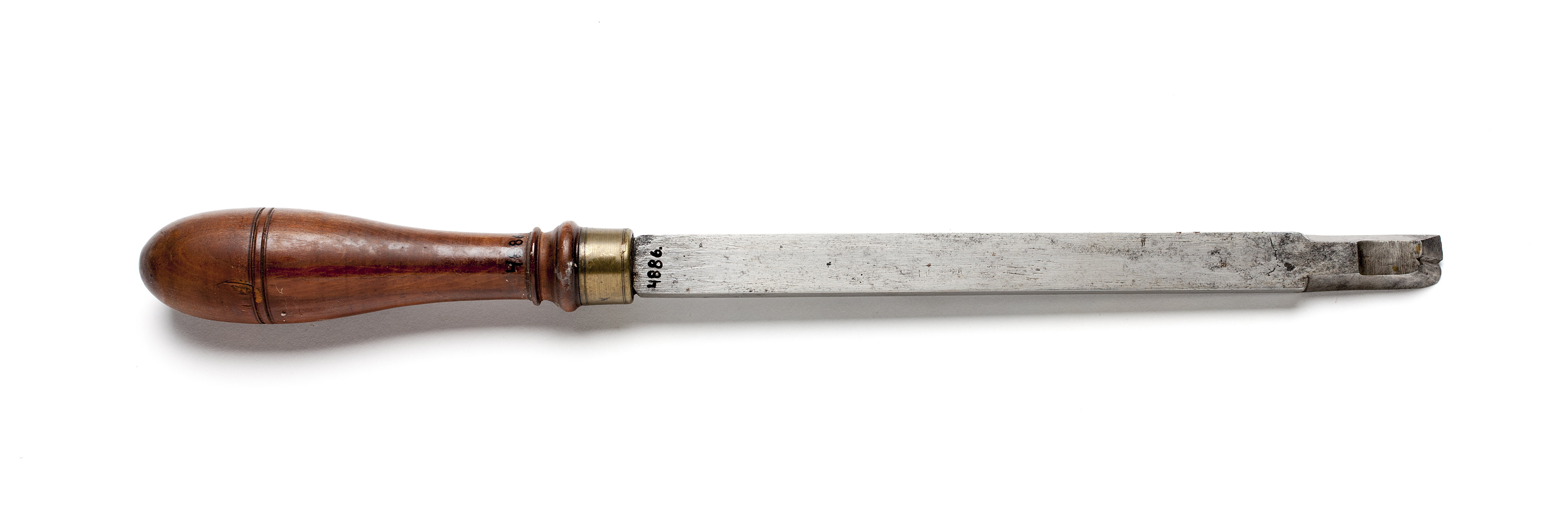 Klinga med rektangulär, i änden trapetsoidisk genomskärning. Profilerad egg, ett rakt hörn, ett rundat hörn, skåra i mitten. Svarvat skaft av päronträ med två vulster nedtill ("skoklostertyp"). Mässingsring. Märkt i skaftets ände vid fästet: ".1.".