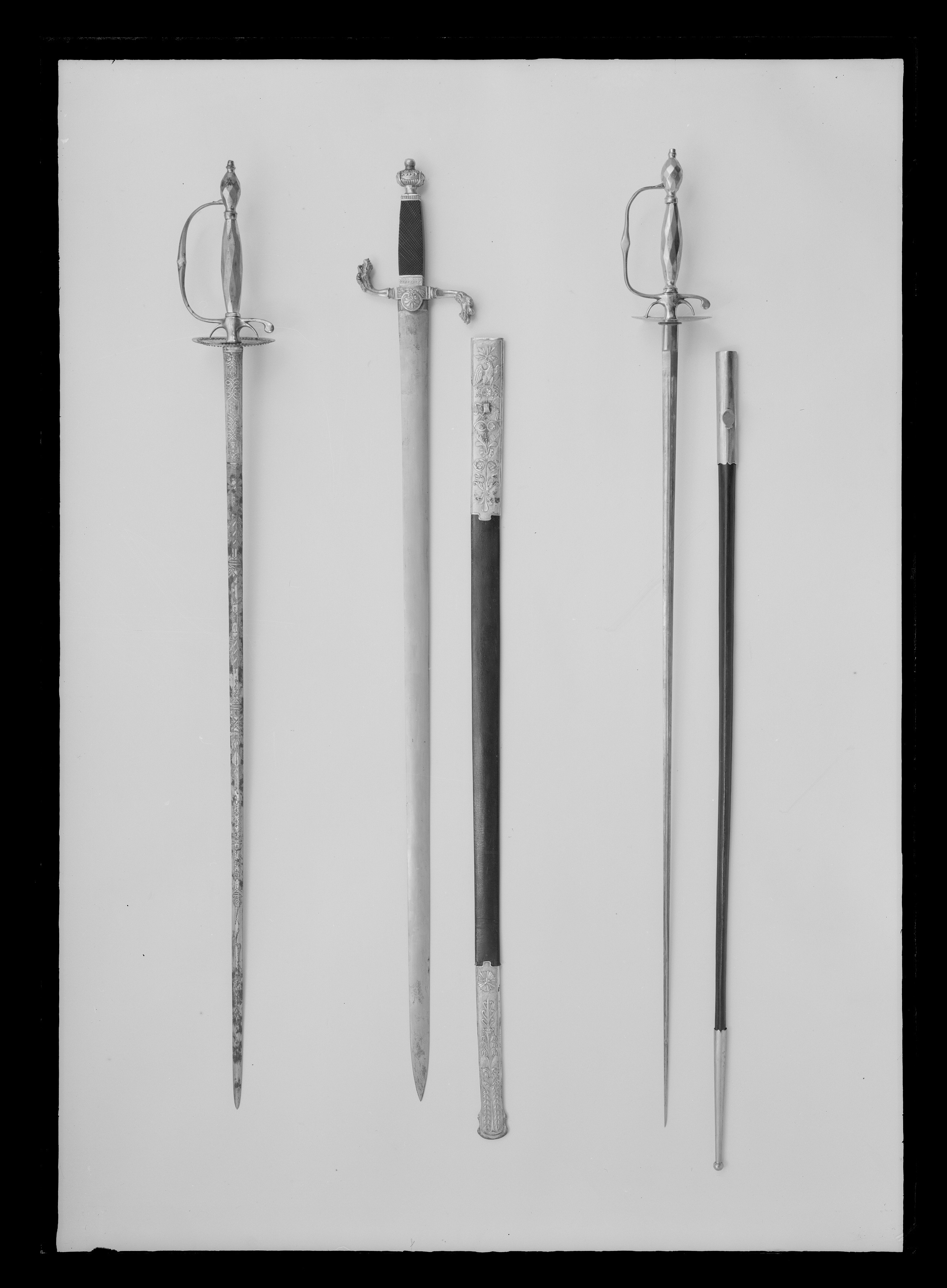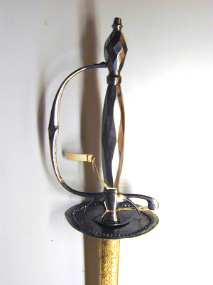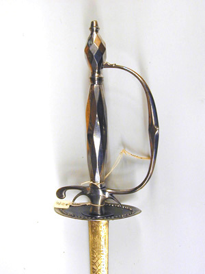 Fäste av högglanspolerat stål med rombiskt fasettslipad ytornering på den vertikalt utdragna knappen och den spolformiga kaveln. Nitknapp hög, konisk. Handbygeln tunn, bågformig med vinkelformigt utvidgat mittparti. Bakre parerstång med nedåtböjd, rundad ytterände. Fingerbyglar små, tunna, tillsammans bildande en båge. Parerplåt rundoval, slät och på insidan med radiellt ordnade, konkava strålar runt en spetsoval stödbricka nedanför krysset. 5 mm innanför kanten en bård av fasettslipade nithuvuden, nitarna synliga på parerplåtens utsida. Klinga rak, tvåeggad med ca 111 mm långt, flackslipat basparti, i övrigt sexsidig. Ornering etsad och förgylld med varierande motiv täckande ytan fram till 90-100 mm från udden. Baspartiet på båda sidor helt förgyllt och med två grupper bandornament, som vid sidorna formats till öglor, i övrigt linje- och bandornament. Ornamentiken på klingan i övrigt på båda sidor lika, etsade och förgyllda figurmotiv, avtecknande sig mot en botten av klingans högglanspolerade yta. Närmast efter baspartiet en trofégrupp, en på bakbenen stående kronhjort, en trofégrupp med en oval sköld, vari ett ansikte, en trofégrupp som sträcker sig ur sitt skal