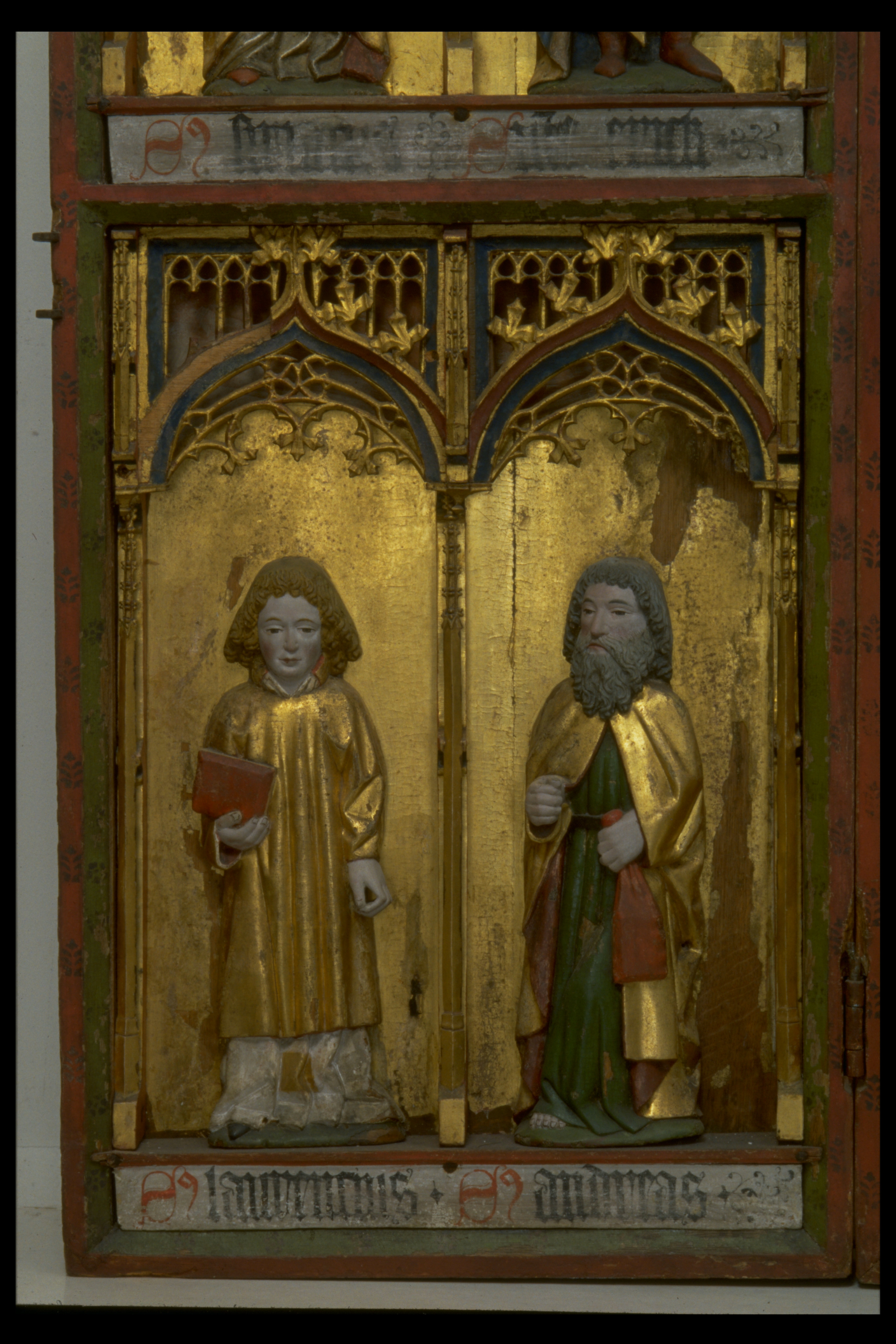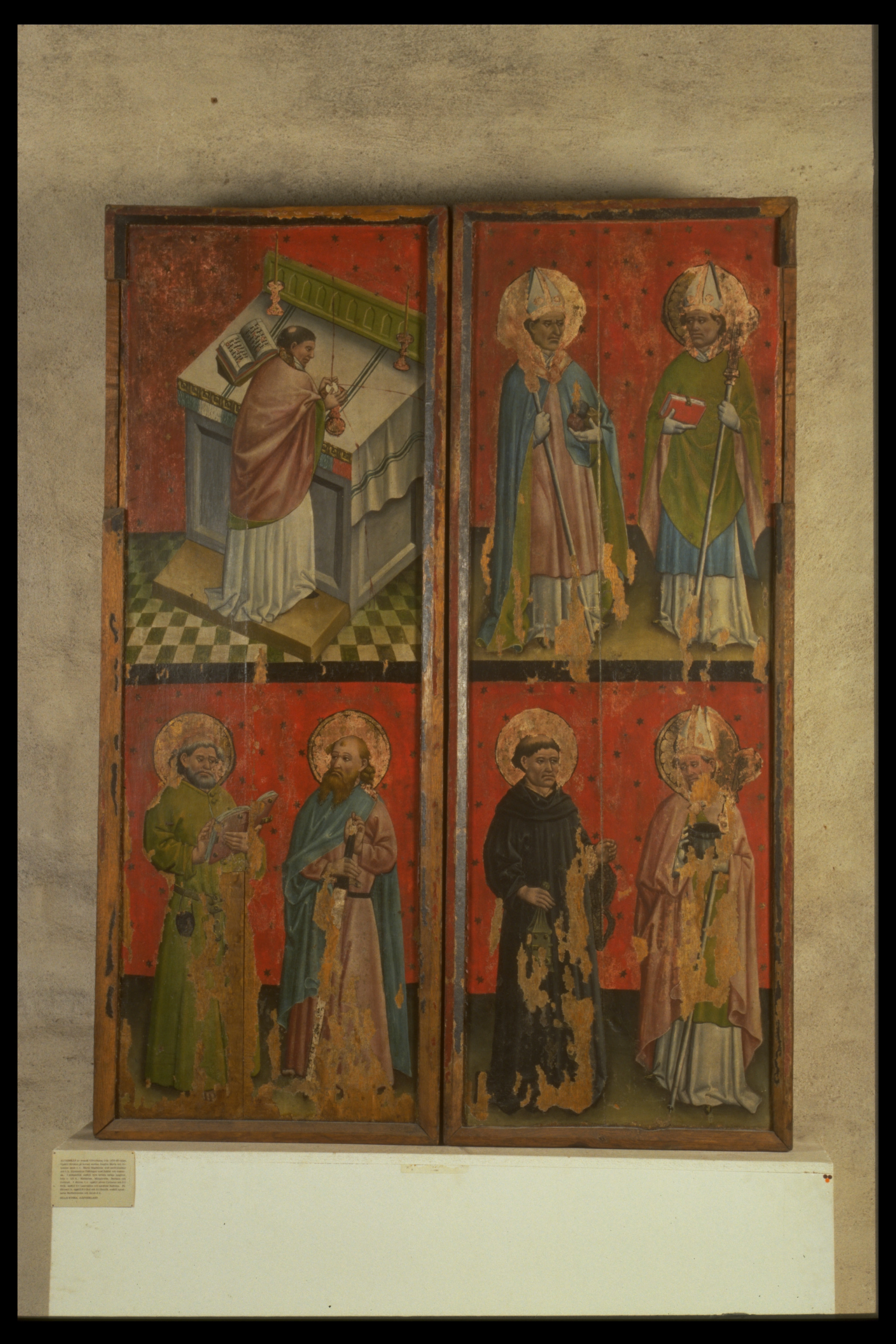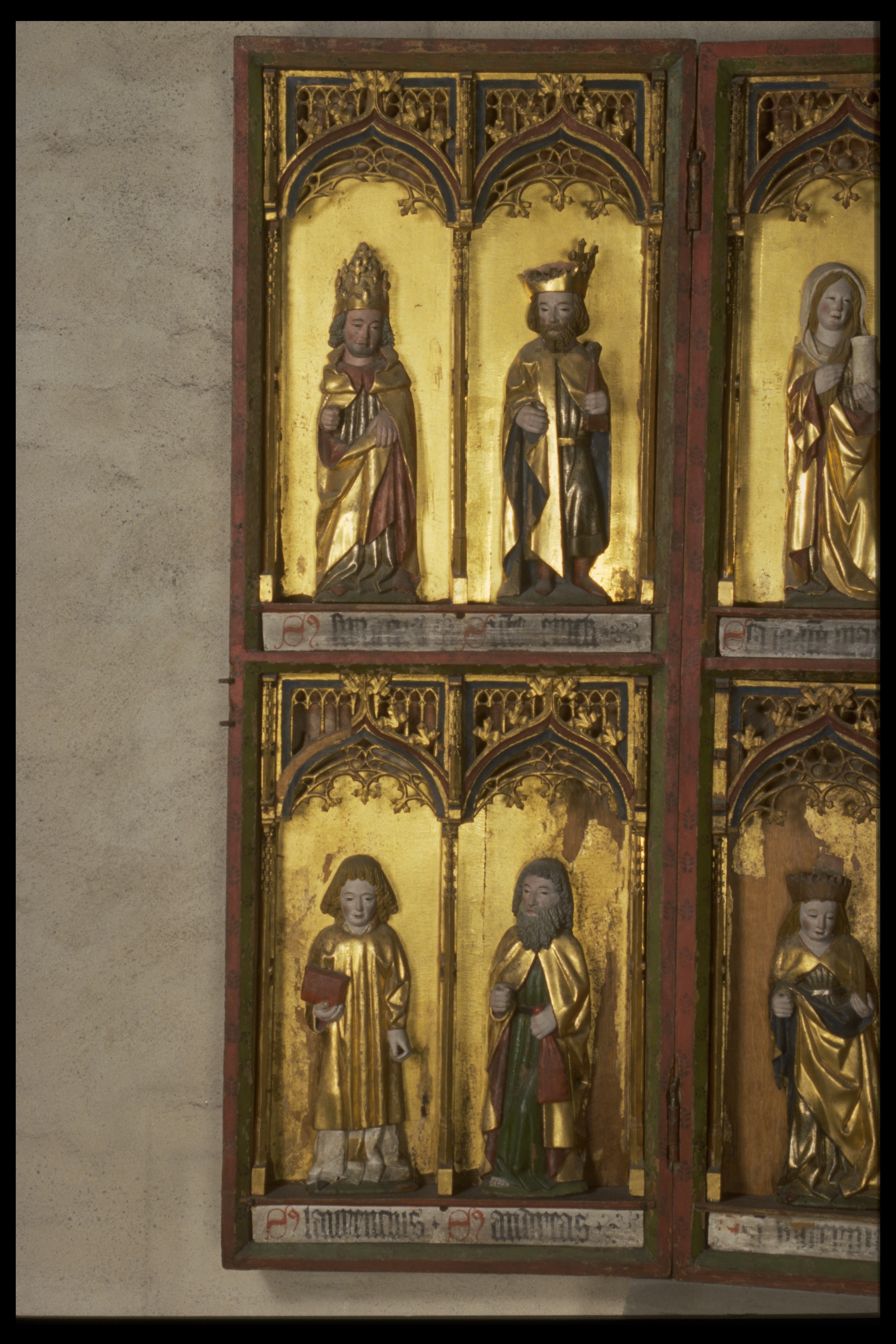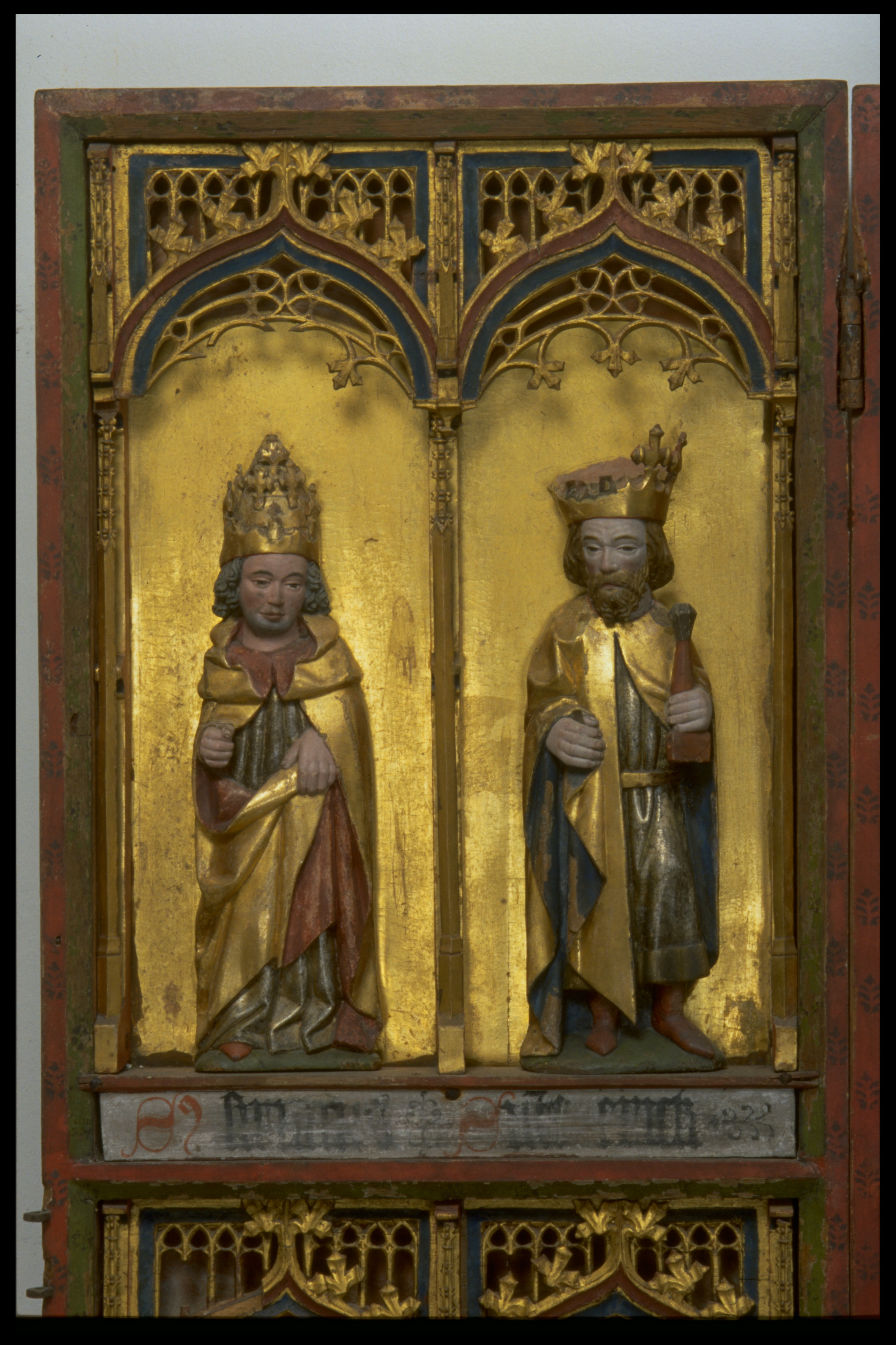 Kondition: god, några attribut bortfallna, några kronor skadade. Färg: skulpturens polykromi välbevarad, utsidornas pannåmålningar något skadade.