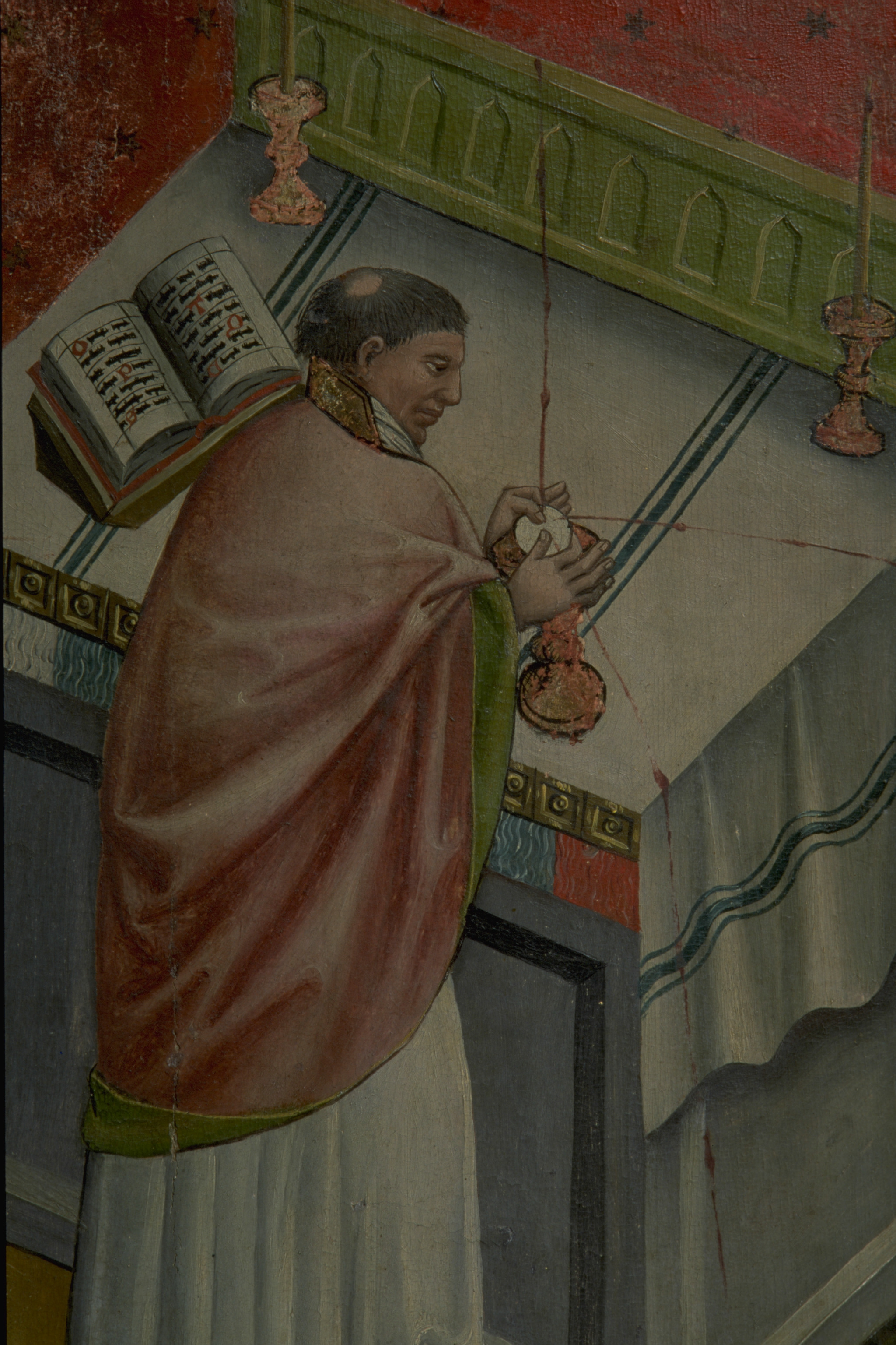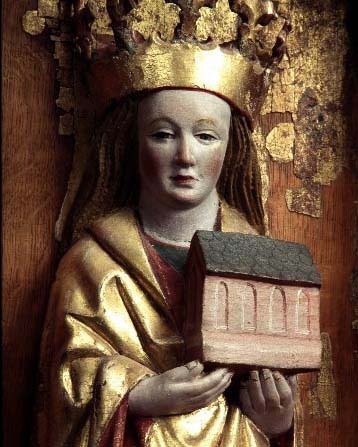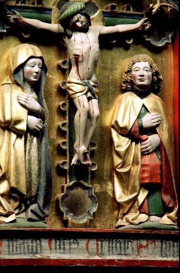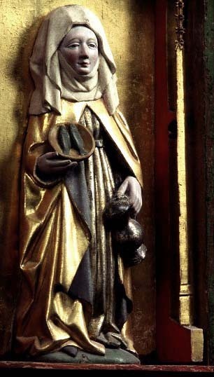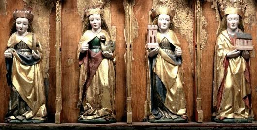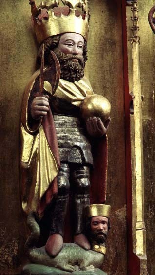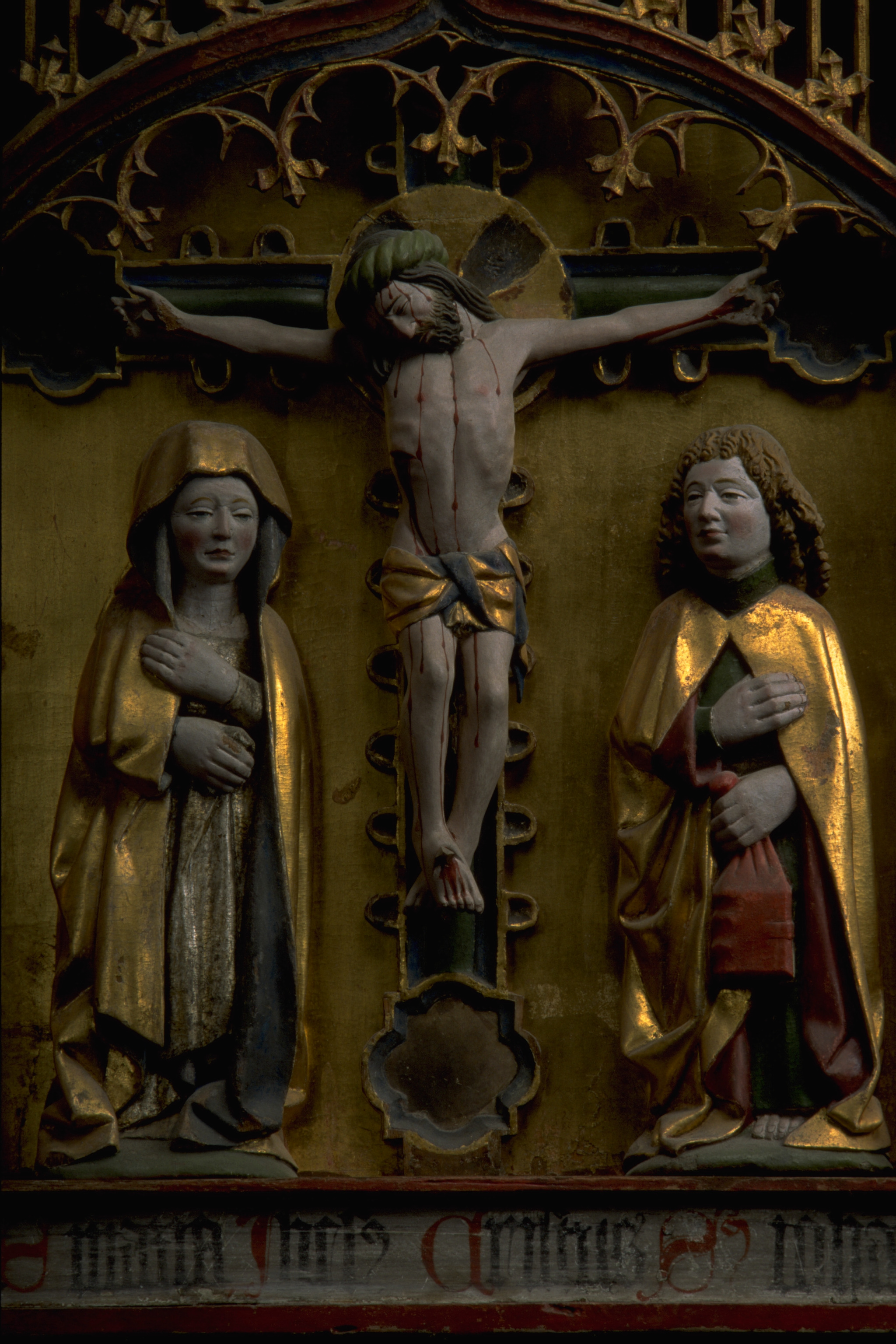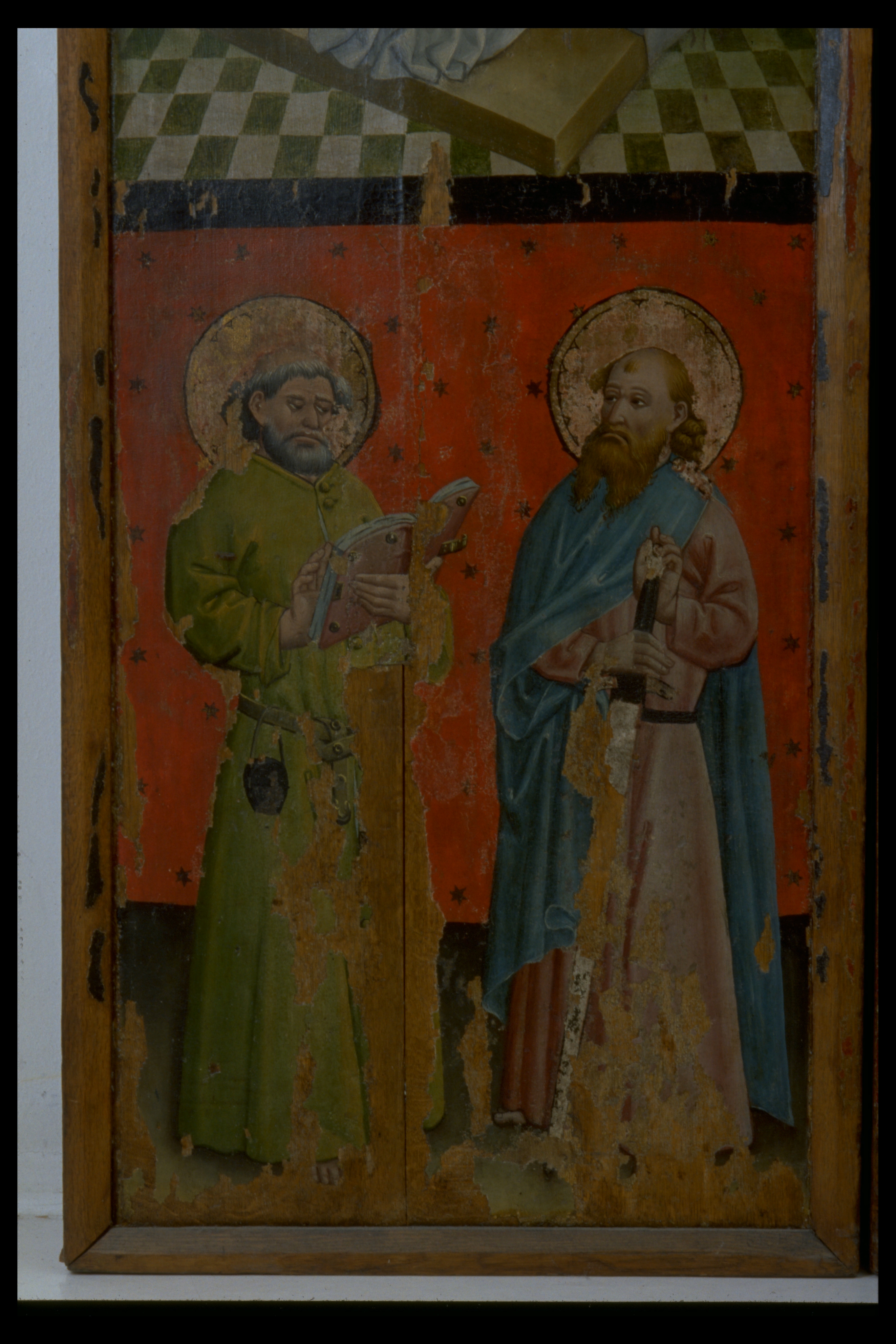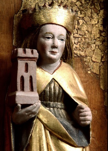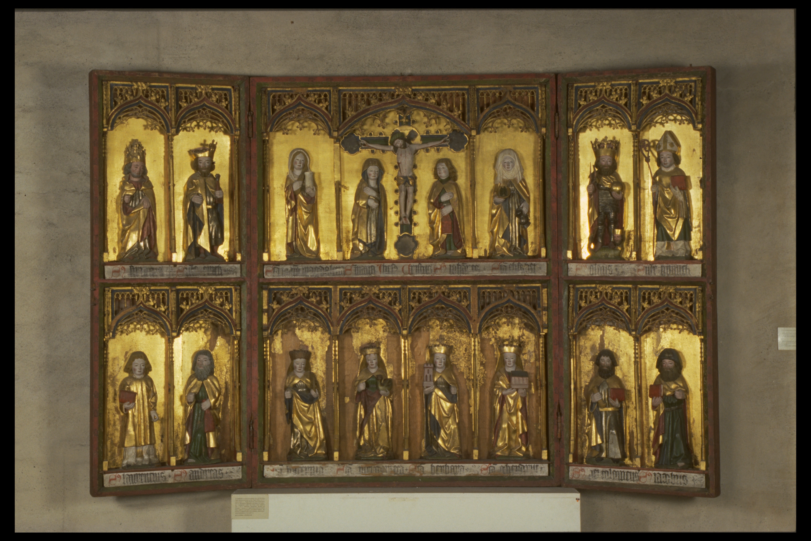 Kondition: god, några attribut bortfallna, några kronor skadade. Färg: skulpturens polykromi välbevarad, utsidornas pannåmålningar något skadade.