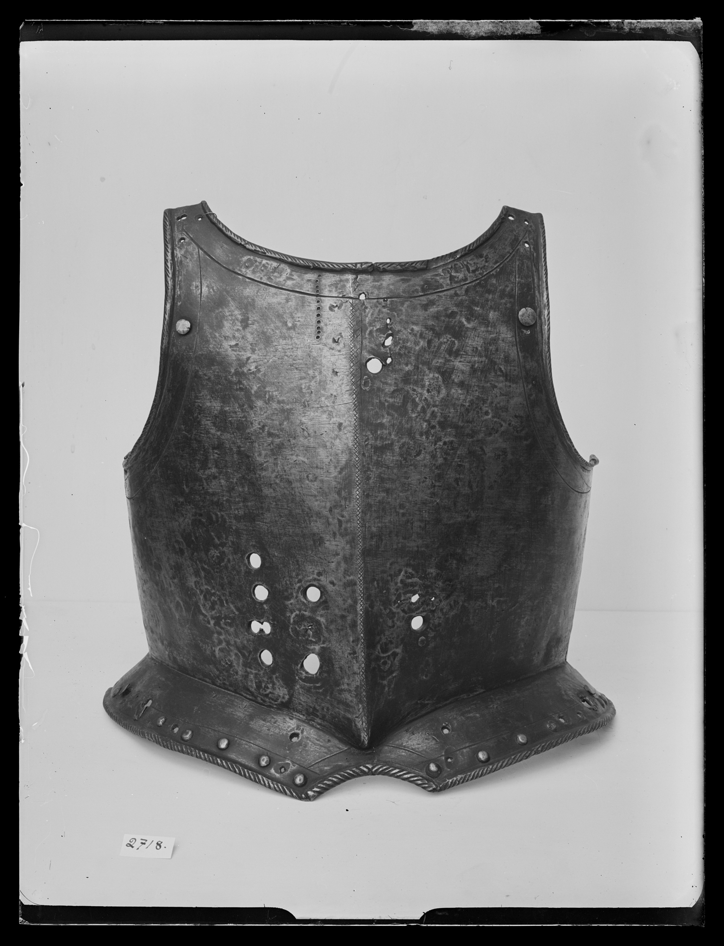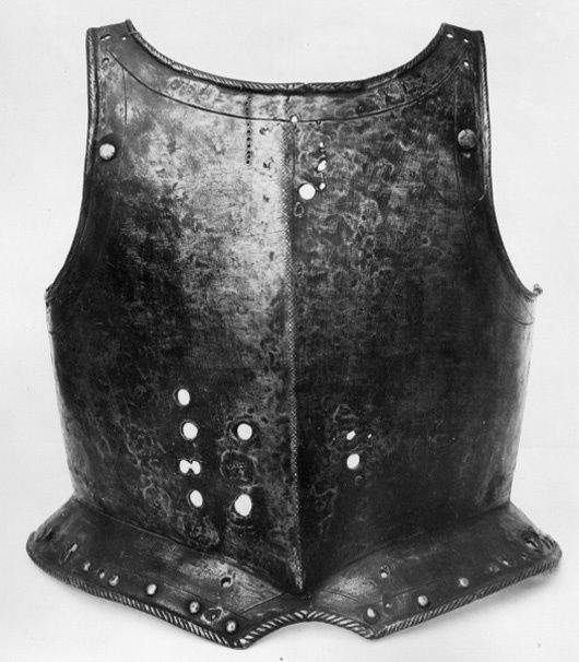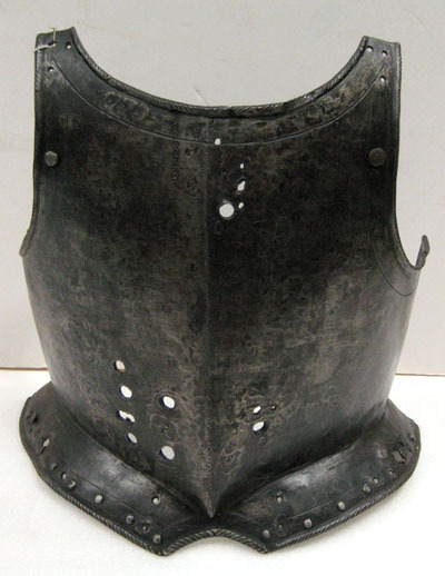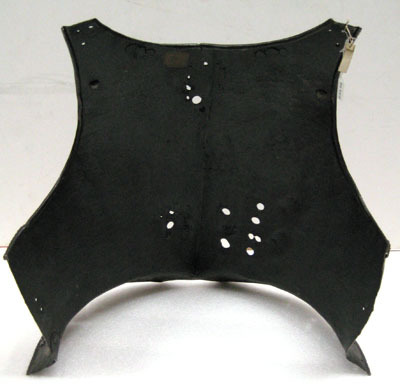 Stål drivet i ett stycke. Utsidan delvis blankslipad, troligen ursprungligen svart. Insidan svart med slagmärken. Tämligen rak över bröst och mage. Brett urtag för halsen med smala axler, B 30 mm. Rundade urtag för armarna med kanterna omvikta inåt, halskanten utåt, samtliga repstavsformiga. Tydlig mittås med liten spets nertill, ca 12 mm hög. Skört ca 57 mm brett med välvda sidor och 80 mm brett urtag i mitten. Kant som övriga. Enkel skuren kantlinje runt armar, hals och skört. Nitar i rad på skörtet. Nertill på bröstets högra sida sju hål för lanshake. På vänstersidan upptill och nertill flera hål, troligen för förstärkningsstycke. Punsat rutmönster över hela mittåsen. Under halskragen märkning i form av 12 punsade gropar satta i vertikal rad.