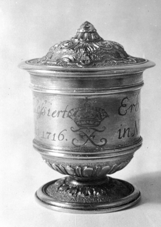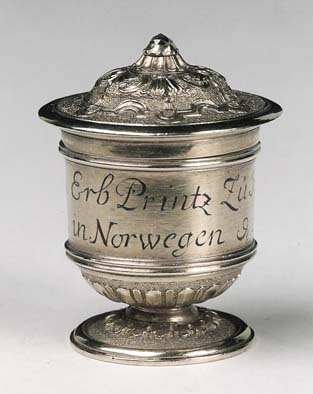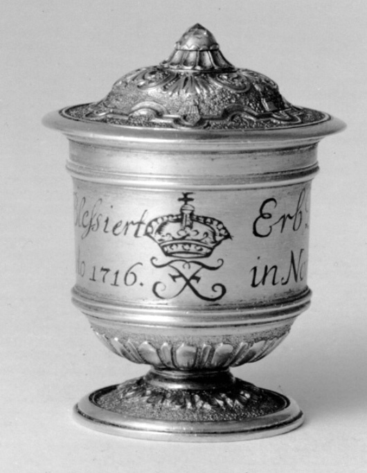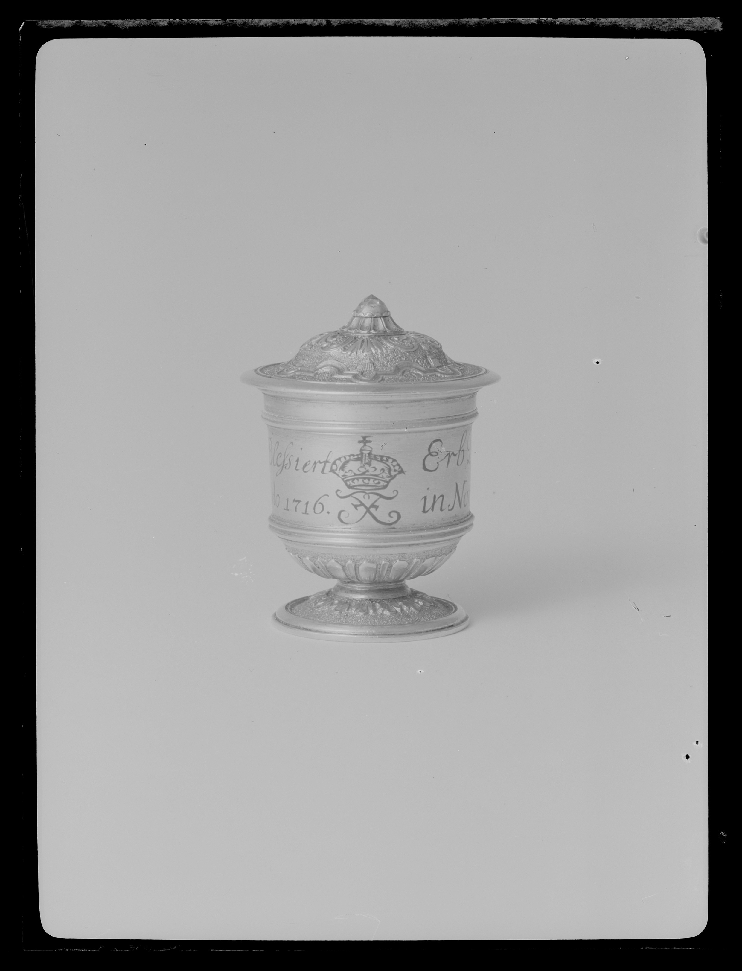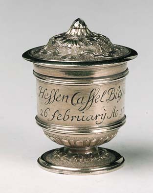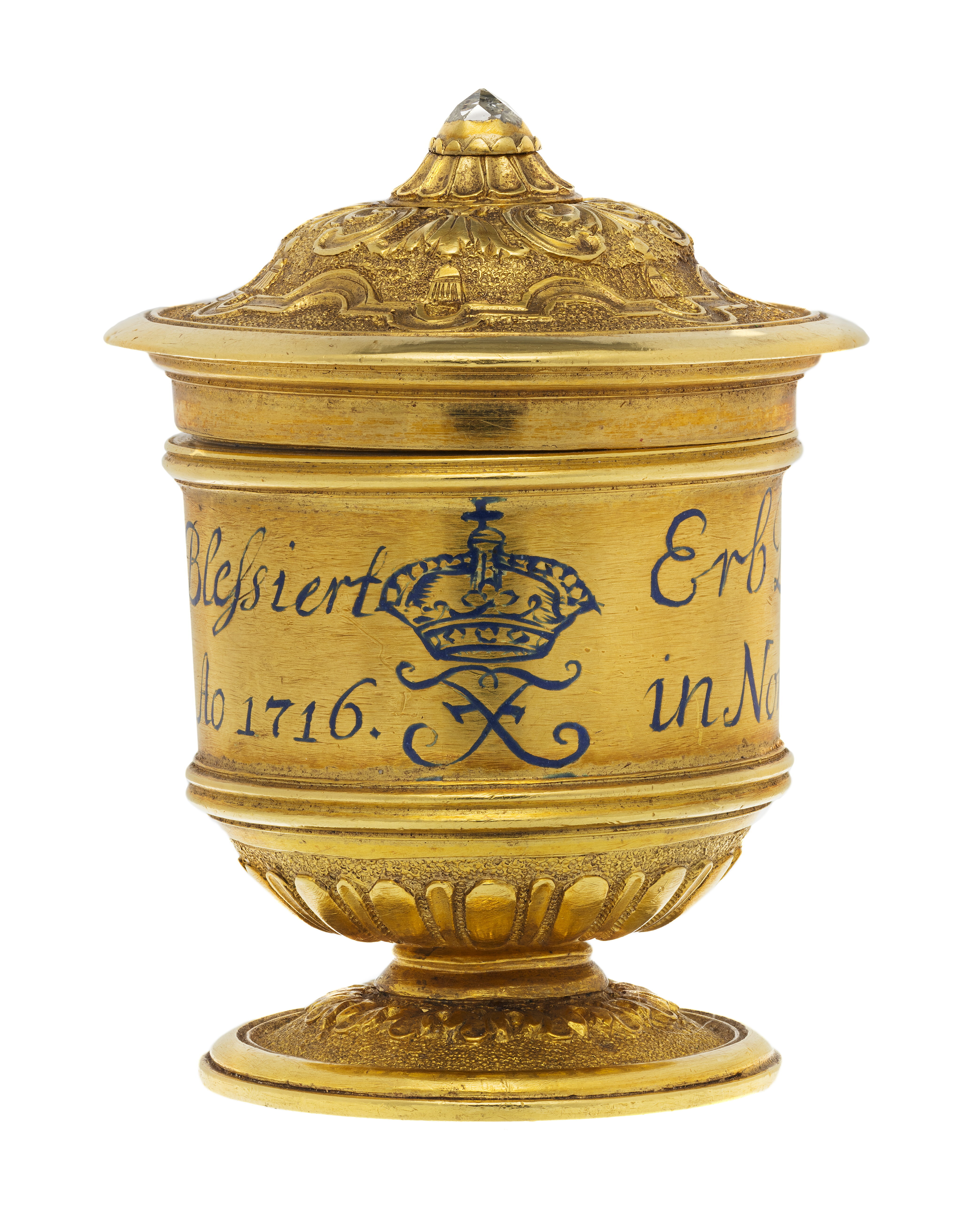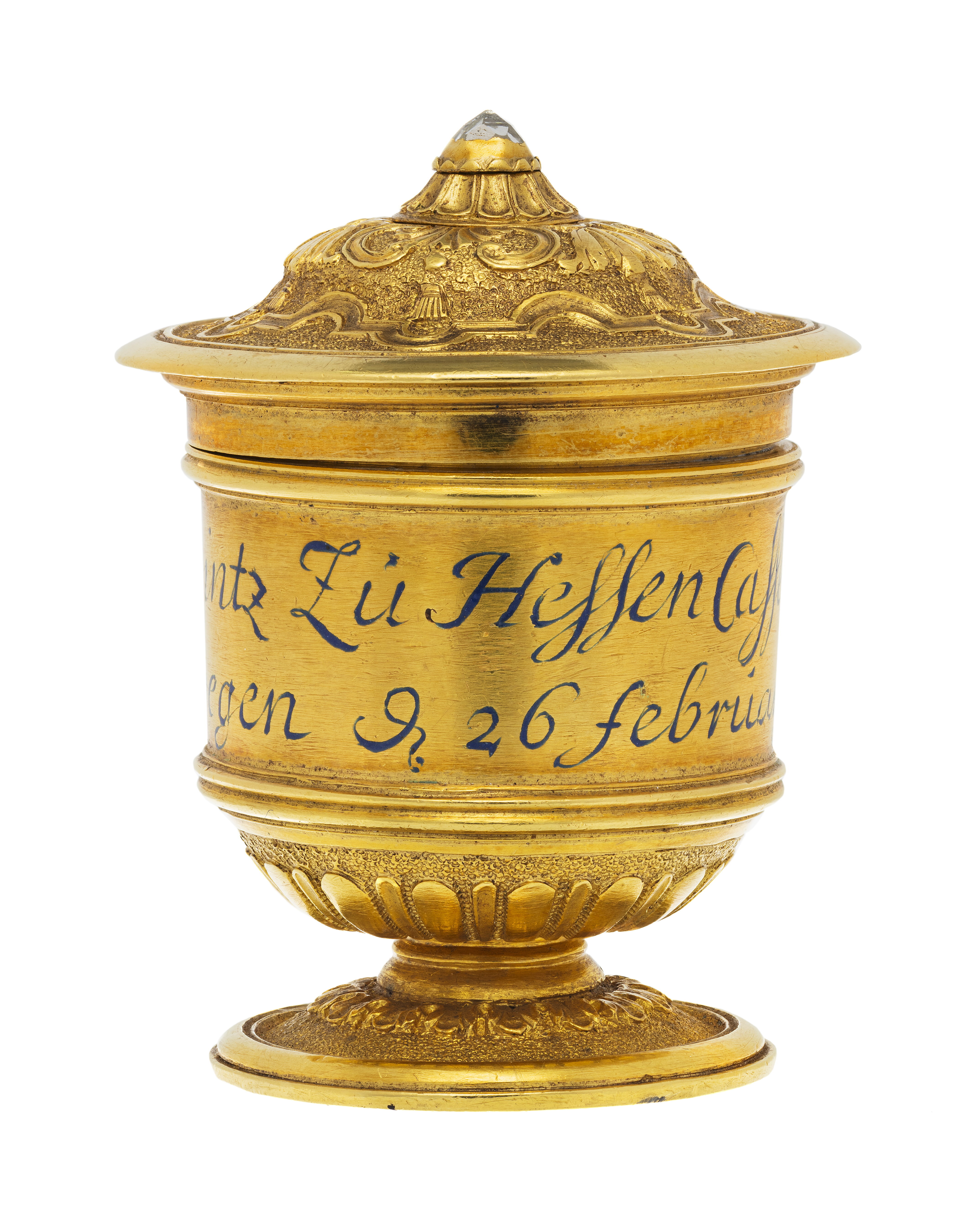 Avskruvbart lock med välvt mittparti, därpå kartusch i relief mot punsad botten, kantbård med sex in-och sex utböjningar, därinnanför c-formiga ornament samt bladknippen med nedhängande tofsar, i mitten en konisk knapp med trettonbladig blomma nertill, upptill infattat en rosensten, slät fattning av guld. Livet rakt, därpå graverad text, ifylld med blå emalj:"Erb Printz Zu Hessen Cassel Blessiert in Norwegen d. 25 februarij Ao 1716", samt spegelmonogram F under furstlig krona (Fredrik I). Skålformig undre del, dekorerad på utsidan med äggstavsbård mot punsad botten. Svagt välvd fot med slät kant, därinnanför punsat fält med bladstavsdekor runt skaftet. Kort, slätt skaft med tre ringar. Urnan invändigt klädd med blekröd sammet. I dosan förvaras starkt förvittrade rester av en blykula samt etikett med bläckpåskrift: "inv.1675".