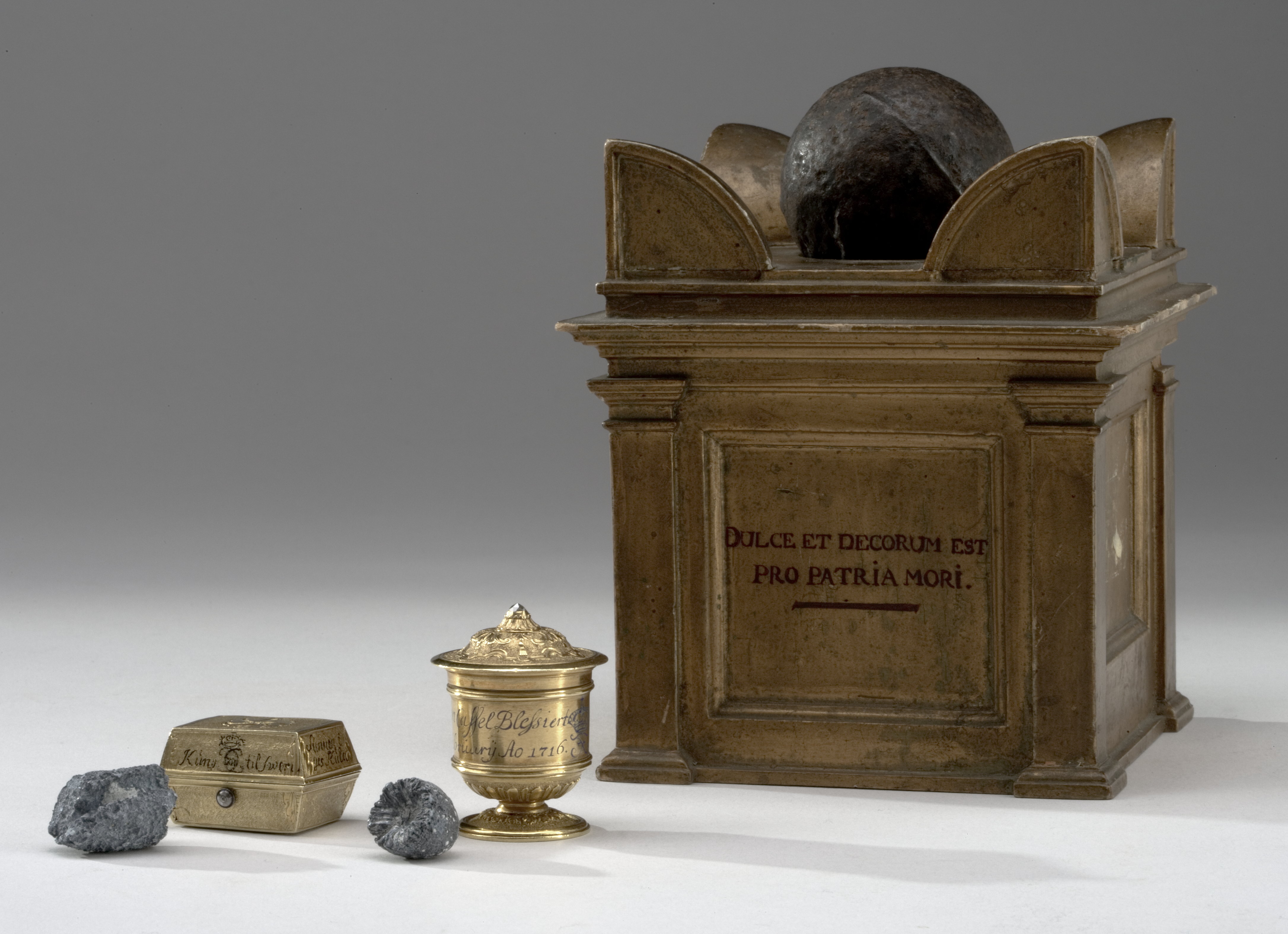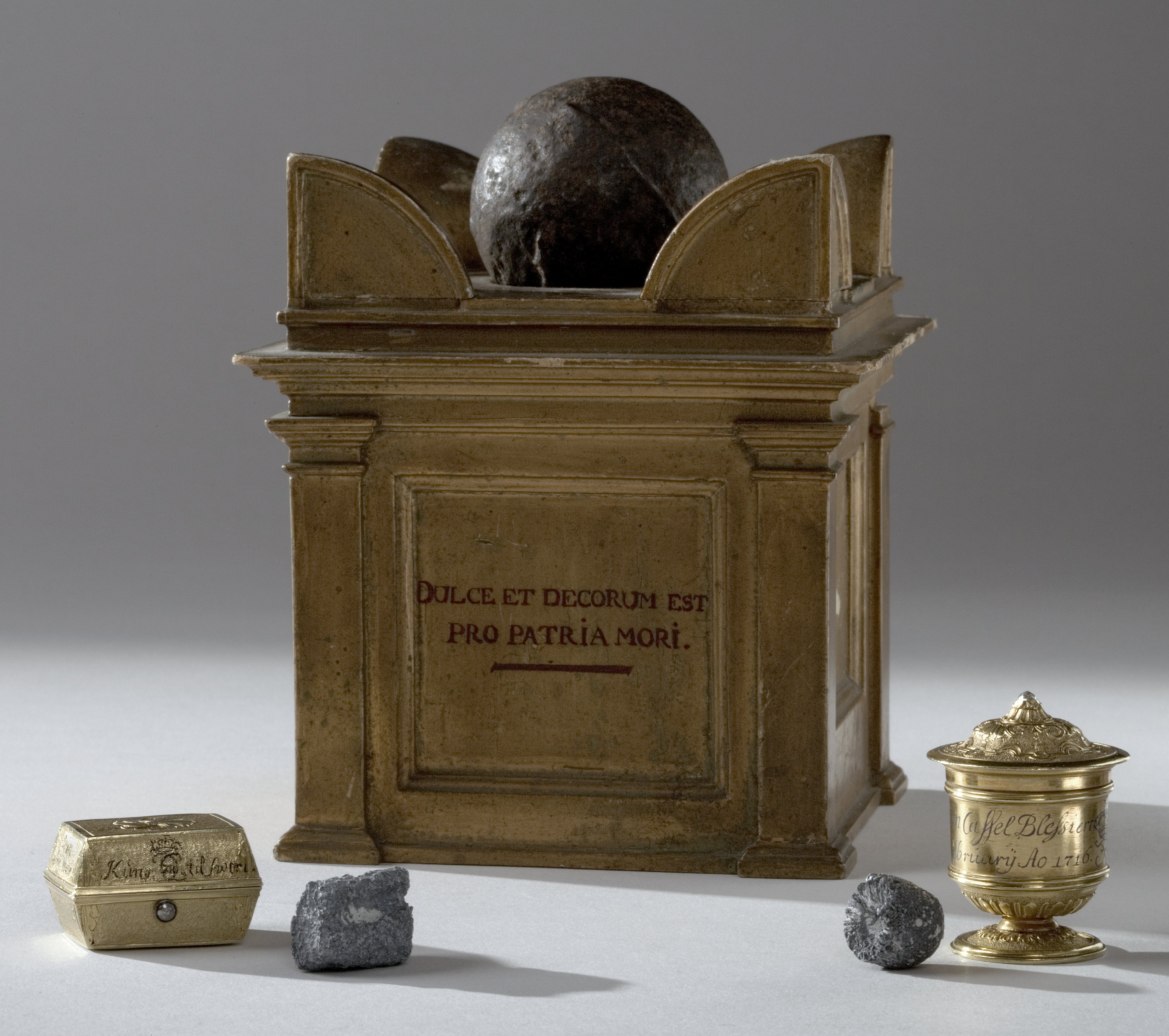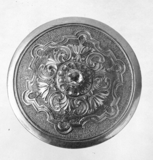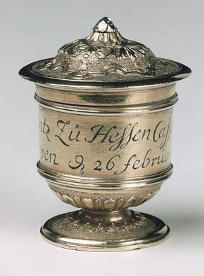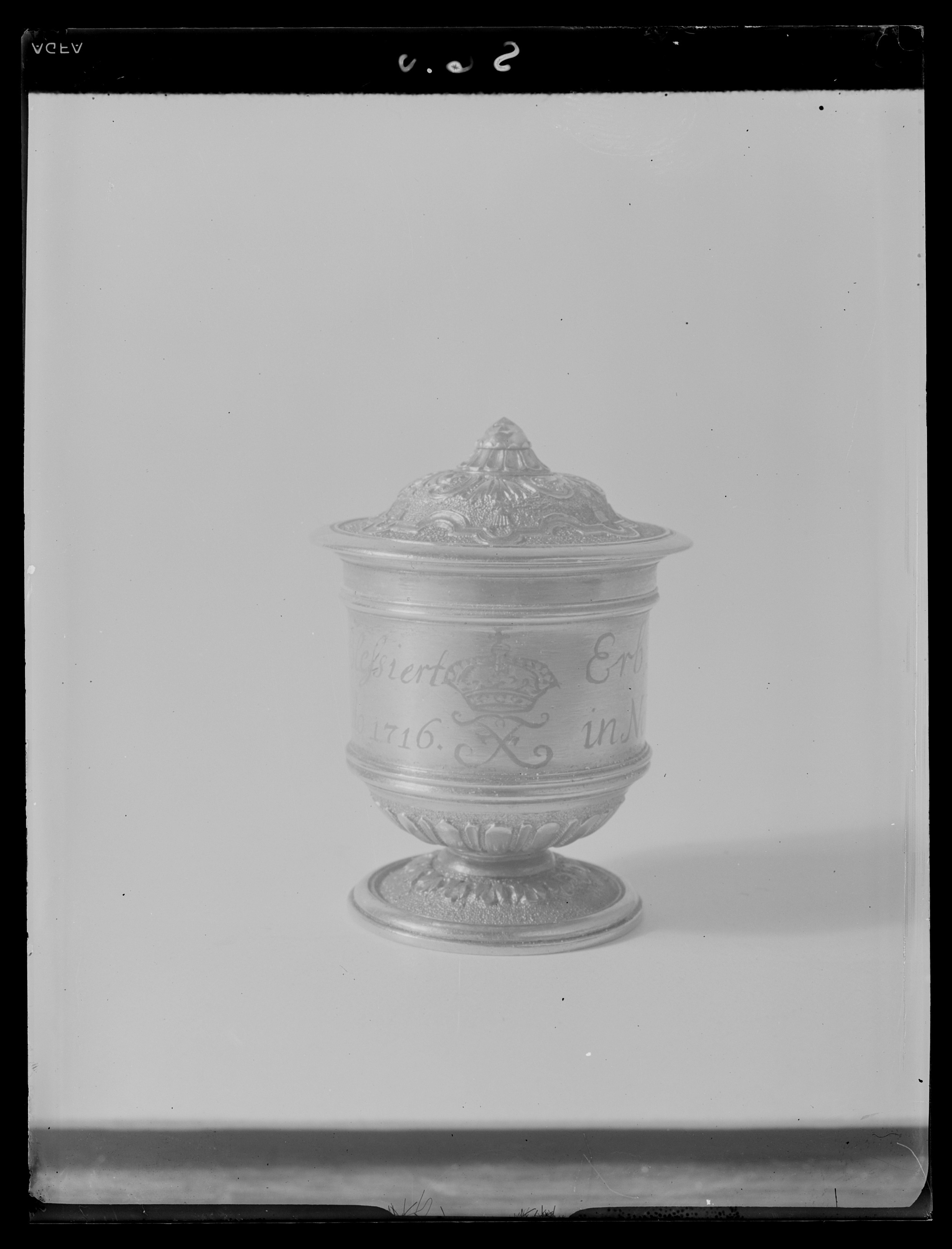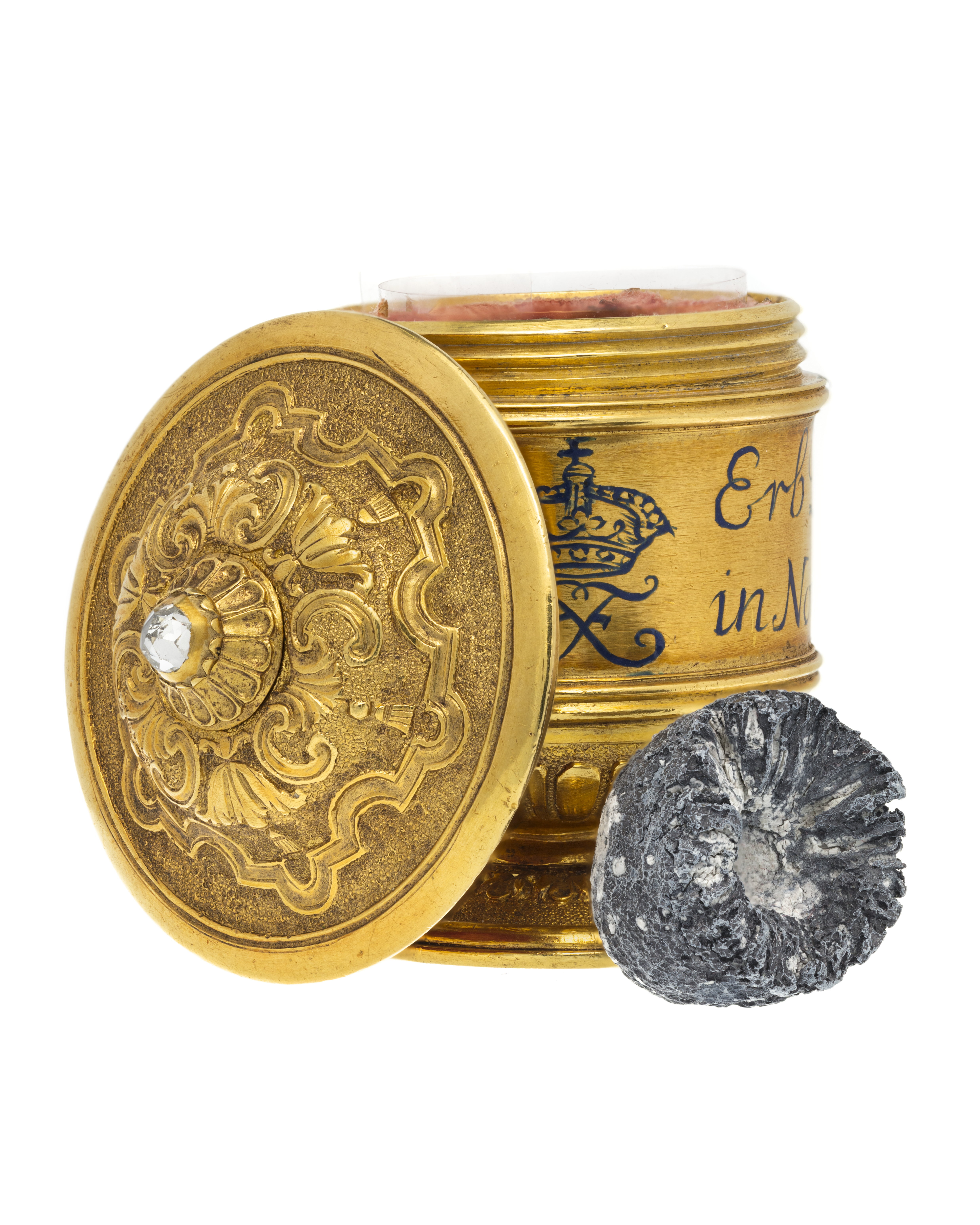 Avskruvbart lock med välvt mittparti, därpå kartusch i relief mot punsad botten, kantbård med sex in-och sex utböjningar, därinnanför c-formiga ornament samt bladknippen med nedhängande tofsar, i mitten en konisk knapp med trettonbladig blomma nertill, upptill infattat en rosensten, slät fattning av guld. Livet rakt, därpå graverad text, ifylld med blå emalj:"Erb Printz Zu Hessen Cassel Blessiert in Norwegen d. 25 februarij Ao 1716", samt spegelmonogram F under furstlig krona (Fredrik I). Skålformig undre del, dekorerad på utsidan med äggstavsbård mot punsad botten. Svagt välvd fot med slät kant, därinnanför punsat fält med bladstavsdekor runt skaftet. Kort, slätt skaft med tre ringar. Urnan invändigt klädd med blekröd sammet. I dosan förvaras starkt förvittrade rester av en blykula samt etikett med bläckpåskrift: "inv.1675".