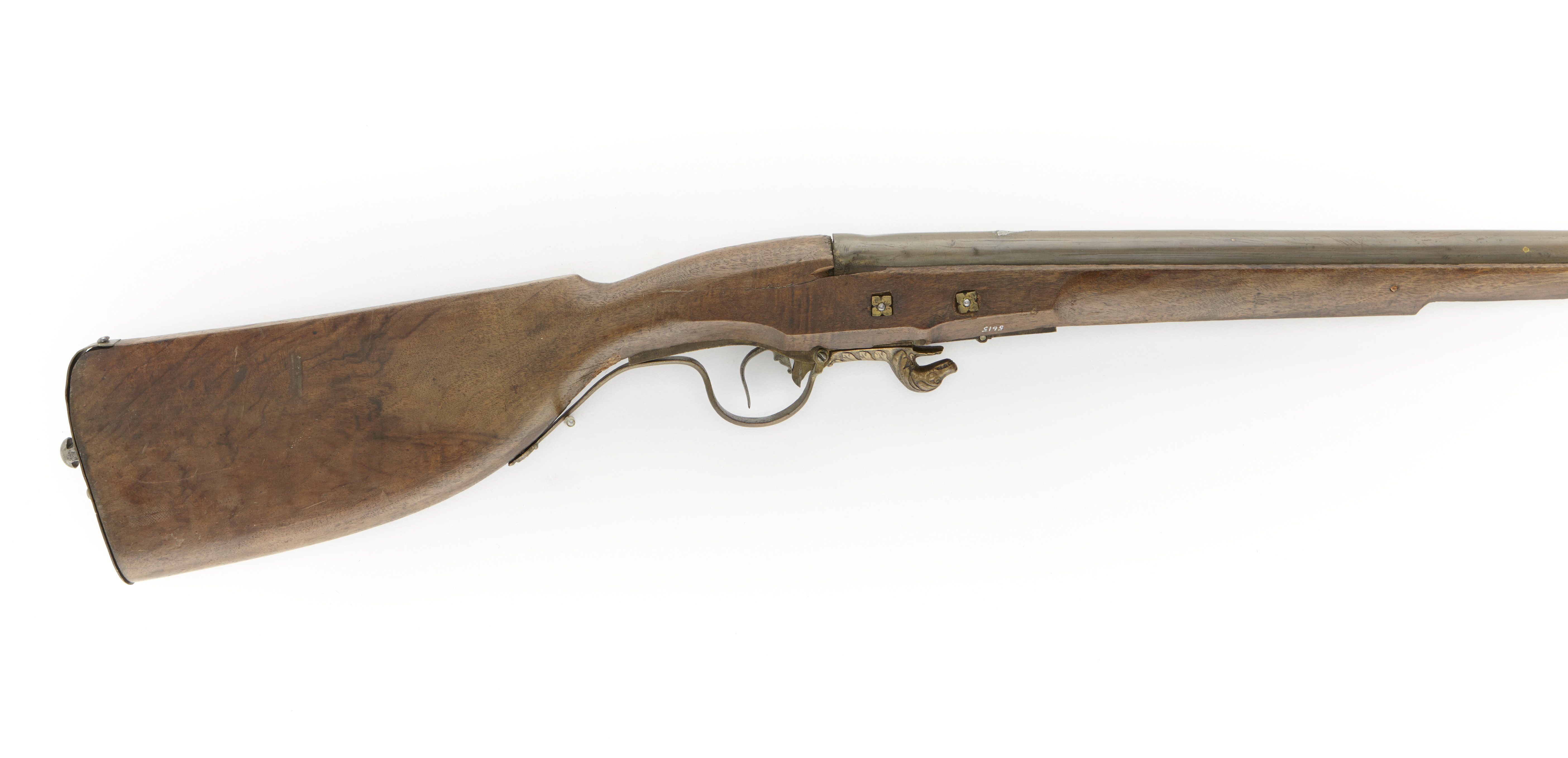 1710 års inventarium p. 6, rum I: "26-308-1 Messingz wäderbyssa med brett anslag . . . " Rund, slätborrad pipa av mässing, dubbel, bildar recipient. På kammaren inlagt triangulär platta av tenn (sikte). Knoppkorn av mässing. Luftpumpen ligger inuti kolven. Lås på stockens undersida. Hane i form av hunhuvud i mässing. Hel stock av valnöt. Fransk kolvtyp. Bakplåt av mässing, luftpumpen sticker ut genom bakplåten - i form av profilerad knopp. Två låsskruvar med muttrar av mässing. Pipan fäst i rännan med tre pipstift, ej ursprungliga. Näsband samt en + två rörkor av mässing. Varbygel av mässing, fransk typ. Utan tillbehör. Märkt: 308 på kolvhalsens högra sida. 56 med blyerts på kolvens högra sida.
