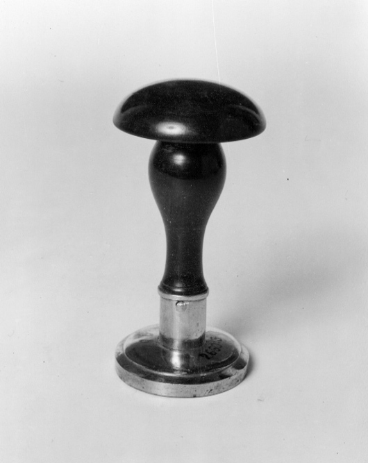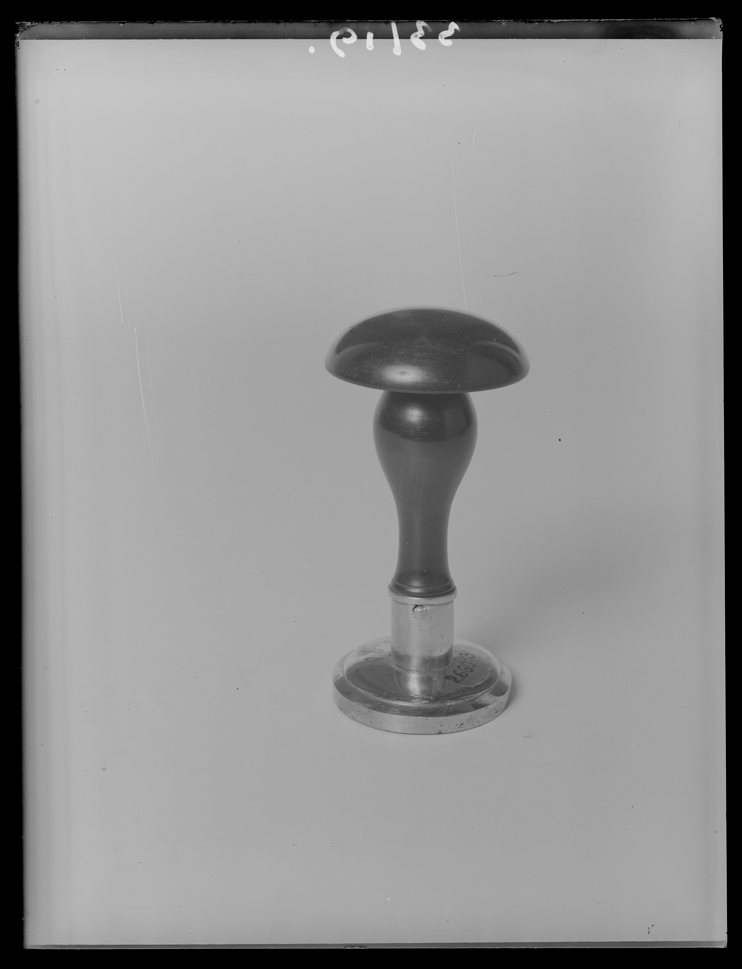 Oval platta av stål, däri graverat vapen med skraffering för de heraldiska färgerna, sköld av fransk typ delad med stolpe, tre kronor, folkungalejonet. Runt skölden hänger kedjor för Nordstjärne- , Svärds-och Serafimerorden, nederst, svärd för riddare med stora korset av Svärdsorden. Däromkring vapentält med skraffering för blått, strödda öppna kronor. Tältet krönt med svensk kronprinskrona. Enkel kantlinje. Plattans ovansida svagt välvd, cylindrisk holk. Svarvat skaft av ebenholts (?), upptill rund skiva, d: 40 mm, välvd ovansida, skålad undersida.