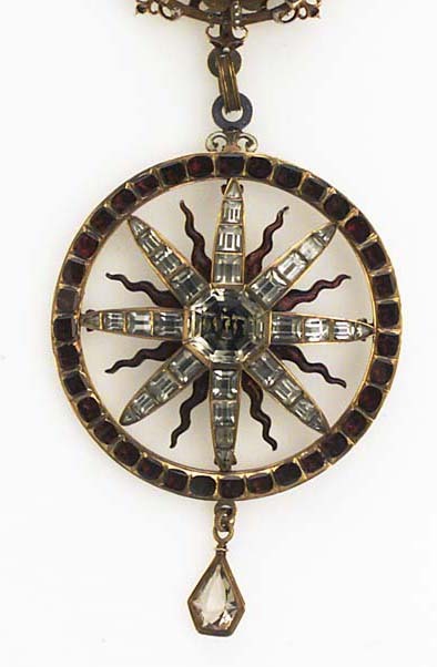 Åttauddig stjärna av guld med infattat 32 bergskristaller. I mitten en åttsidig bergkristall med fasetterade kanter, b:17 mm, avdeckt fattning, i stenen ingraverat tetragram med hebreiska bokstäver ifyllda med guld: JEHOVA. Mellan stjärnans spetsar åtta böljande, rödemaljerade strålar. Runt stjärnan en ring, b:6 mm, besatt med 34 granater, på ringens ytterkant vit emaljbård. Upptill på ringen en ring fäst med bladornament, blå och vit emaljdekor. På ringens och stjärnans baksidor blå cellemalj. I mitten flack buckla i genombrutet arbete med dekor i rött guld, vit, röd och ljusblå emalj. Under klenoden hänger en droppformig, fasettslipad bergkristall, h:16 mm, b:12 mm, tjocklek: 8 mm, fattning a jour.