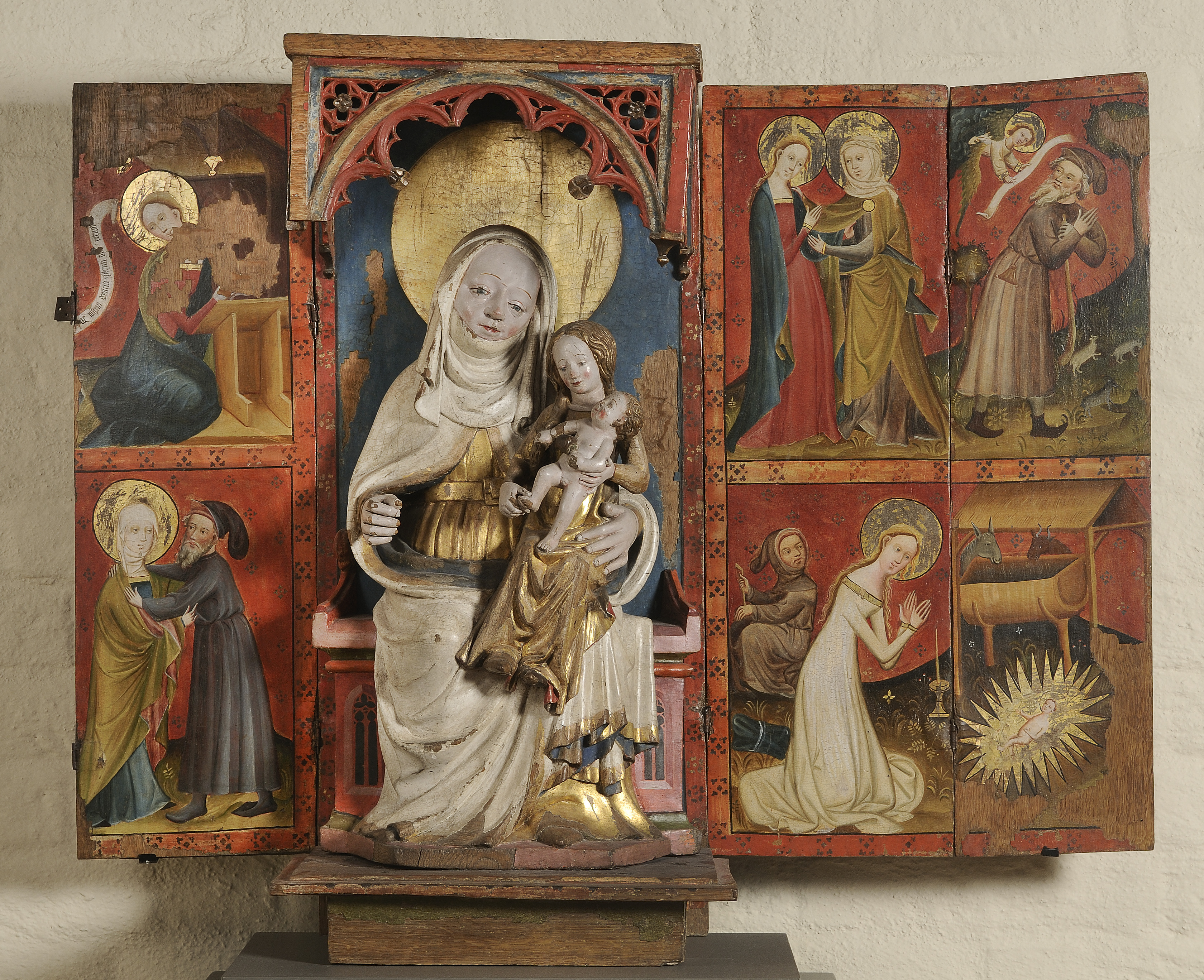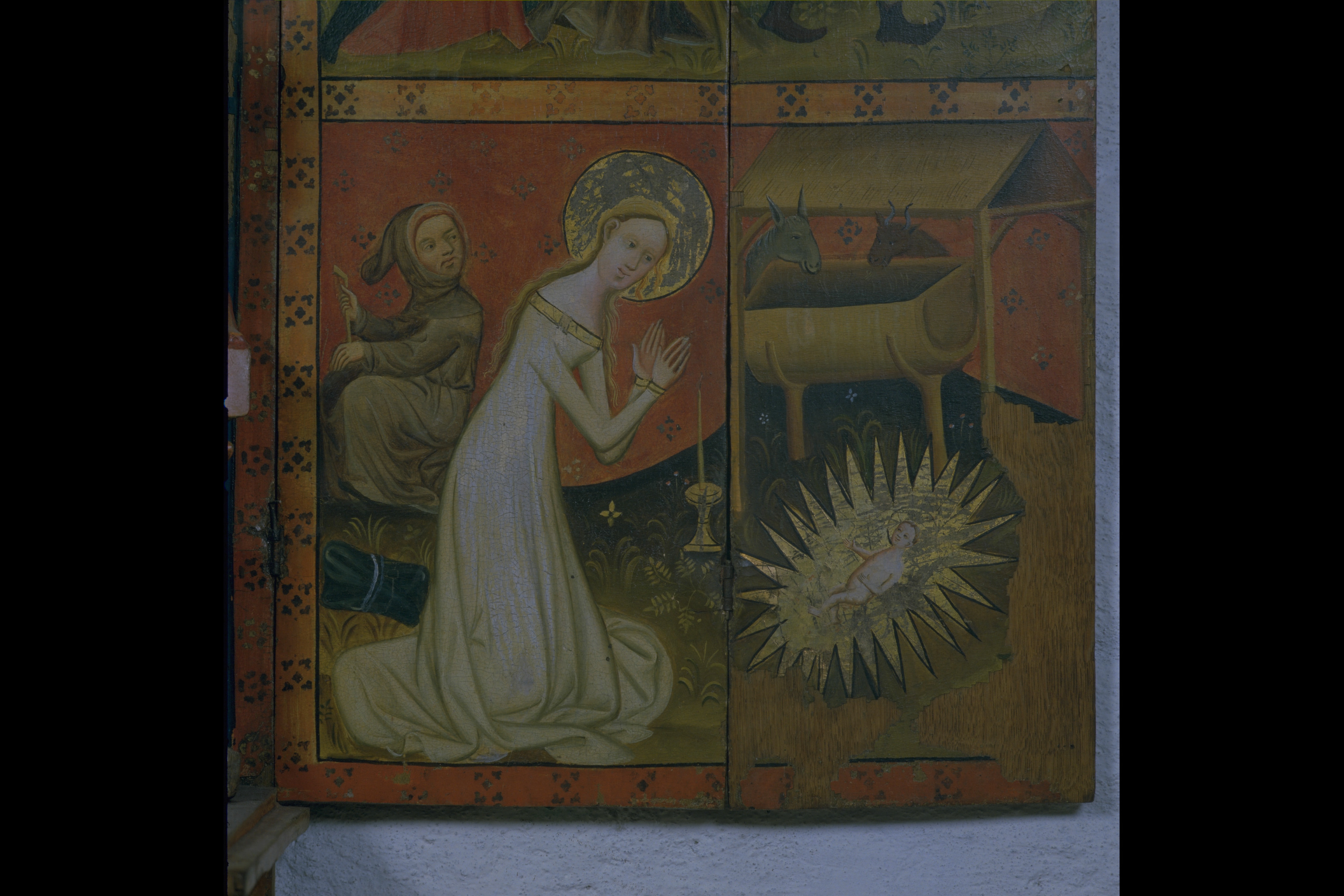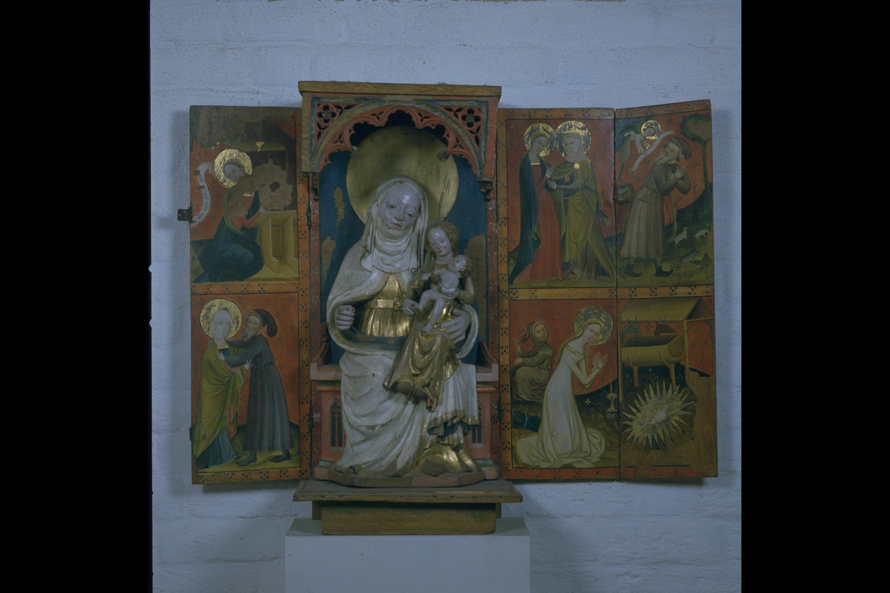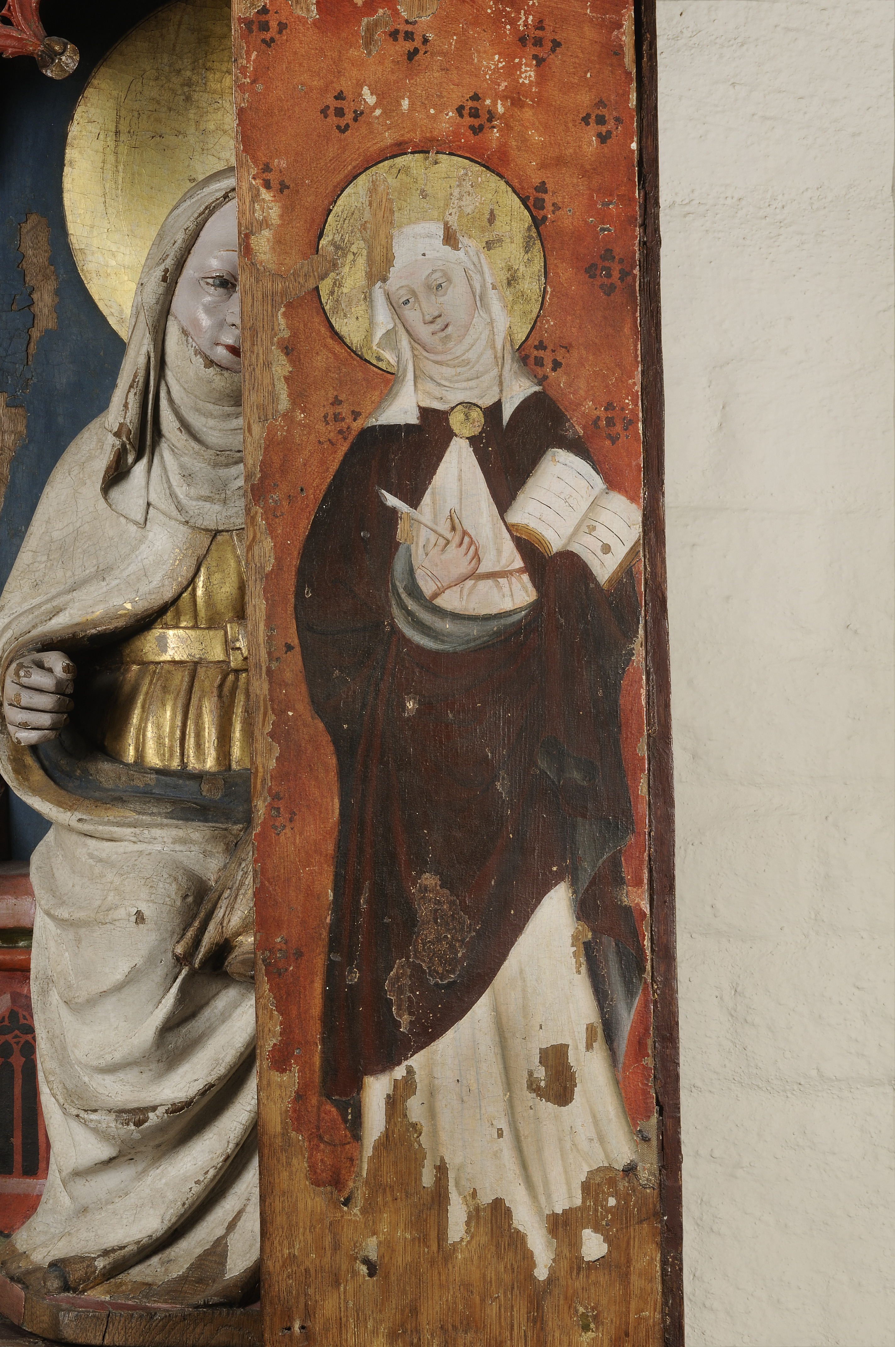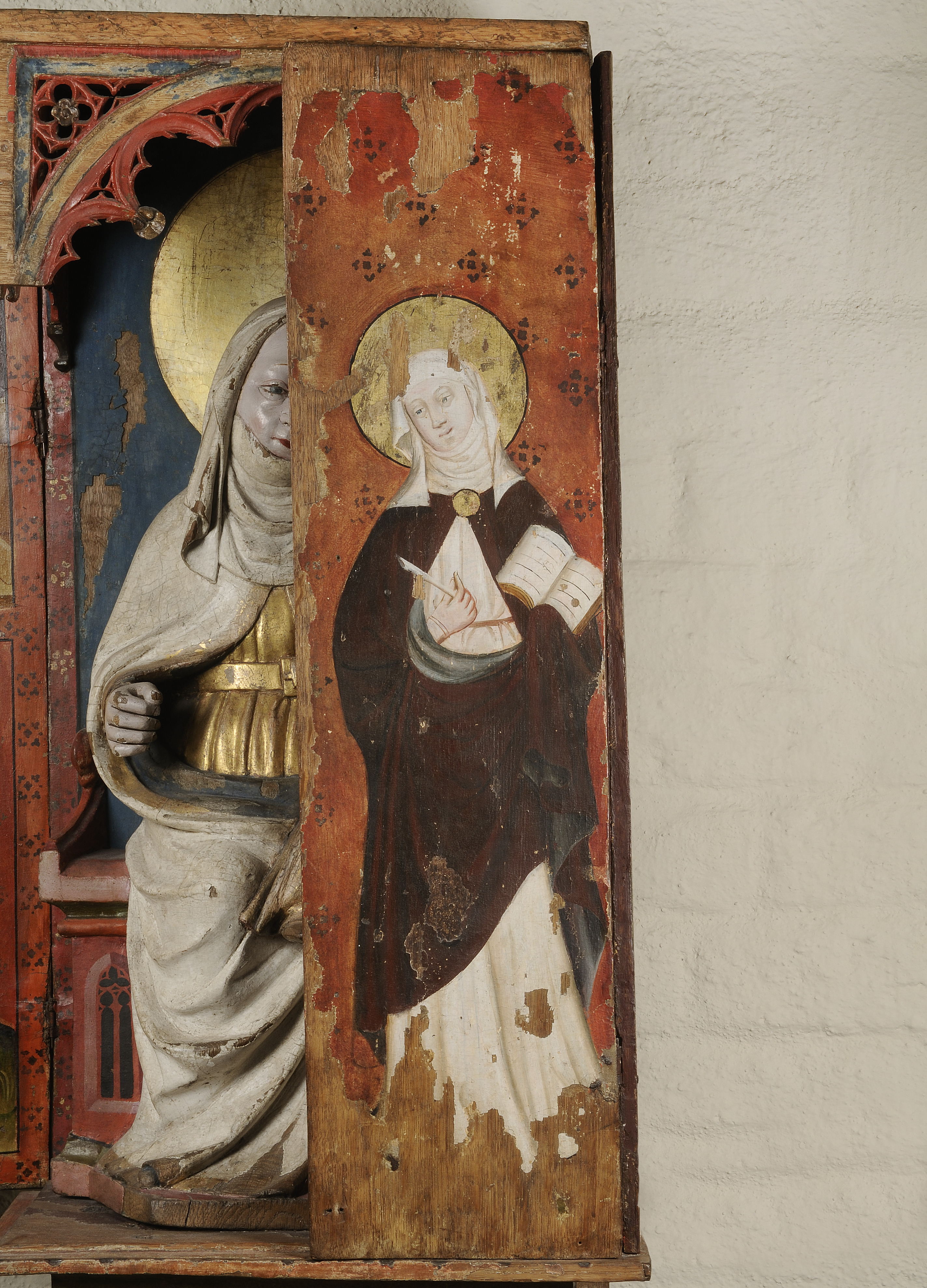 Kondition: vänstra, yttre flygeldörren förlorad, men för övrigt endast ringa bortfall. Färg: god, delar av pannåmålningarna bortfallna, men bevarade partier i god kondition.