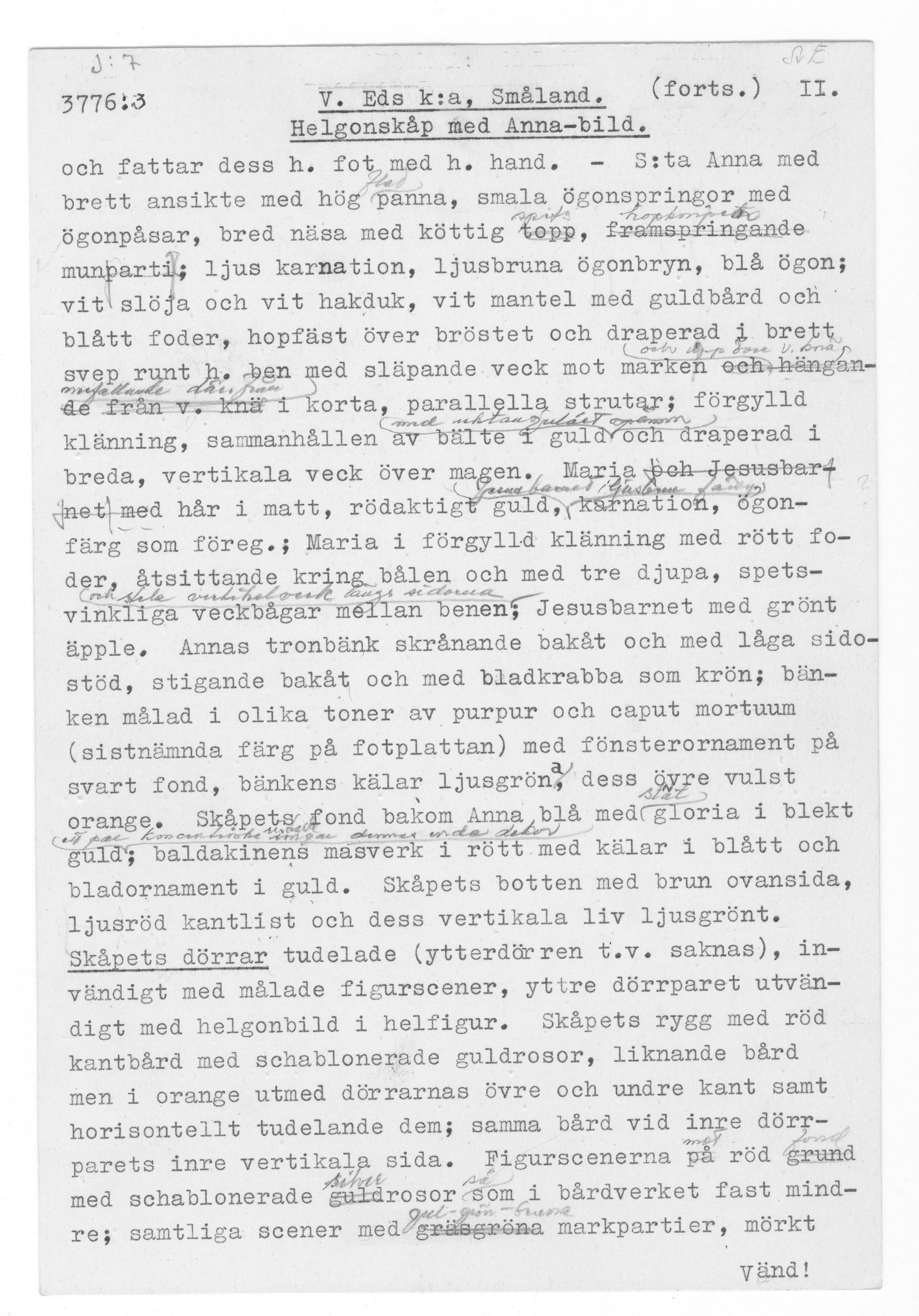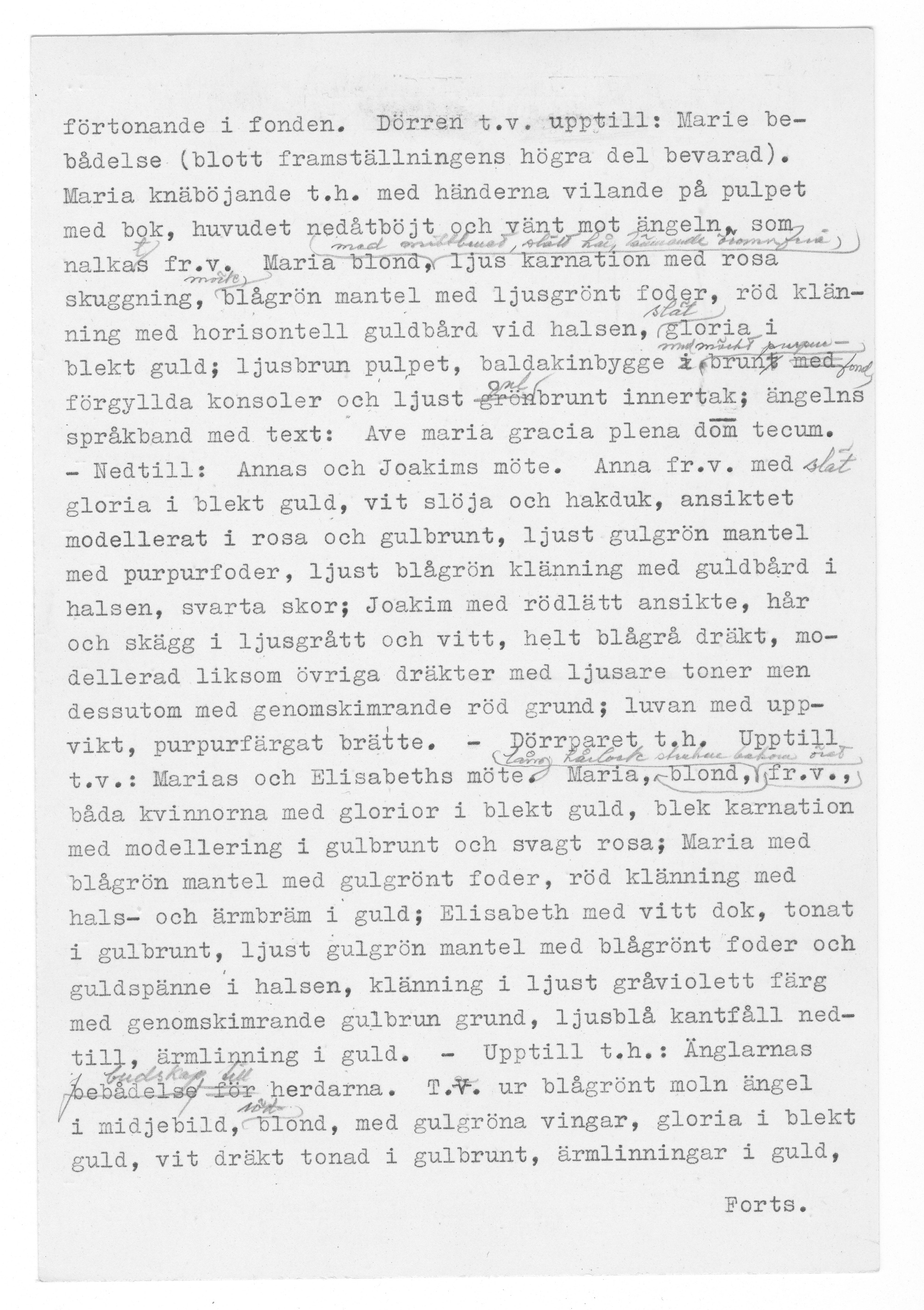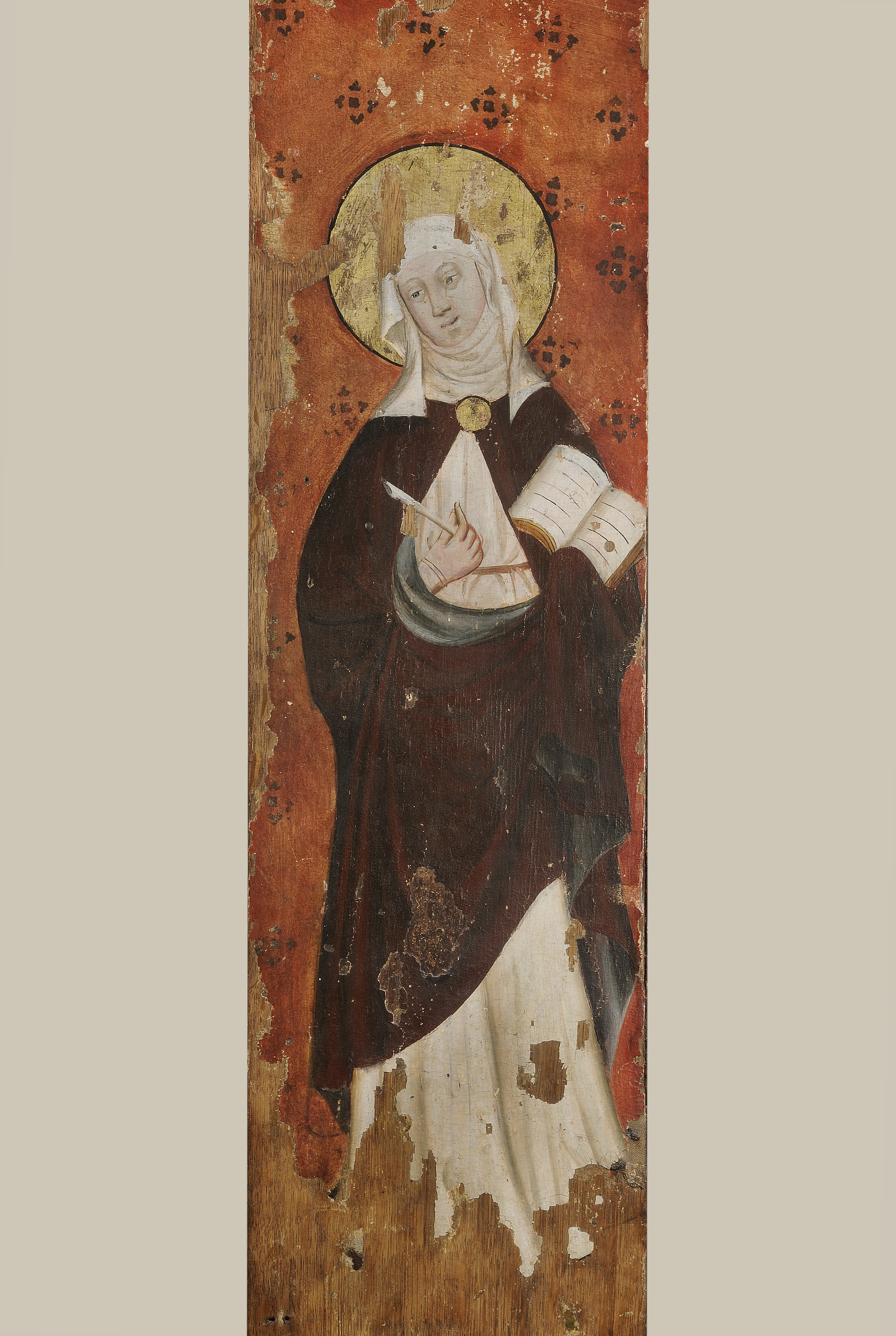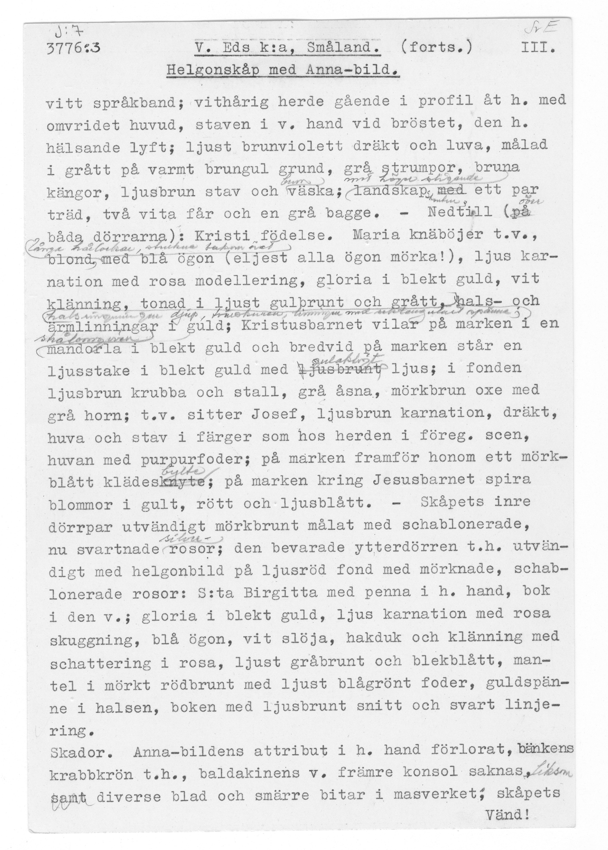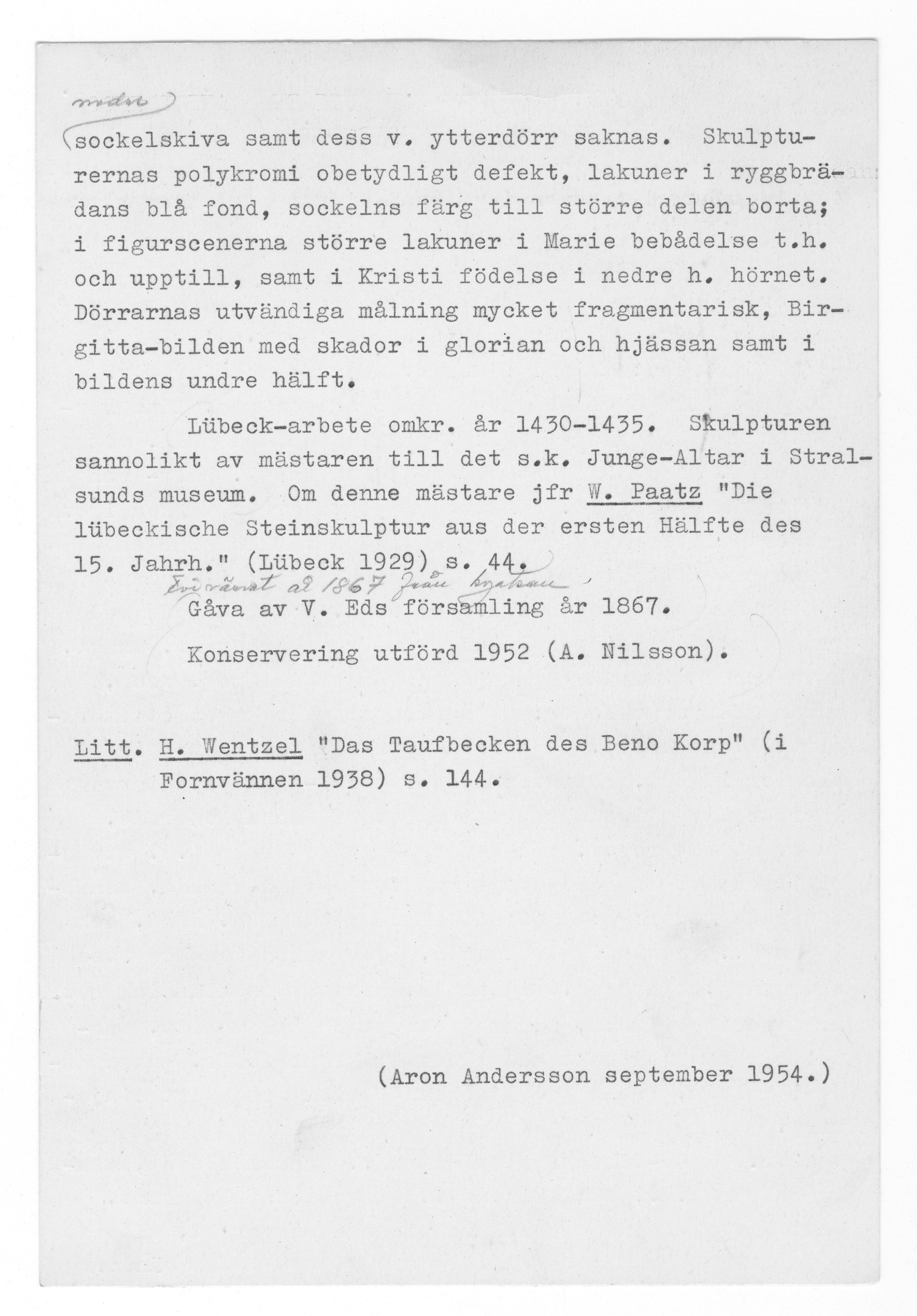 Kondition: vänstra, yttre flygeldörren förlorad, men för övrigt endast ringa bortfall. Färg: god, delar av pannåmålningarna bortfallna, men bevarade partier i god kondition.
