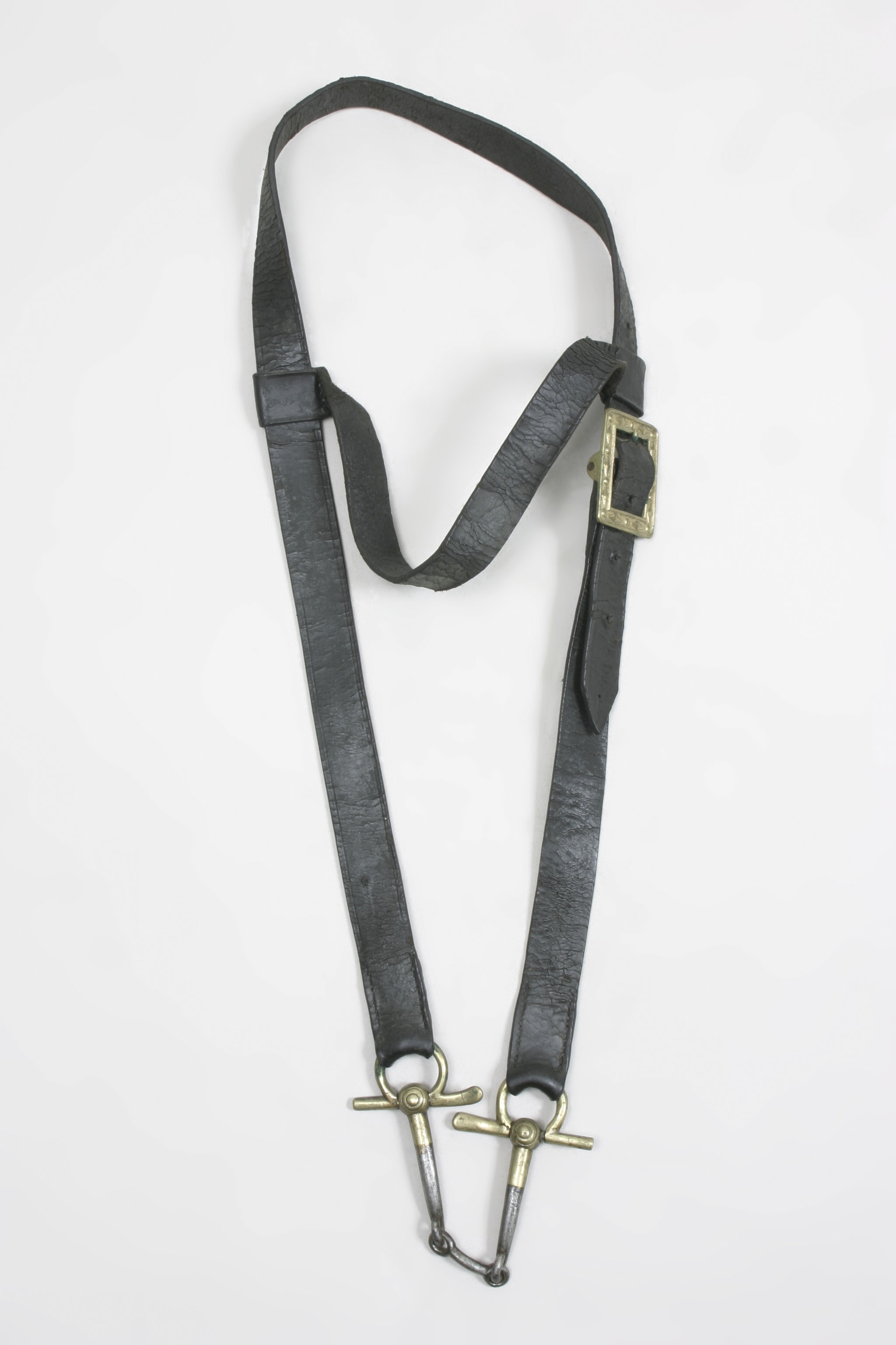 Tränsbett i tre stycken av stål. Öglan för tyglarna samt ett stycke in på bettet är förgyllt. Resten är förtent. På ledkulan vid ändarna två ingjutna cirklar i varandra. Sidostycket, övergående i nackrem med påträtt pannband. Allt av svart läder. br. 28 mm. På ena sidostycket en rektangulär, förgylld sölja med chevronger och pärlornament. Vikt: 315 g.
