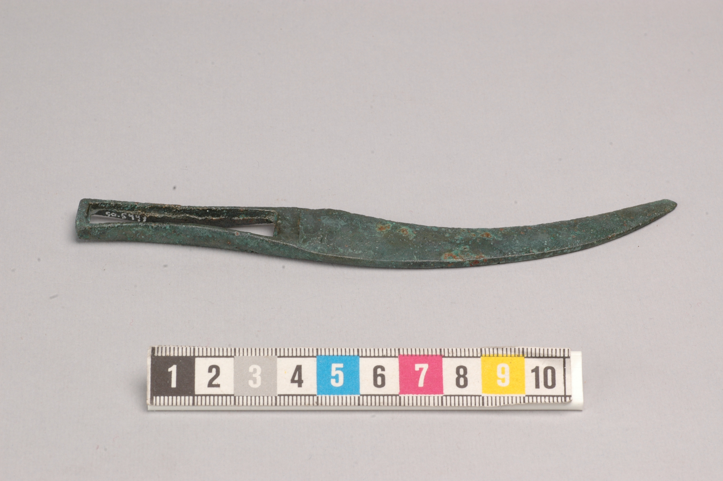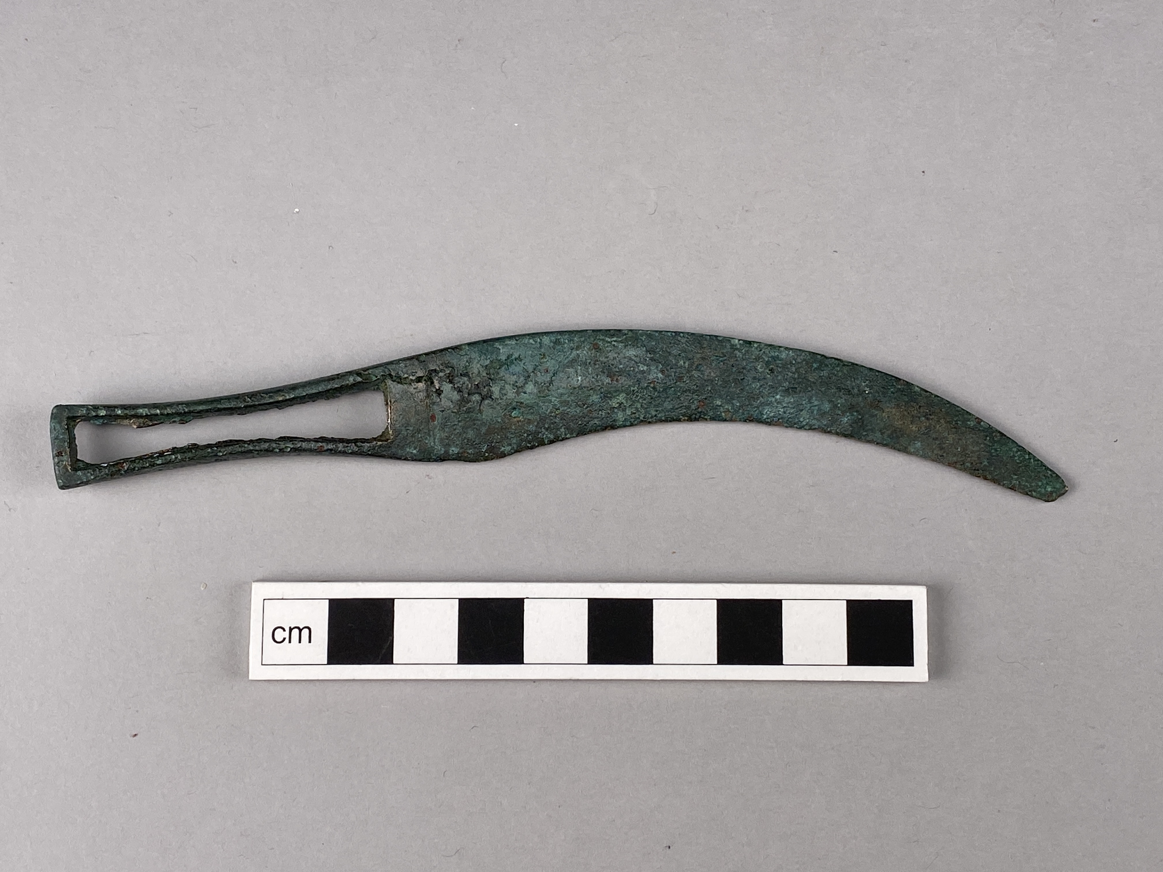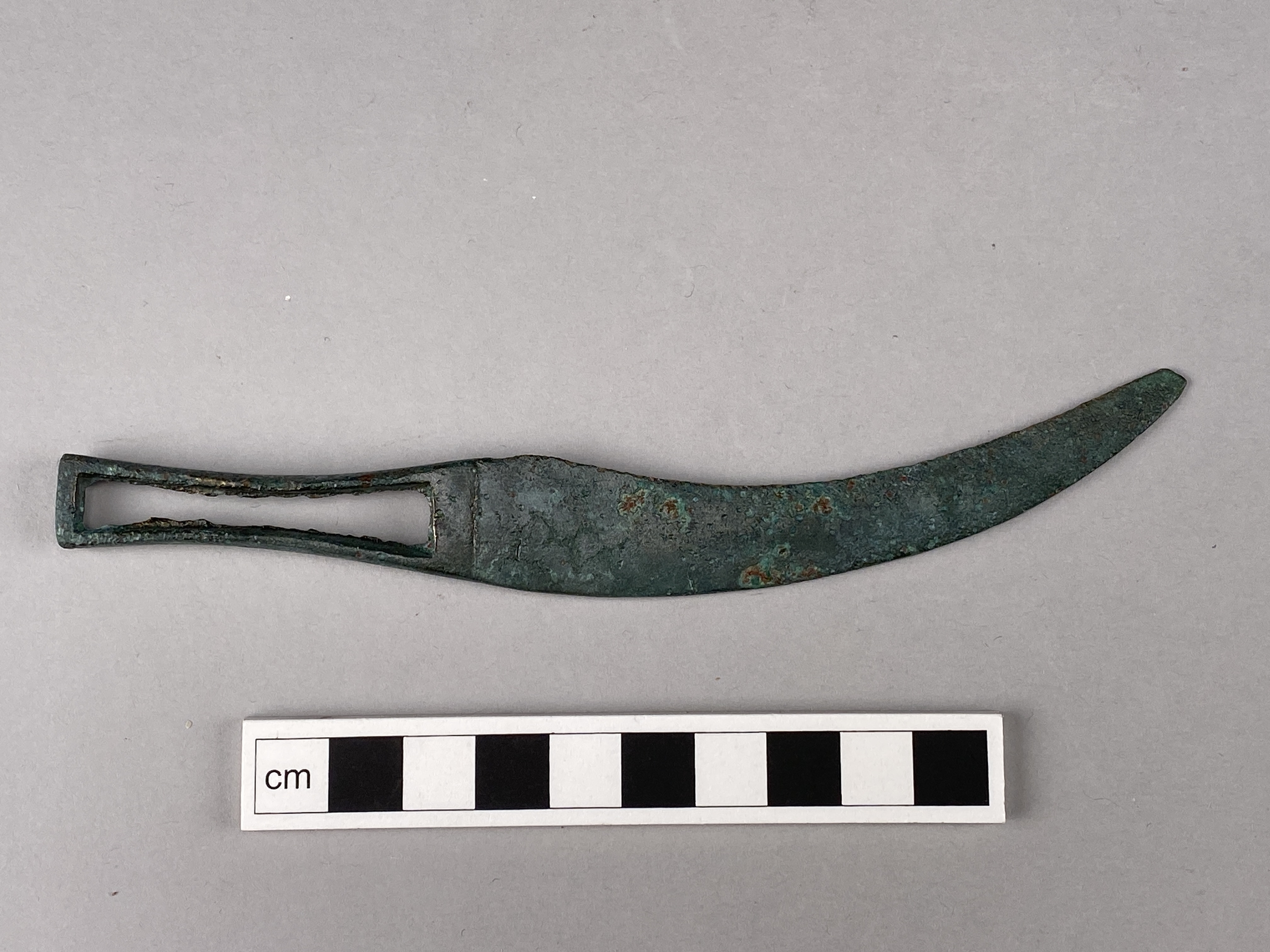 Eneggad kniv av brons med genombrutet skaft och svängt blad.
