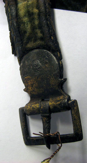 Rem av mörkbrunt läder, på ovan- och undersida klädd med ljusgrön sammet. Kanterna uppvikta och ej klädda vilket bildar mörka bårder. I kanterna tydlig söm av gul tråd. Remmen fäster i sölja på motstående sida. Söljorna av stål med rester av förgyllning. Rektangulär ram med fasade kanter och skurna linjer, fästplattan rundad med upptill två små spetsar och fäst med med prickpunsad nit.