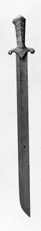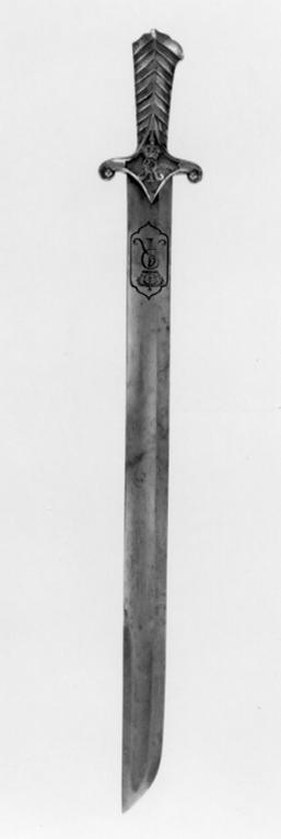 Fäste korsformigt, kraftigt, av förgyllt silver. Överdelen breddad, framtill något utdragen-, översidan runduddad, slät. Kavel med längsgående mittås, från vilken vinkelställda raka räfflor utgår, varannan räffla slät, varannan fint punsad. Kryss brett, rombiskt med insvängda sidor, på ut- och insida ett stort krönt monogram AR (Augustus Rex) mot finpunsad botten. Parerstänger korta, släta med nedåt inrullade ytterändar. Klinga rak, bred, eneggadeggsidan bakåtsvängd vid spetsen.Ryggsidan med inslipad hålkäl. På båda sidor etsat inom en 81 mm hög symmetrisk kartusch ett krönt monogram AR (Augustus Rex).
