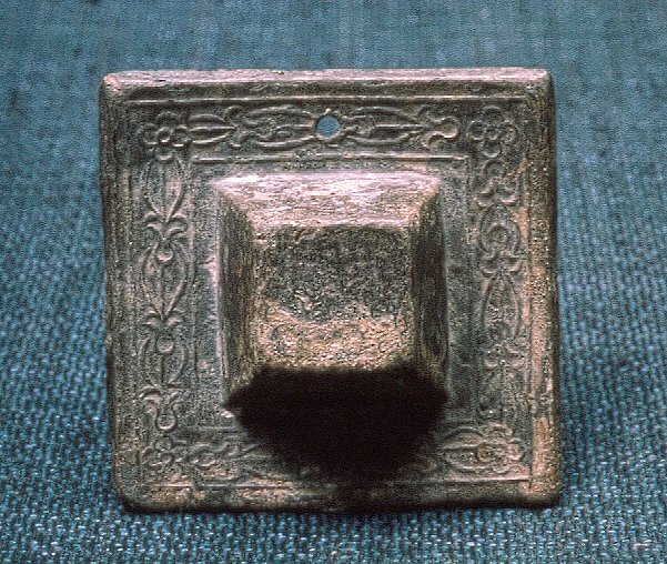 Ornamenterat tennstycke i form av en hatt med runt hål vid kanten